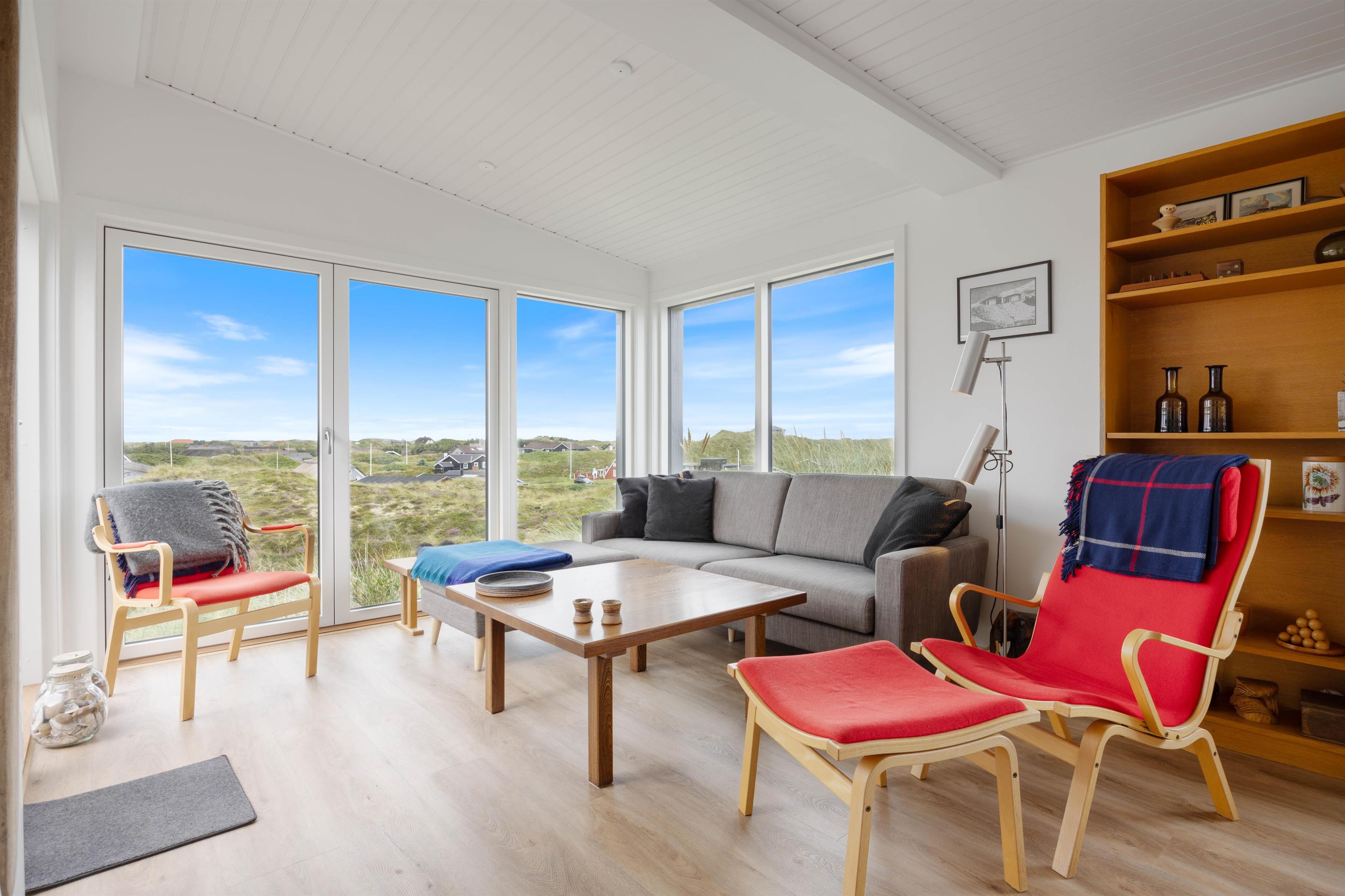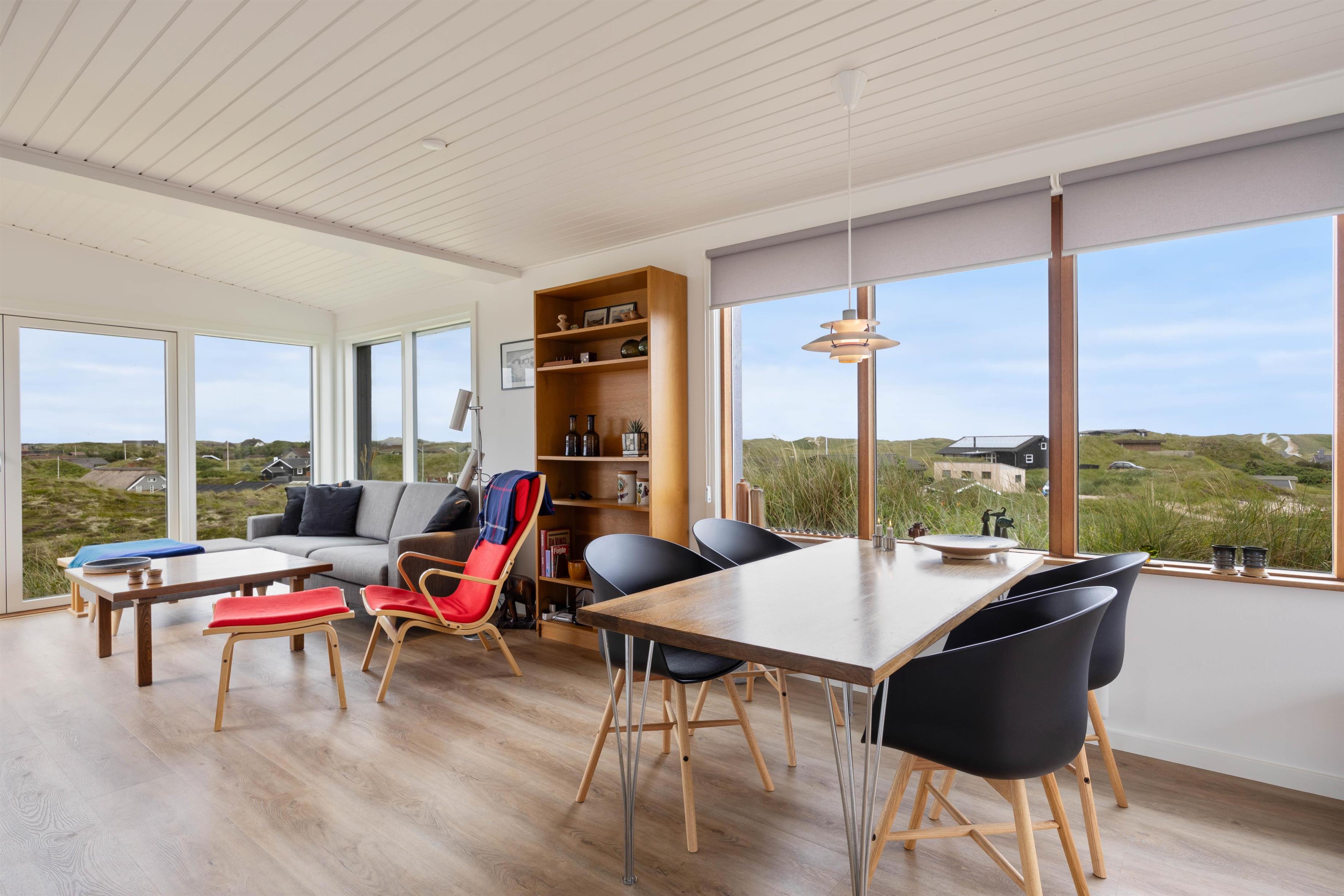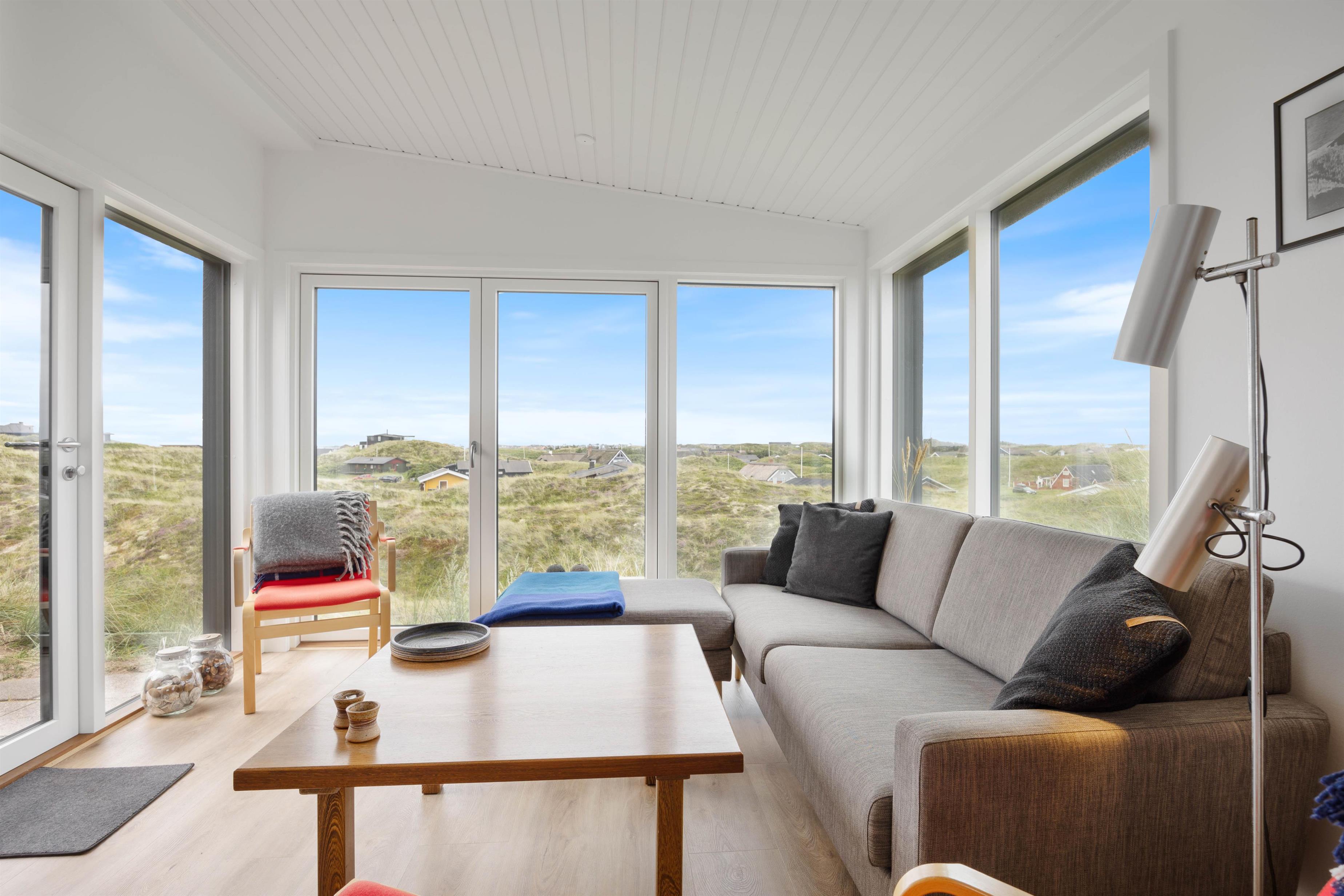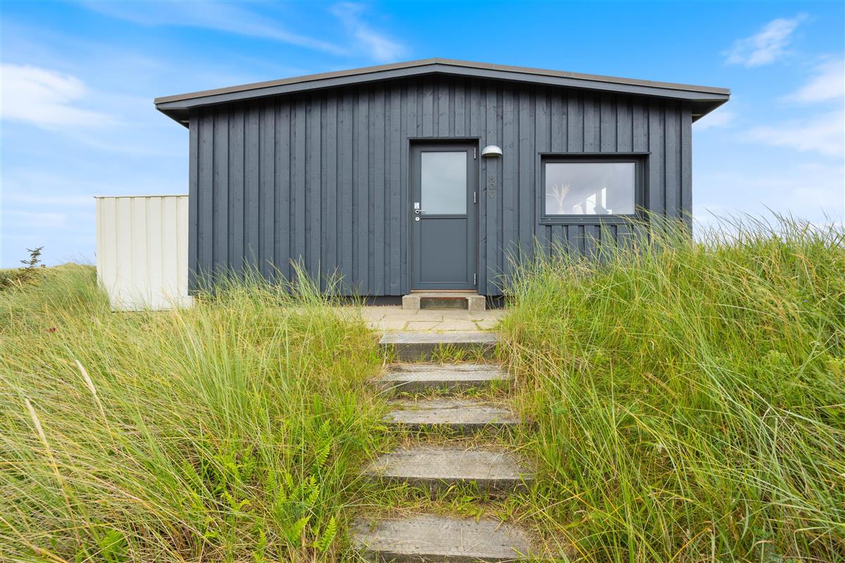 This holiday home welcomes you in the heart of the Houvig dunes. Floor-to-ceiling windows create a bright, welcoming atmosphere, making the 48-square-metre living space feel generous and offering an open, friendly living concept. The large windows provide impressive views over Houvig's beautiful landscape. Thanks to the open-plan design, you can remain part of family life while cooking, and meal preparation becomes a pleasure in the well-equipped kitchen. Enjoy your culinary creations at the comfortable dining table before settling down with a glass of wine by the cosy wood-burning stove.