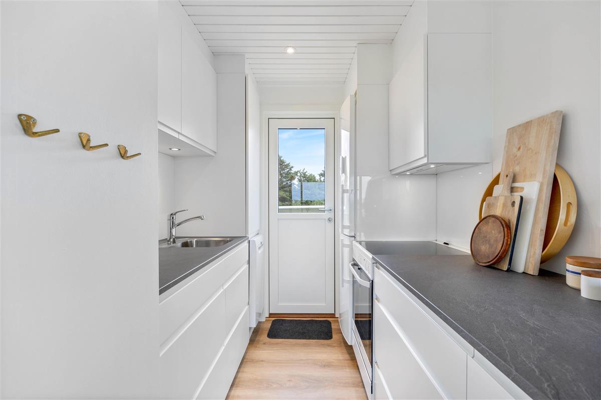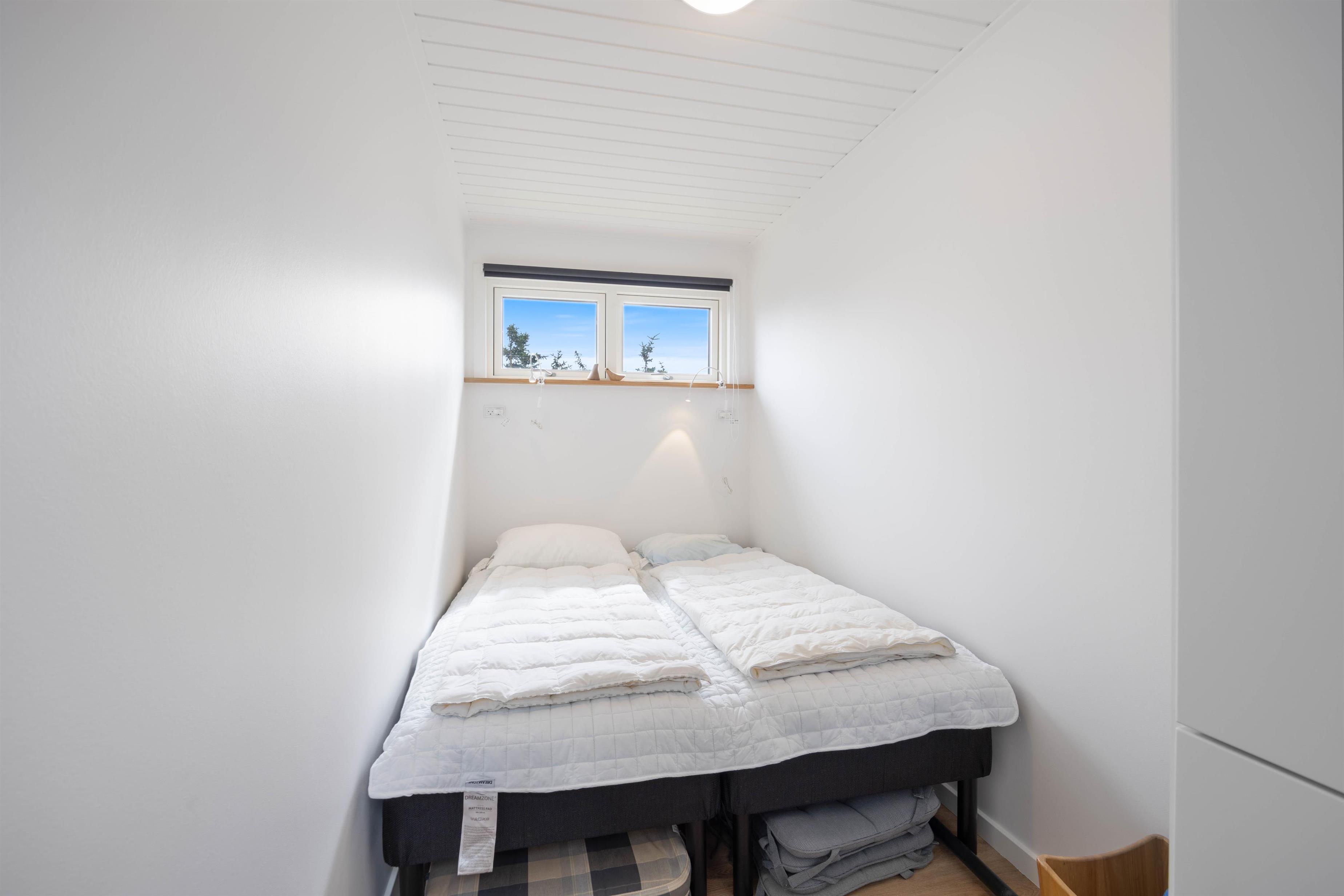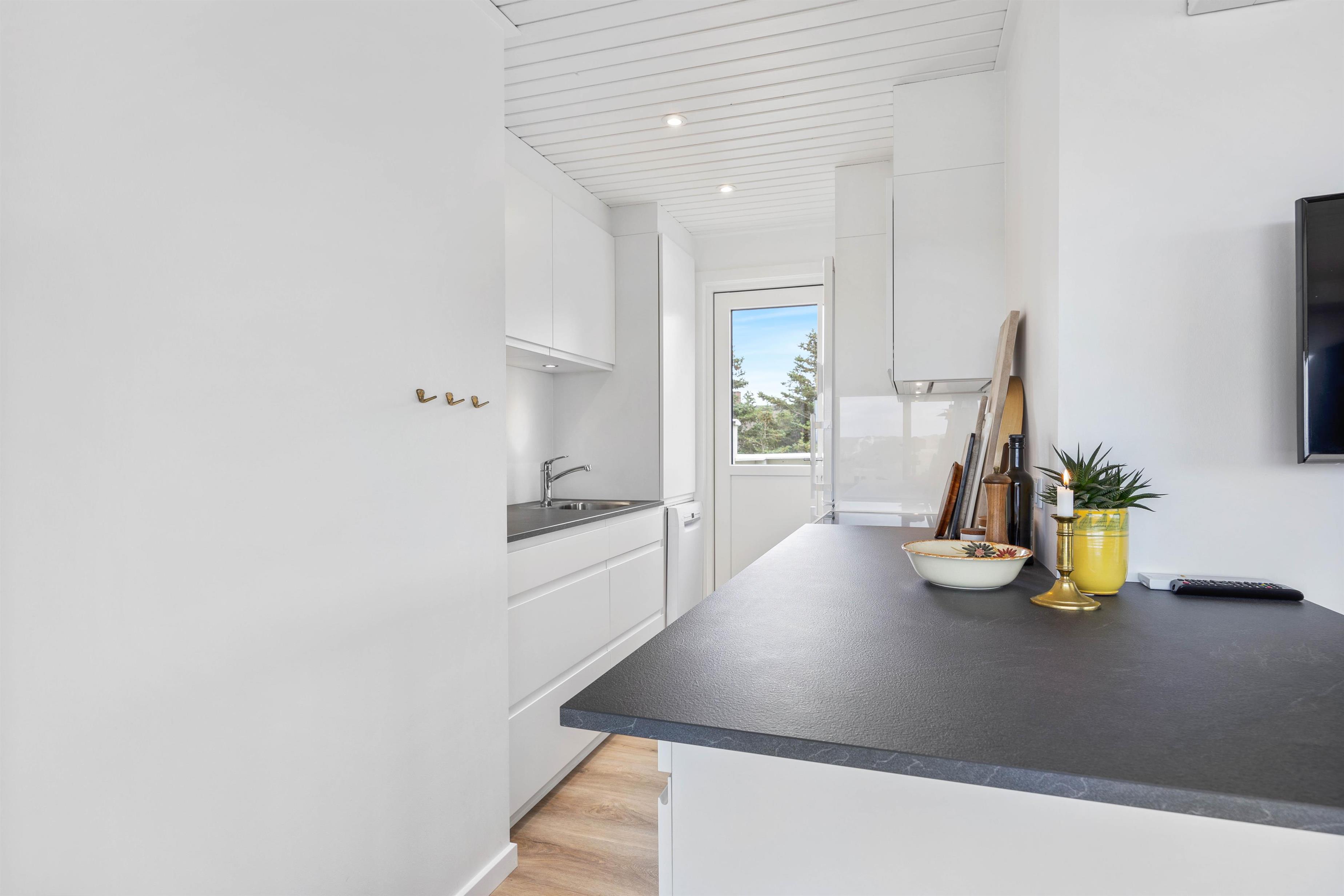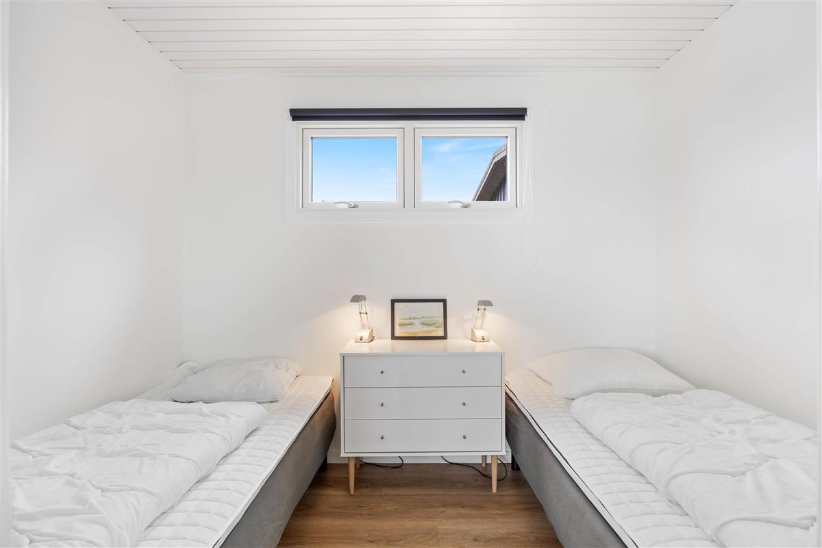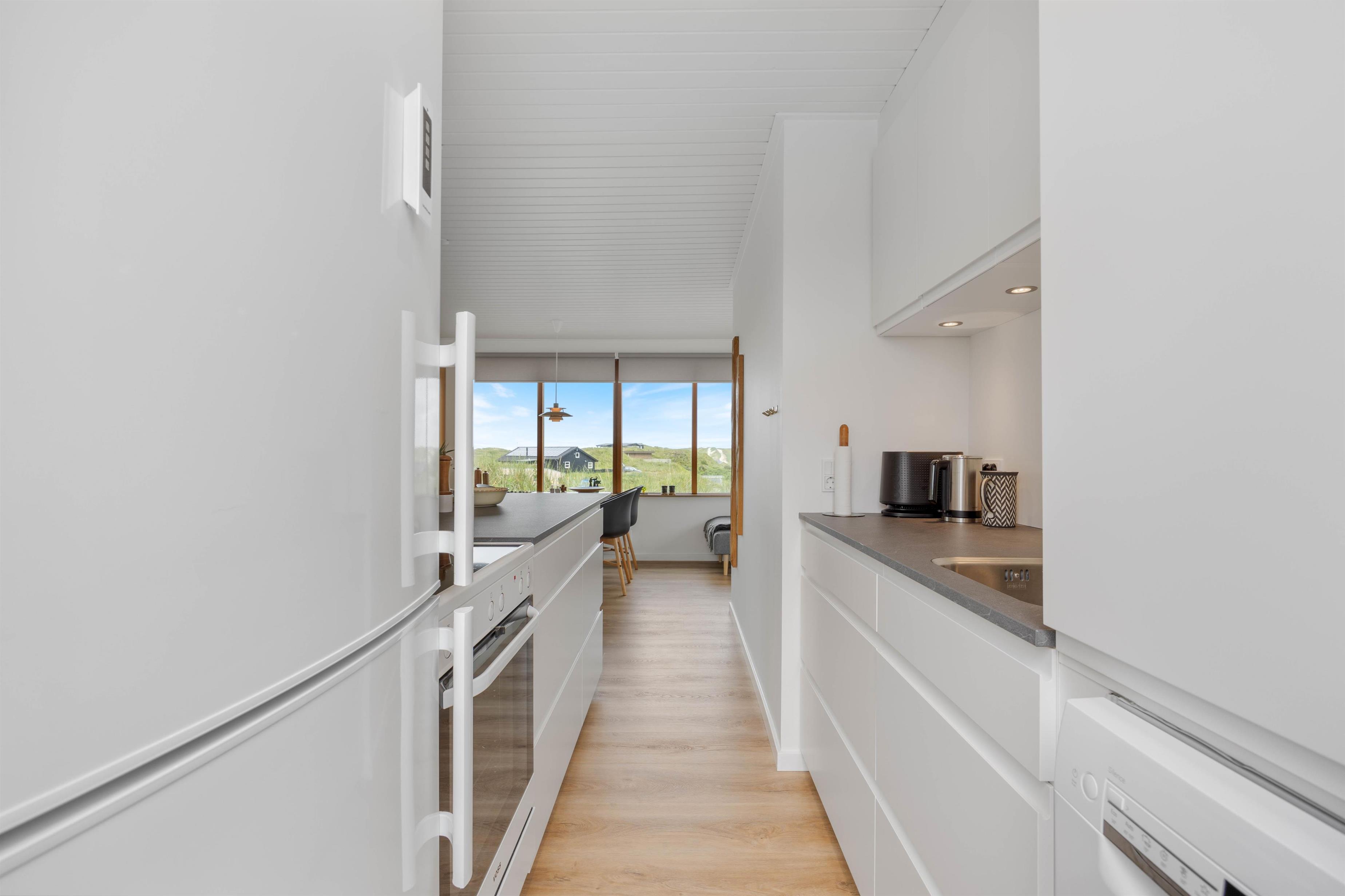 This holiday home welcomes you in the heart of the Houvig dunes. Floor-to-ceiling windows create a bright, welcoming atmosphere, making the 48-square-metre living space feel generous and offering an open, friendly living concept. The large windows provide impressive views over Houvig's beautiful landscape. Thanks to the open-plan design, you can remain part of family life while cooking, and meal preparation becomes a pleasure in the well-equipped kitchen. Enjoy your culinary creations at the comfortable dining table before settling down with a glass of wine by the cosy wood-burning stove.