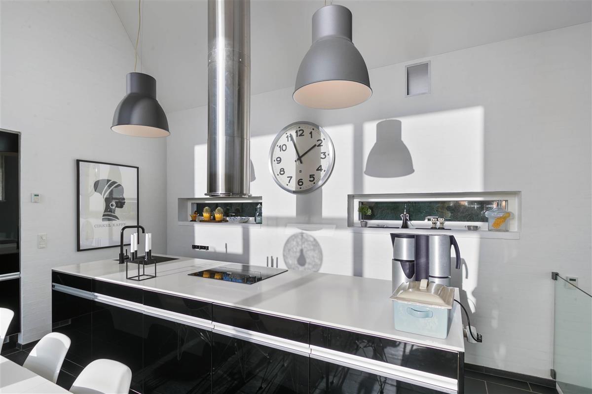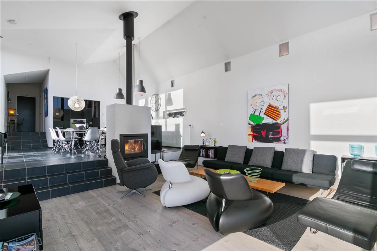 The sunken living area with designer furniture invites you to relax in front of the wood-burning stove or Smart TV. Thanks to the open-plan kitchen, you can remain part of family life while cooking.