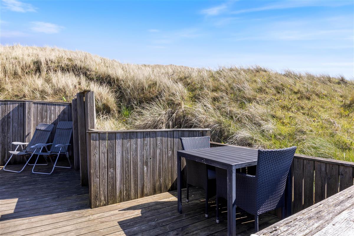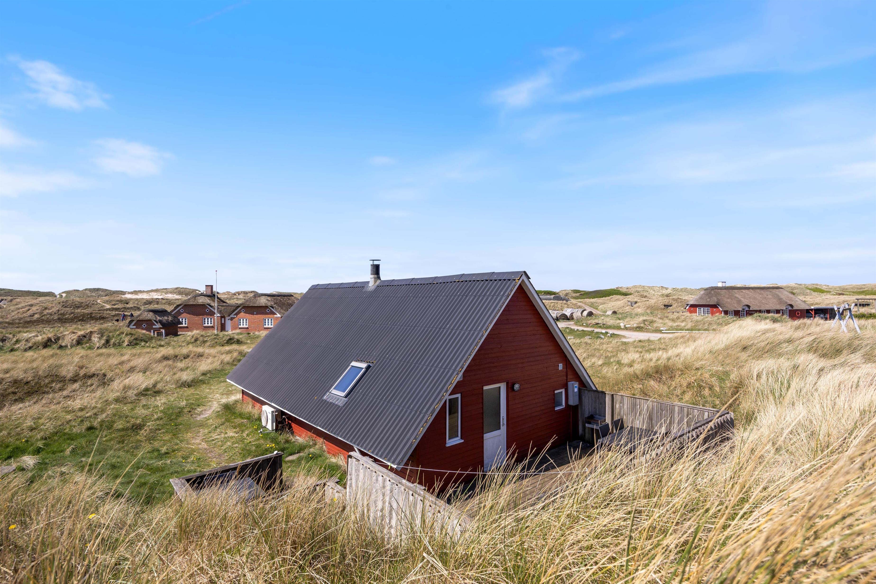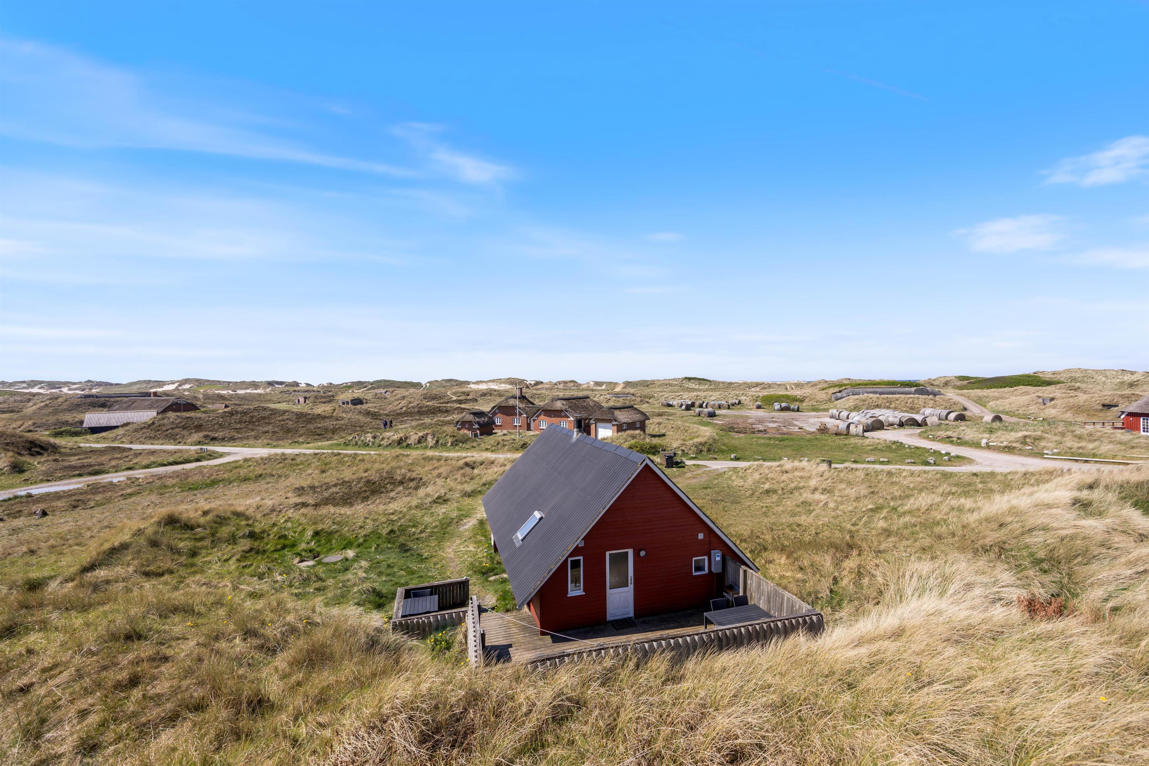 This charming red wooden holiday home sits like a small, colourful mound in the heathland, in an unspoilt location beside the first row of dunes in Houvig. The holiday home features a delightful terrace that blends almost seamlessly into the surrounding landscape of grasses and marram grass.