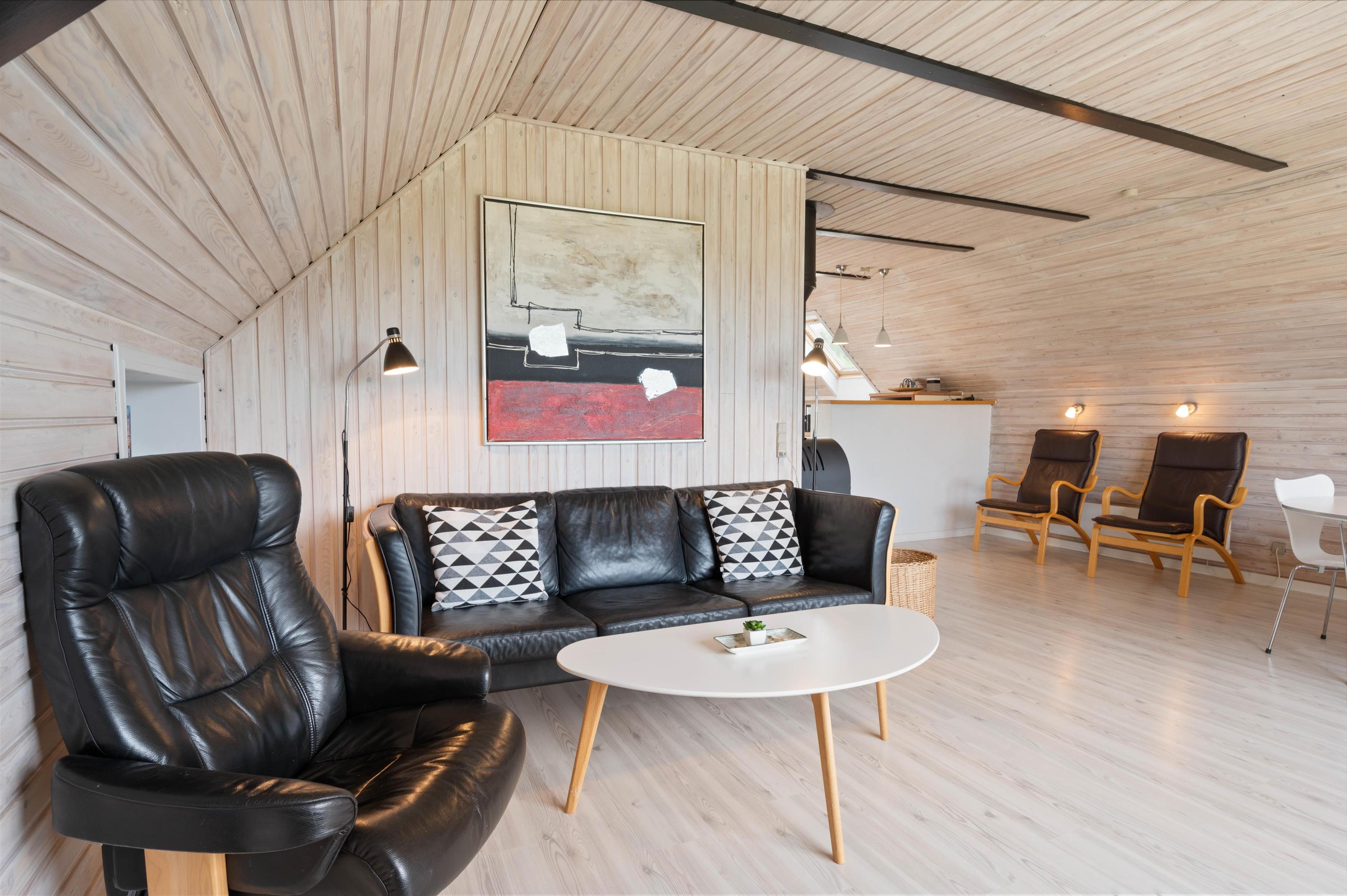 The heart of the house is undoubtedly the beautiful living area, where the kitchen, dining area and living room flow seamlessly together. The living area is perfect for relaxation, furnished with quality, comfortable furniture, TV, radio, DVD and CD player. From the sofa, you can enjoy beautiful views through the windows, or settle into one of the two seats by the wood-burning stove to enjoy its welcoming warmth and soothing crackle.