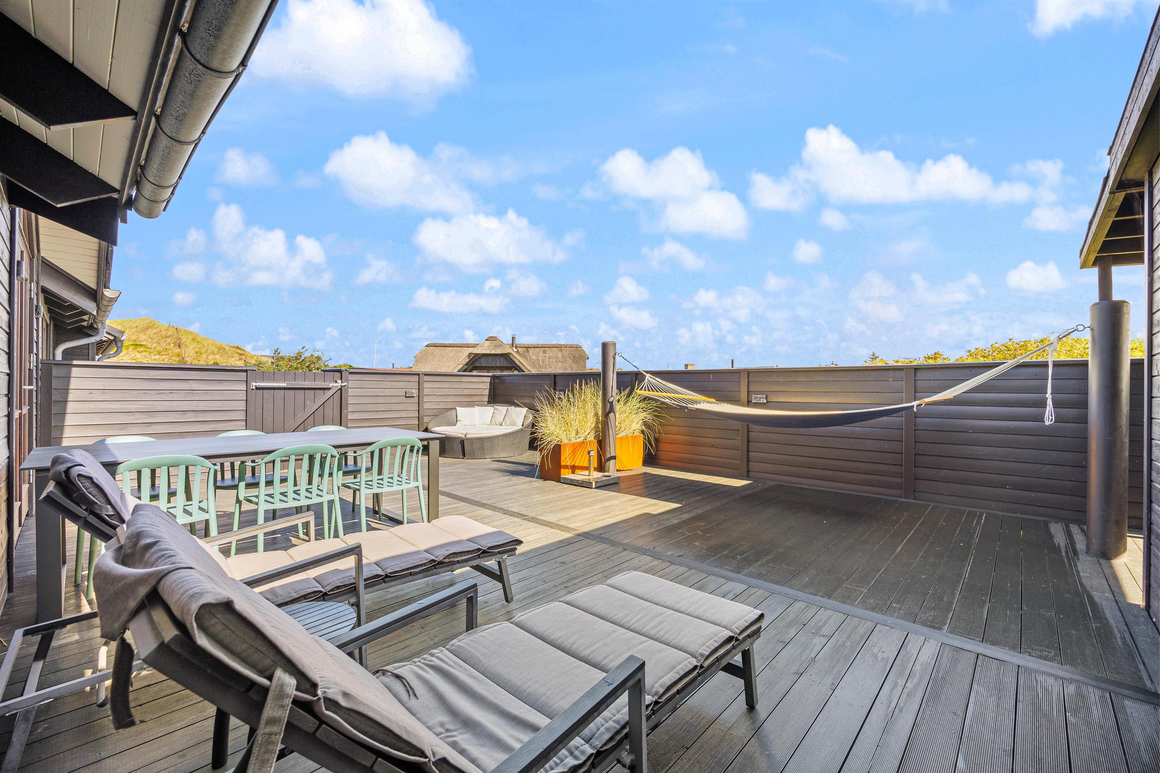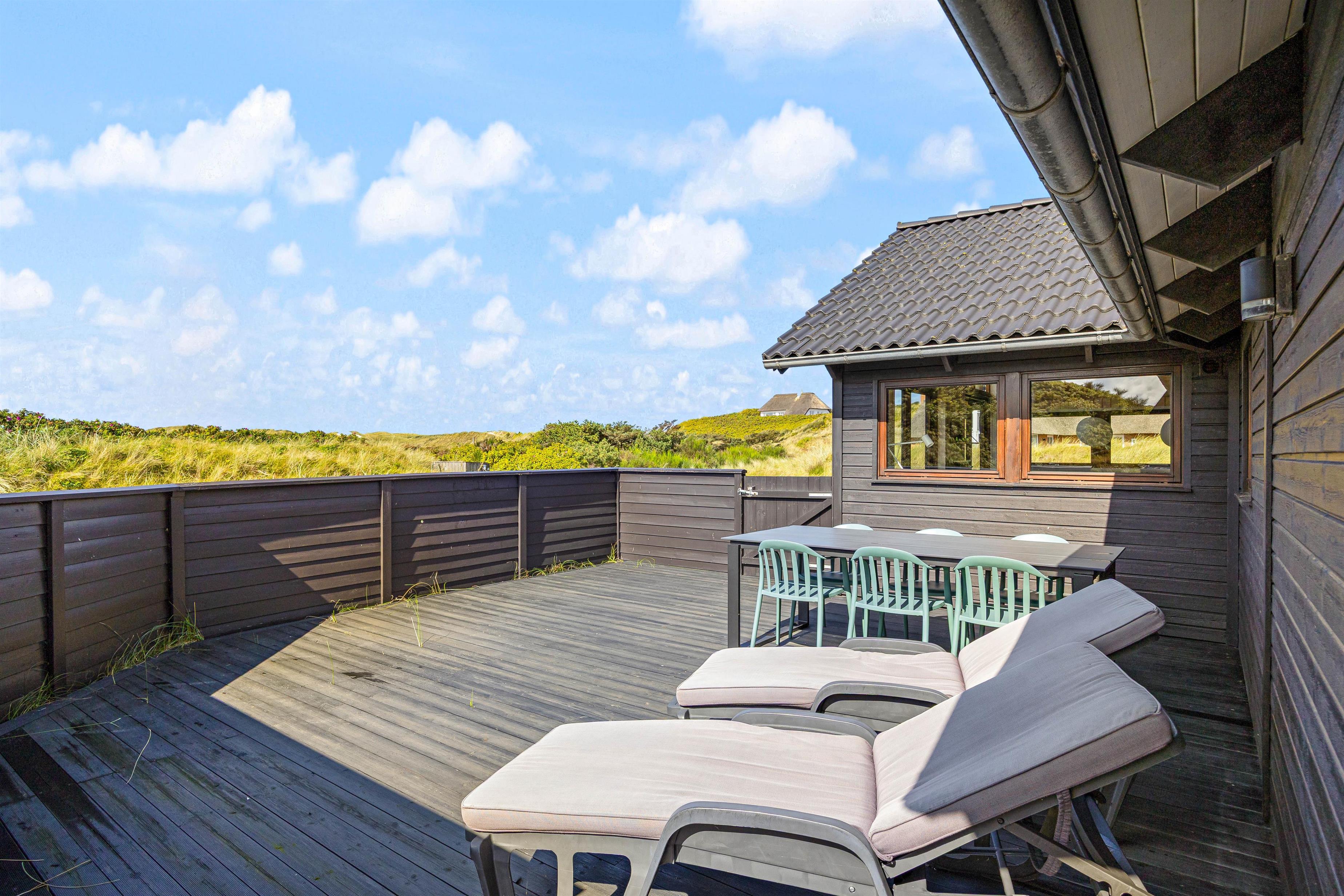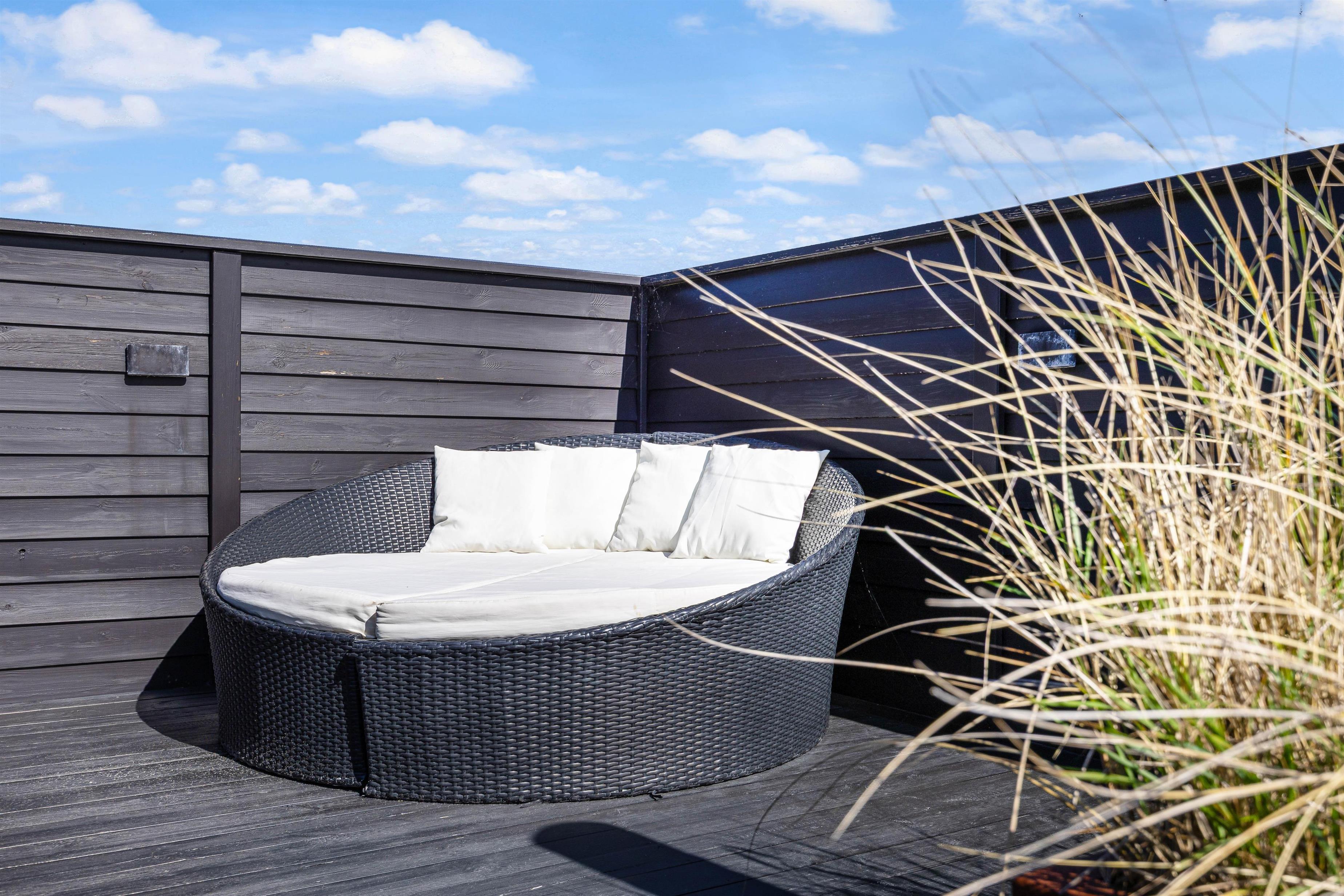 While sunbathing on the sheltered, enclosed terrace, you can hear the sea's murmur and watch snow-white seagulls against the deep blue sky. You can round off a glorious warm summer's day on the terrace with a pleasant barbecue evening, while the sun sets behind the dunes in the west, painting the sky in the most beautiful shades of red.