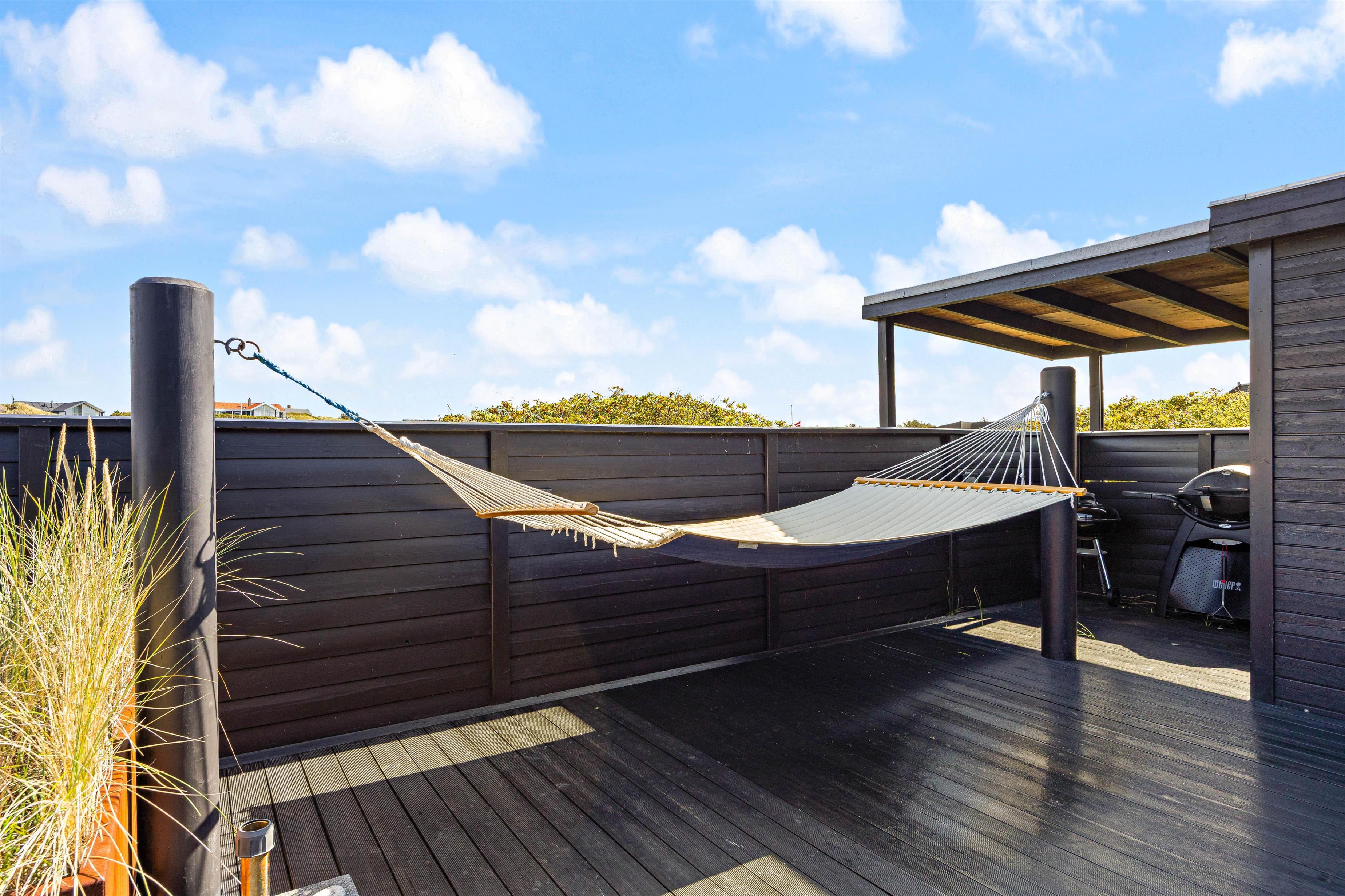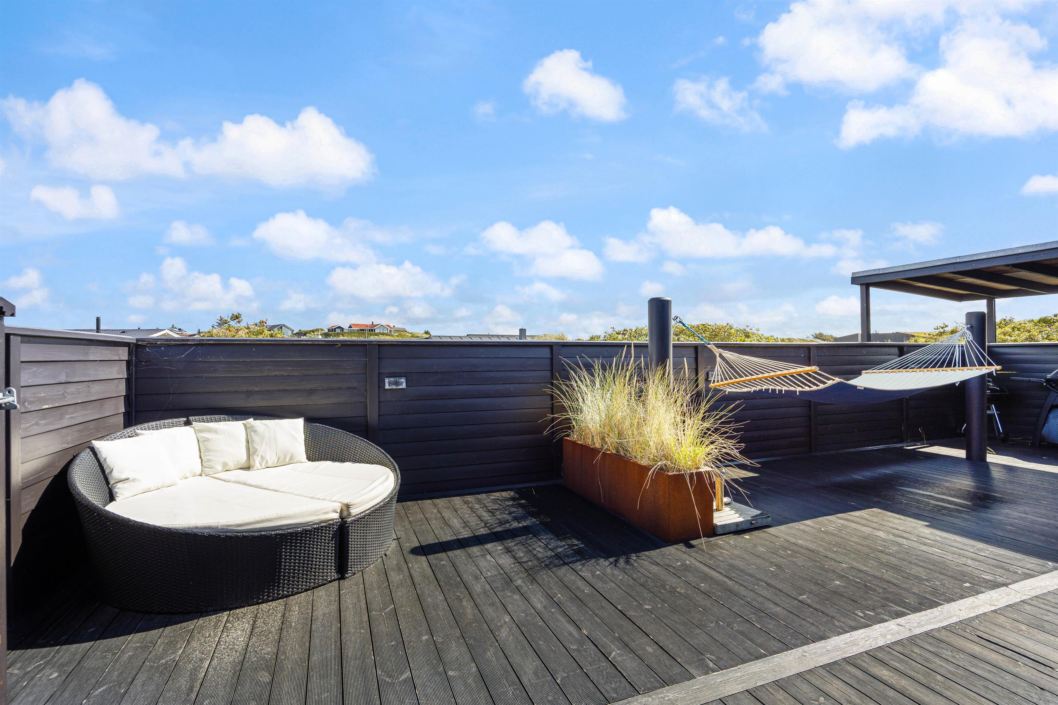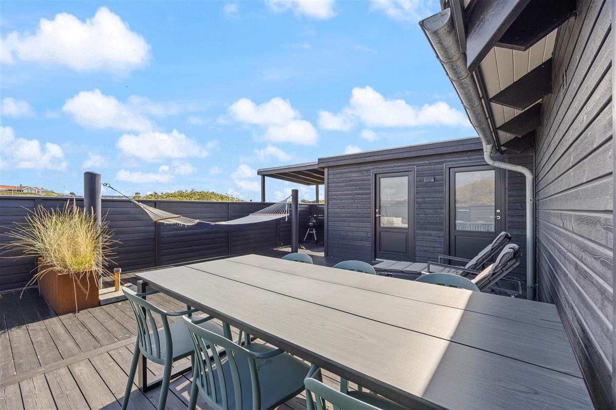 While sunbathing on the sheltered, enclosed terrace, you can hear the sea's murmur and watch snow-white seagulls against the deep blue sky. You can round off a glorious warm summer's day on the terrace with a pleasant barbecue evening, while the sun sets behind the dunes in the west, painting the sky in the most beautiful shades of red.