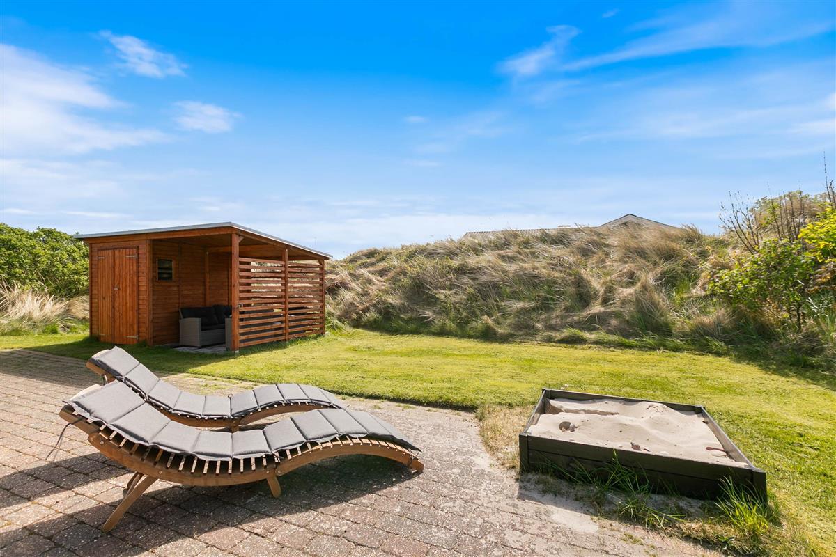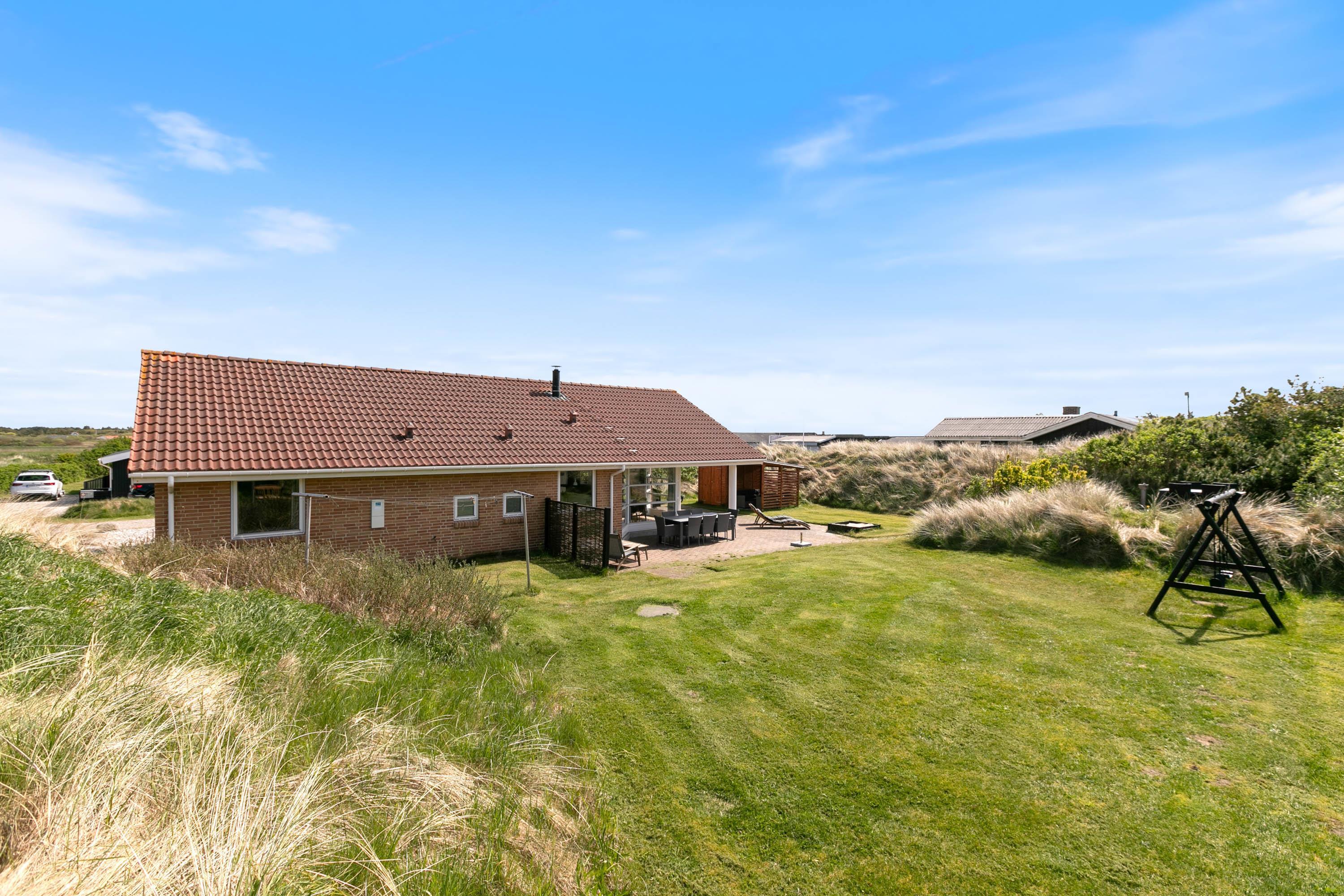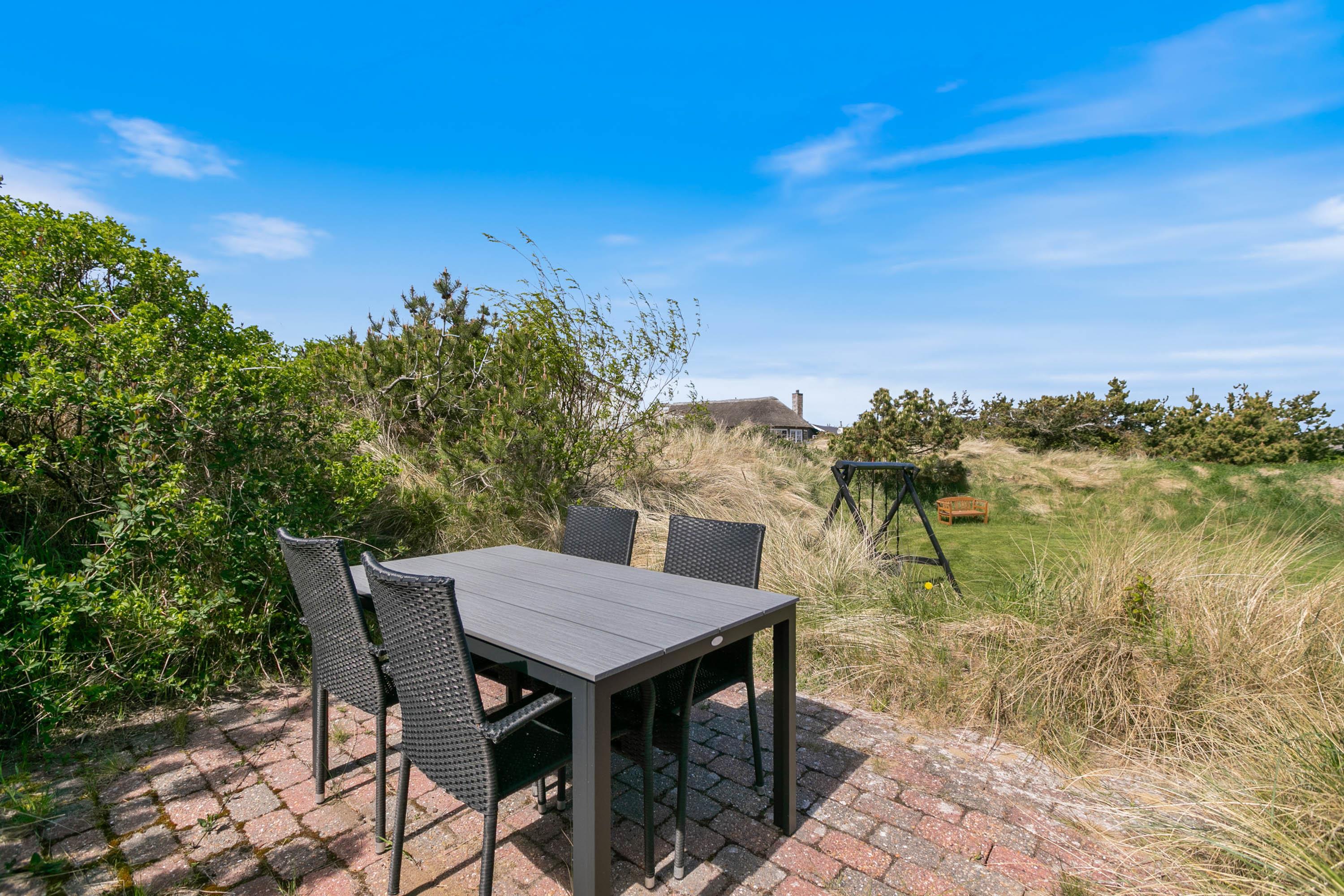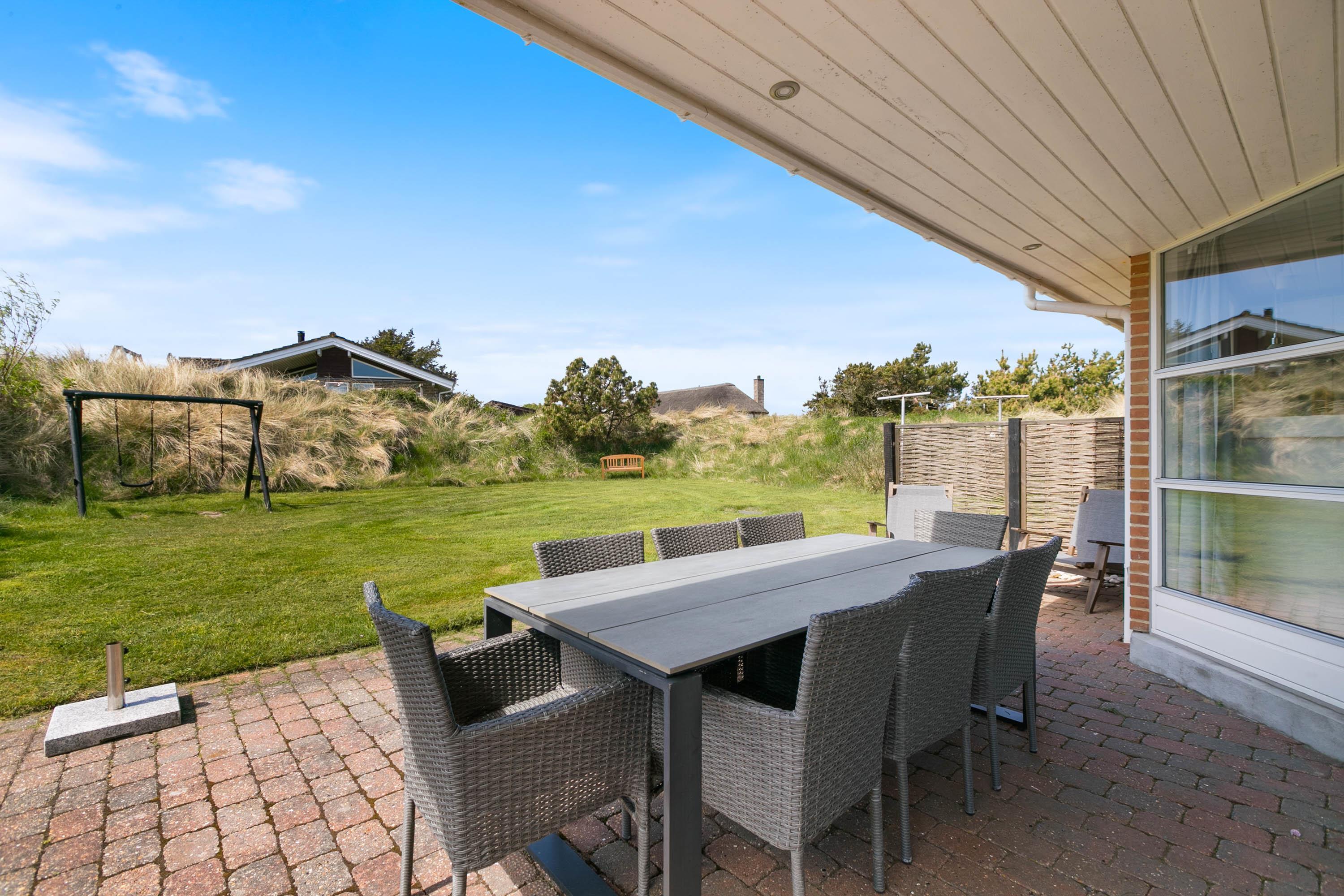 Set on a 2,000-square-metre undulating dune plot in a peaceful location, the holiday home is only 500 metres from the beach. There's a lovely lawn with plenty of space for games and fun. Multiple terraces feature garden furniture and sun loungers where adults can relax while children enjoy the sandbox and swing. You can unwind in one of many cosy outdoor spots whilst taking in the beautiful dune landscape. The covered terrace is particularly inviting.