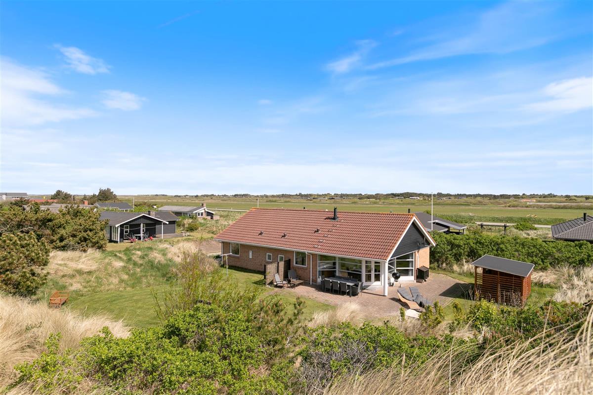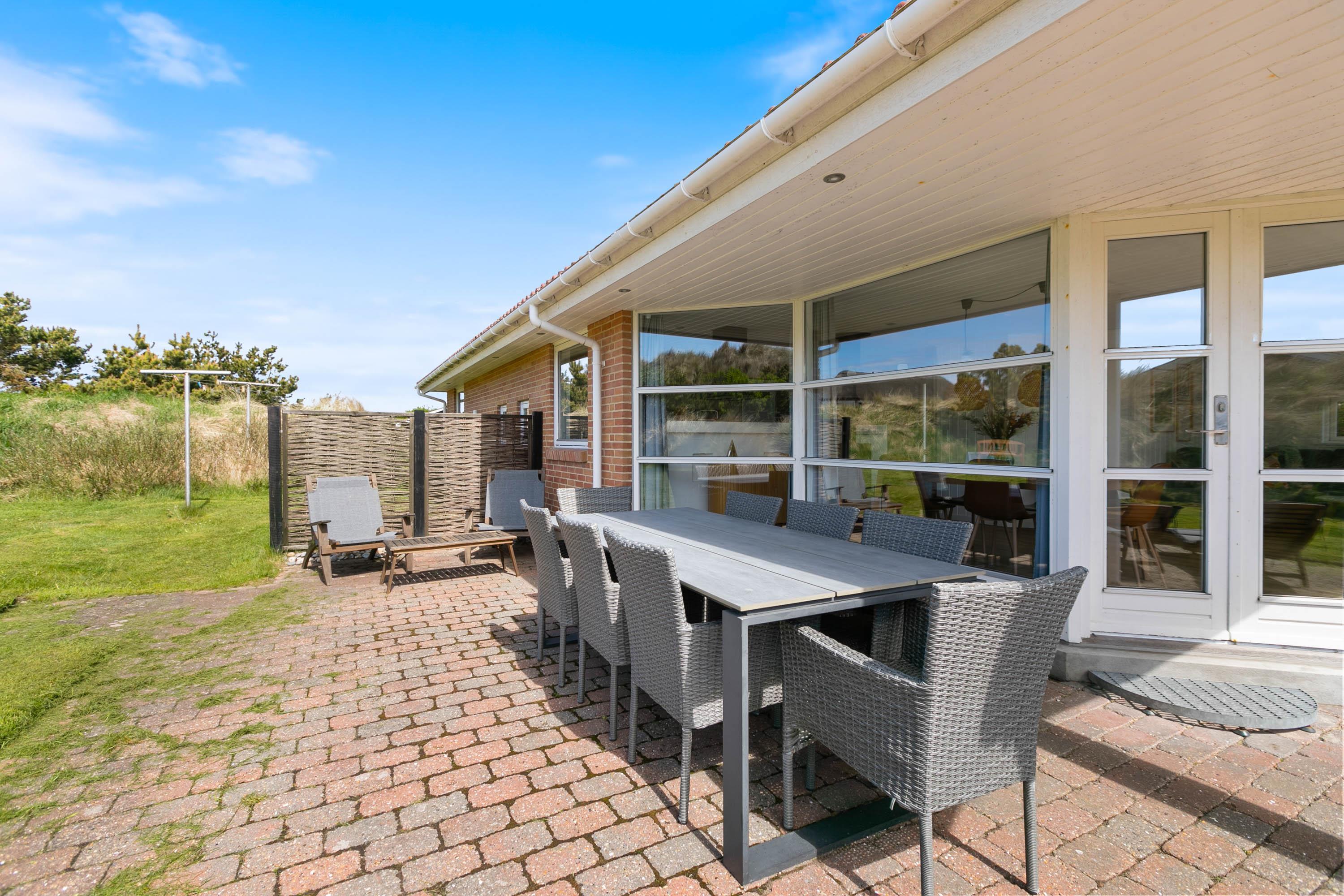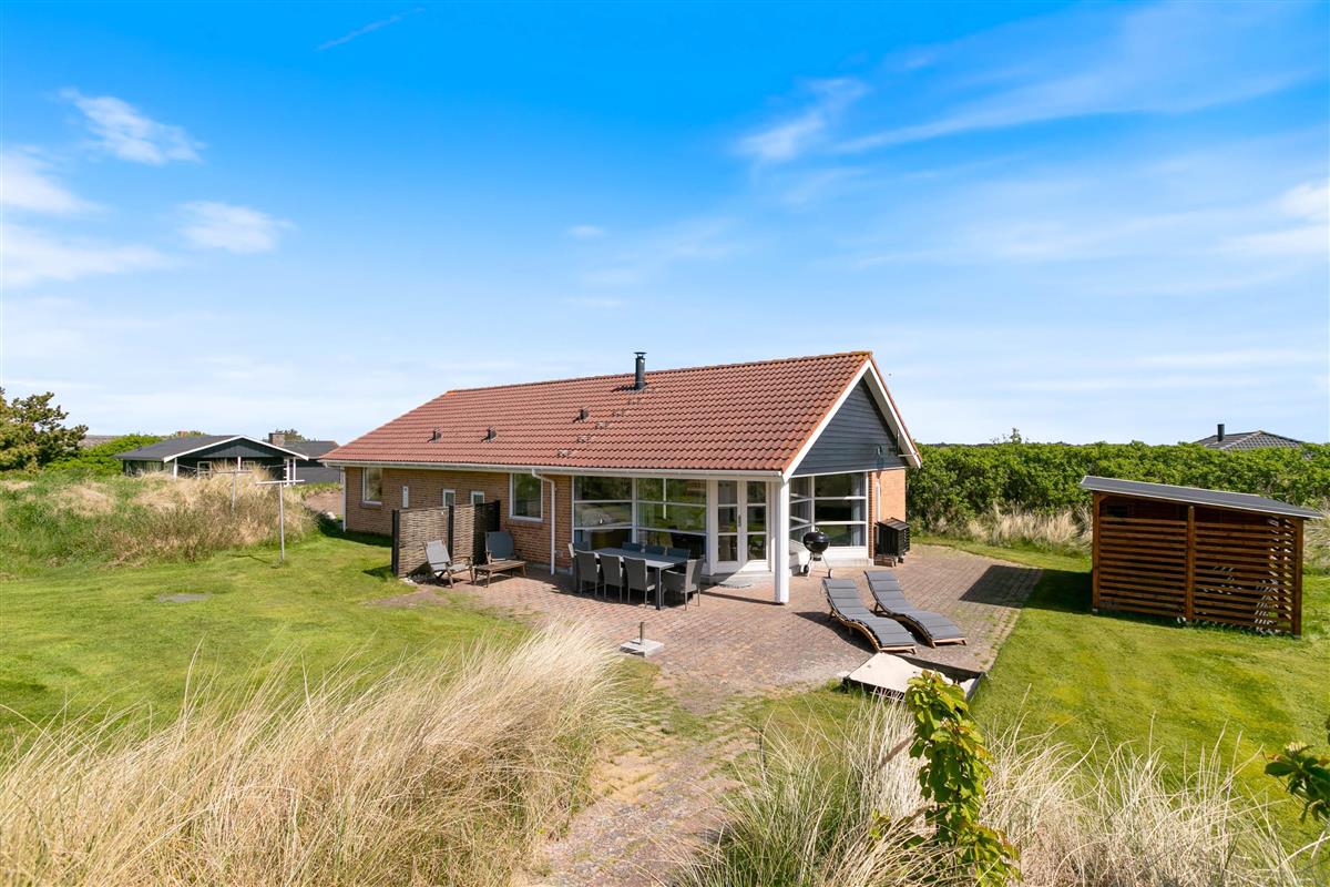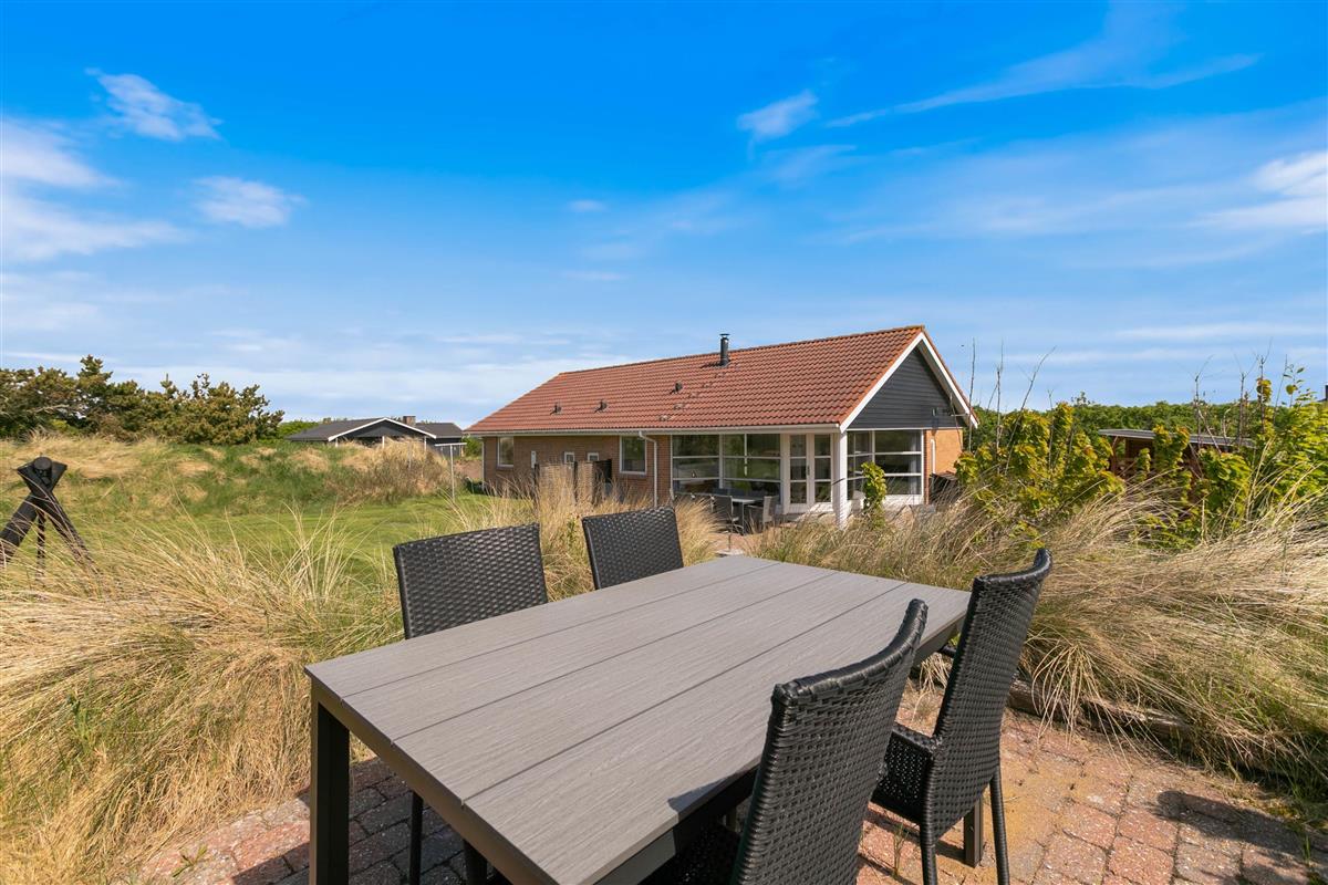 Set on a 2,000-square-metre undulating dune plot in a peaceful location, the holiday home is only 500 metres from the beach. There's a lovely lawn with plenty of space for games and fun. Multiple terraces feature garden furniture and sun loungers where adults can relax while children enjoy the sandbox and swing. You can unwind in one of many cosy outdoor spots whilst taking in the beautiful dune landscape. The covered terrace is particularly inviting.