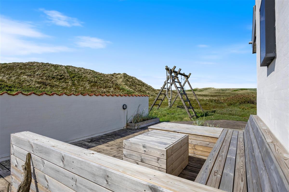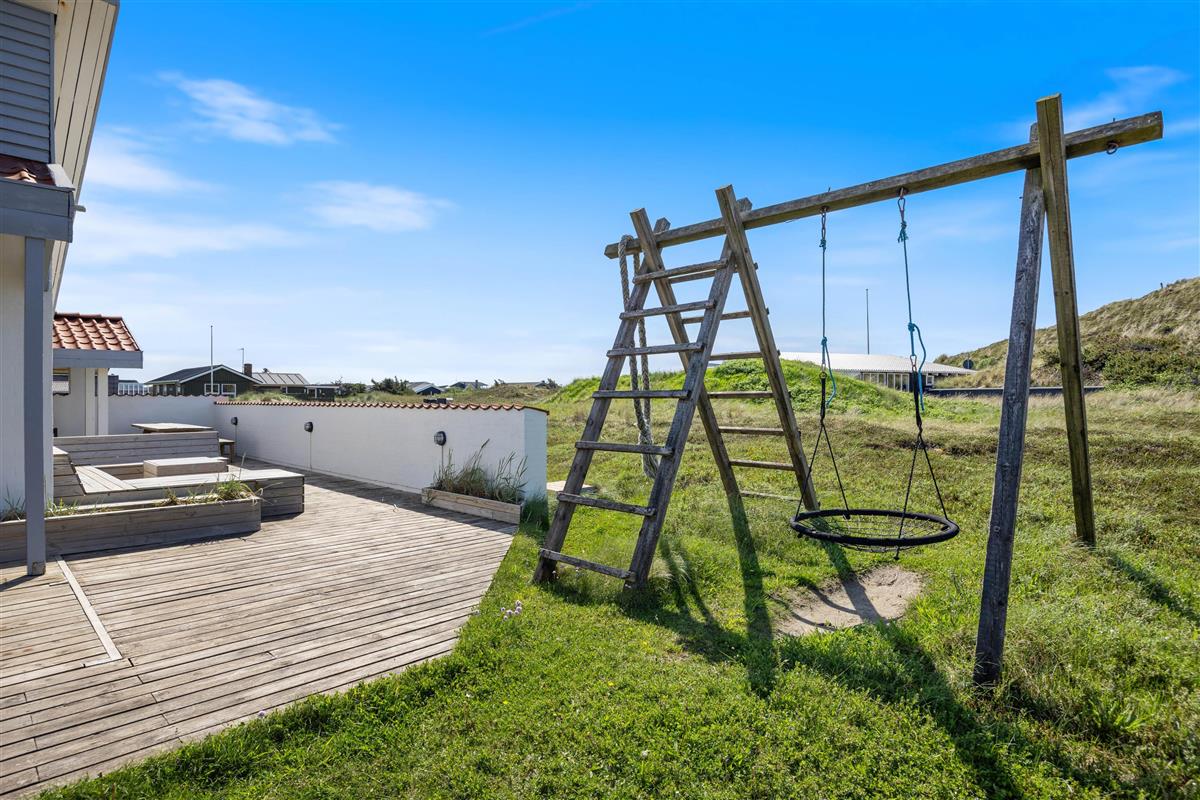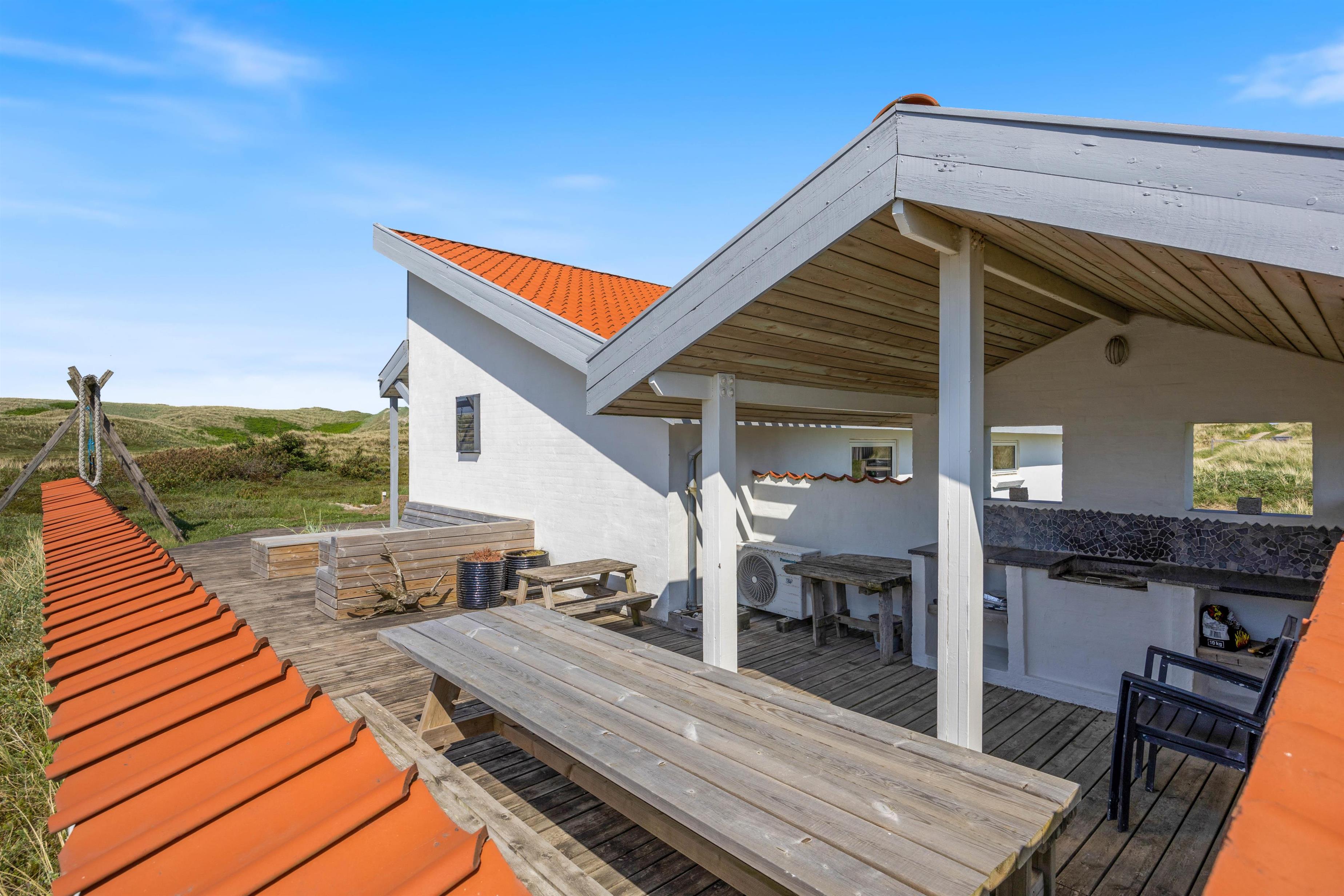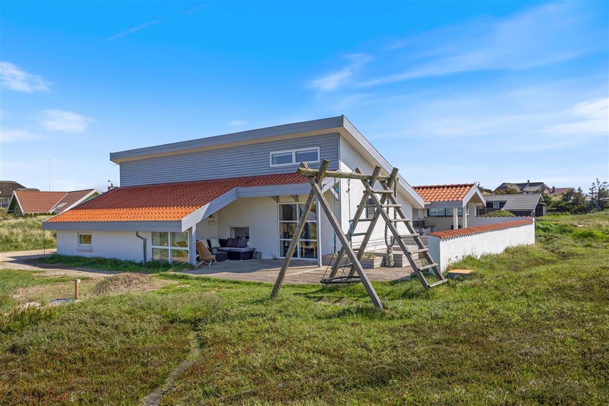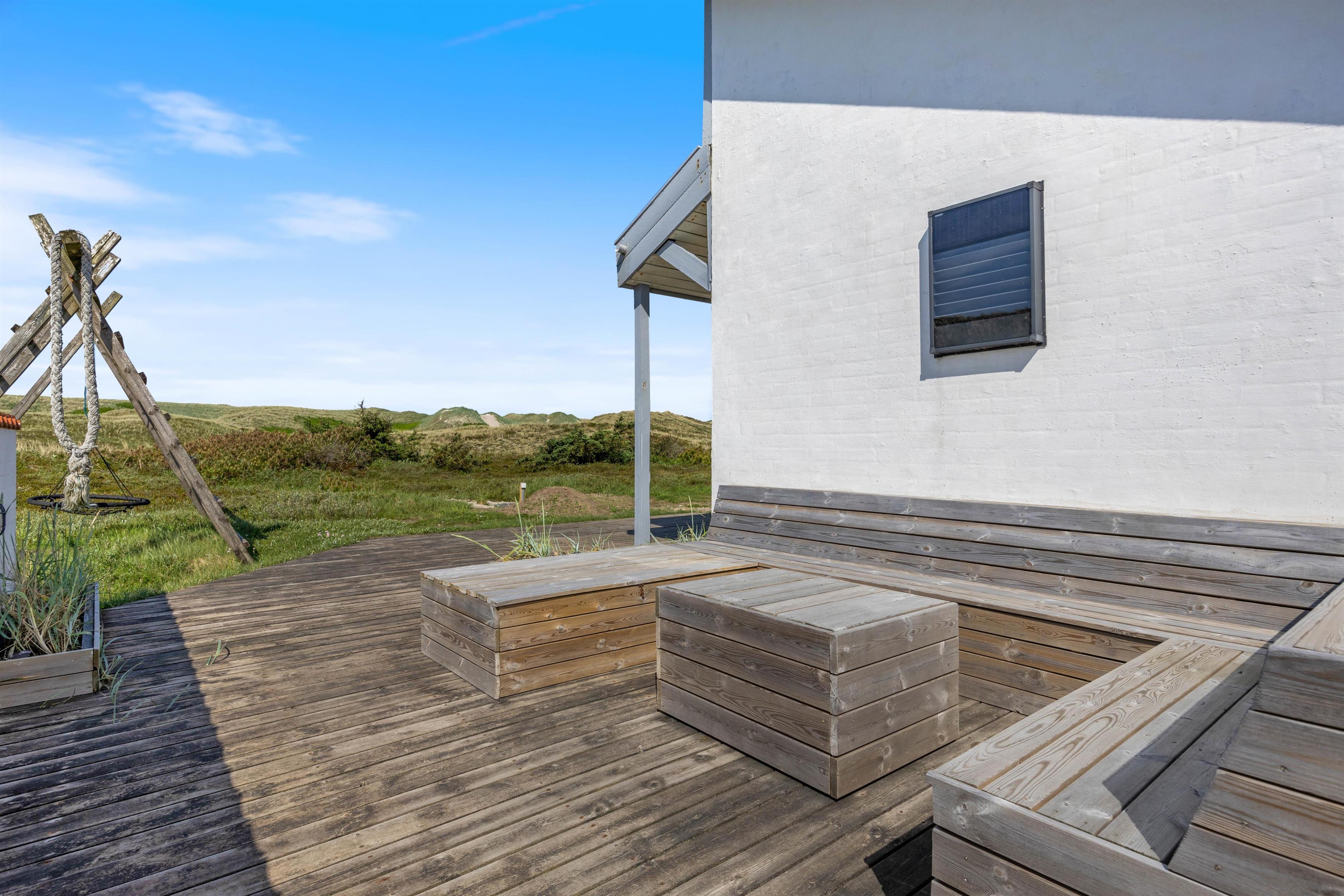 The holiday home at Mågedalen 77 in Houvig sits on approximately 2,500 square metres of dune grounds, offering children plenty of space for exploration. The holiday home features extensive terrace areas, including two covered sections, ensuring everyone can find their favourite spot. While you relax with a good book in the sun, your children can enjoy themselves on the swing. In the evening, you can round off a warm summer's day with a delicious barbecue.