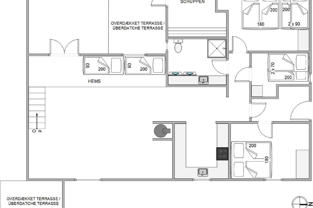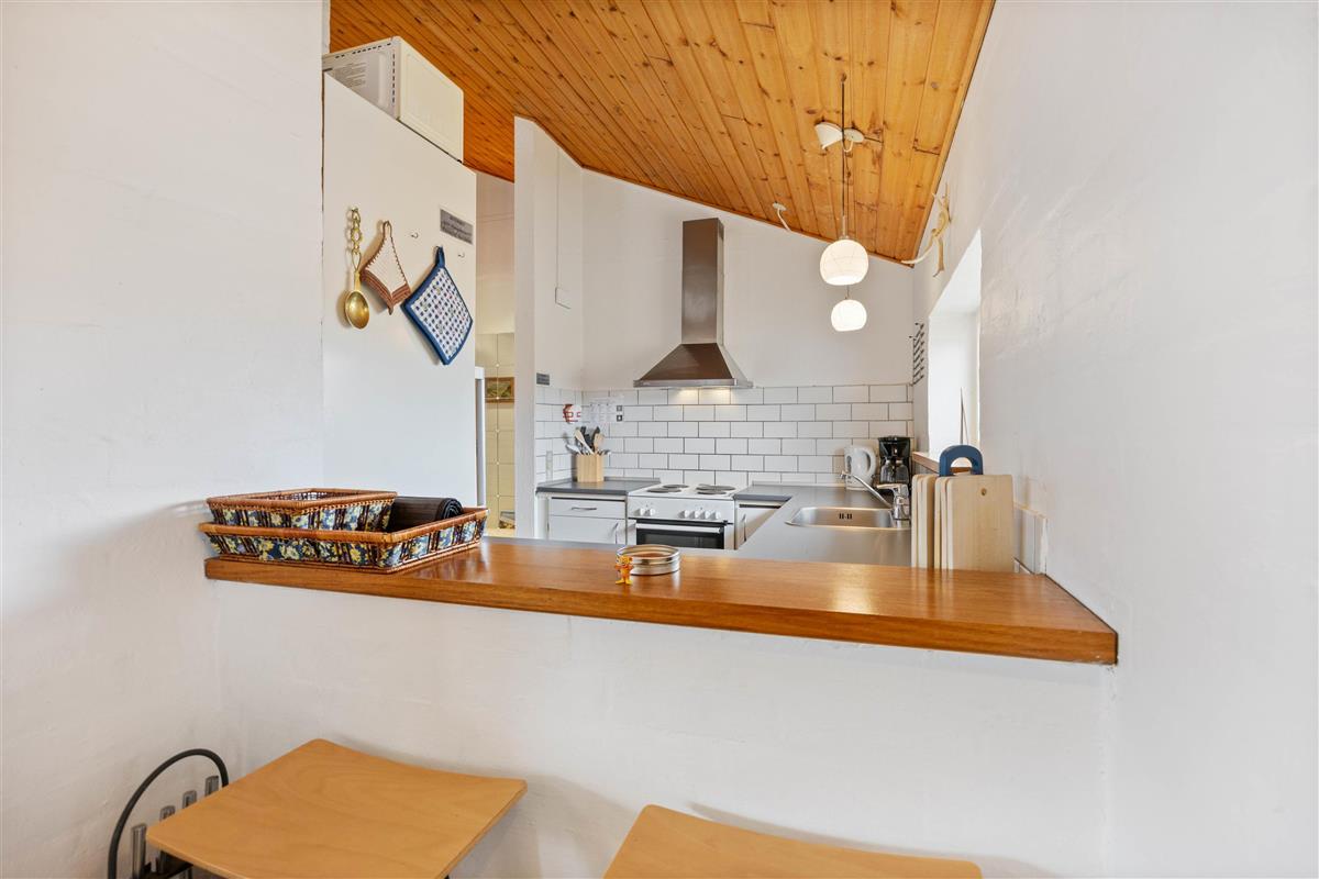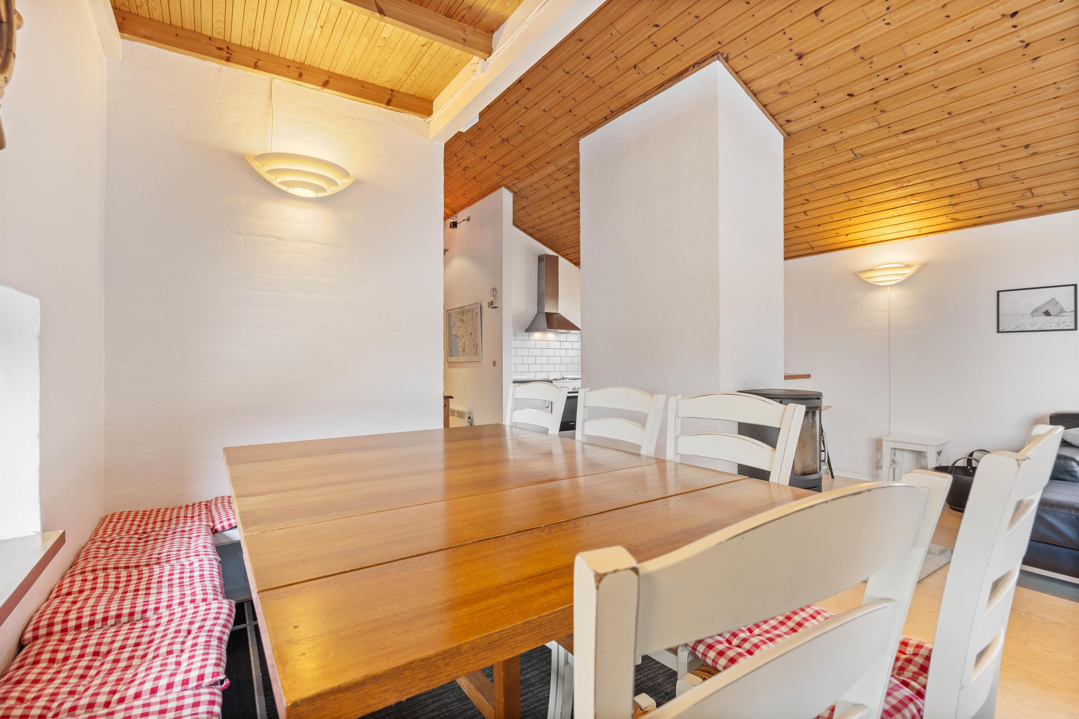 The holiday home welcomes you with its characteristic atmosphere, featuring white walls and wood-panelled ceiling, making you feel at home straight away. The holiday home spans approximately 120 square metres and comfortably accommodates up to 8 people. The spacious living area will certainly be the heart of your holiday, combining kitchen, living room and dining area. Here you can plan your next day's activities or enjoy wonderful games evenings. The wood-burning stove provides a cosy atmosphere with its warming glow and crackling fire. An energy-efficient air-source heat pump ensures consistently comfortable temperatures throughout the holiday home.