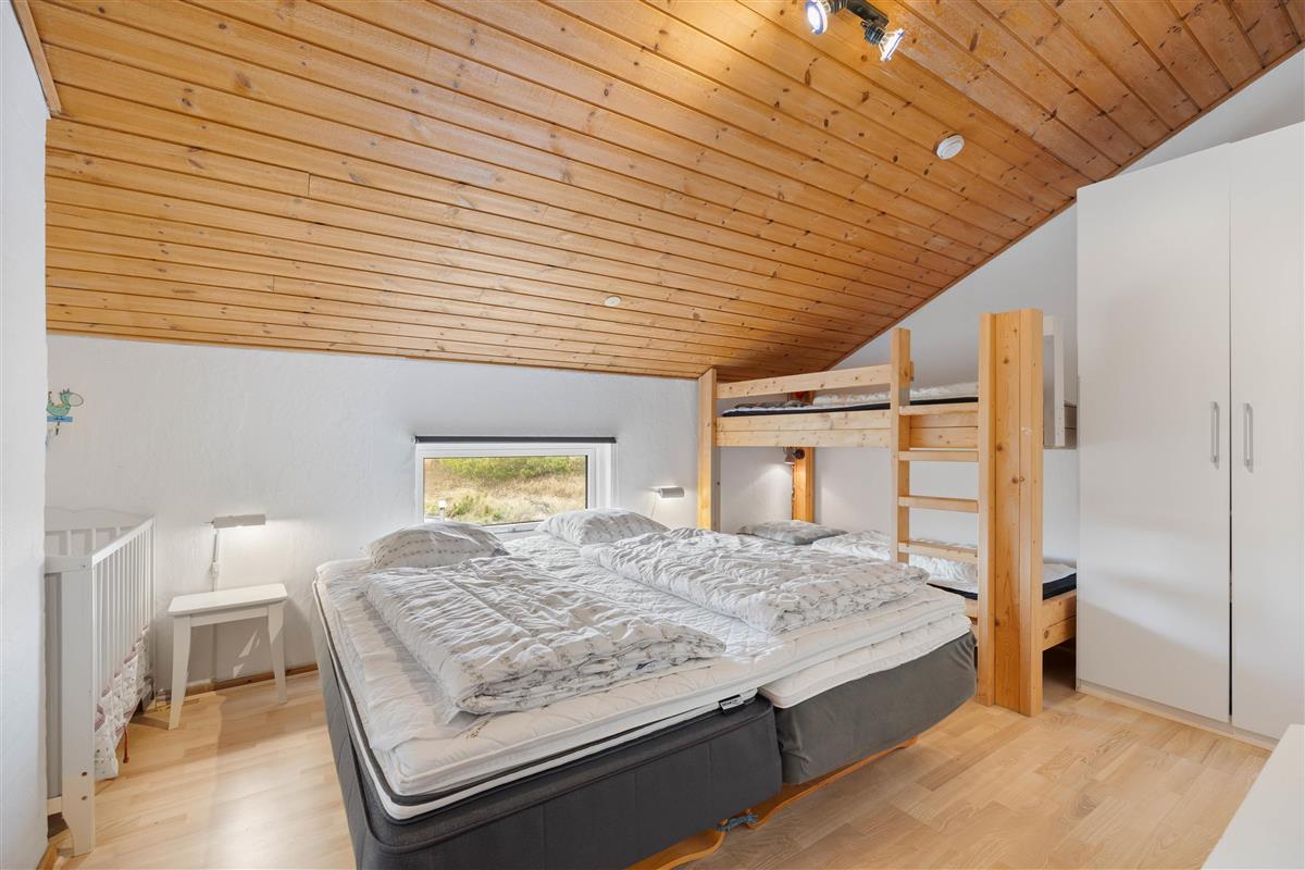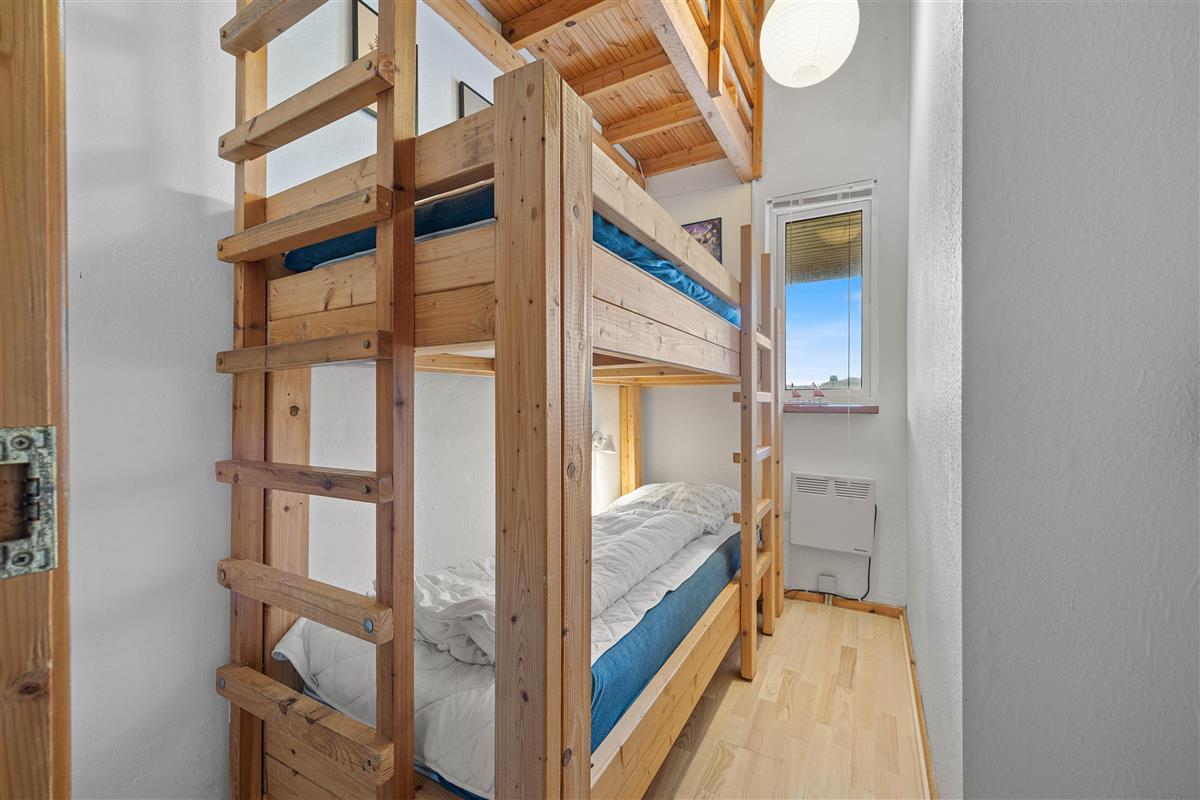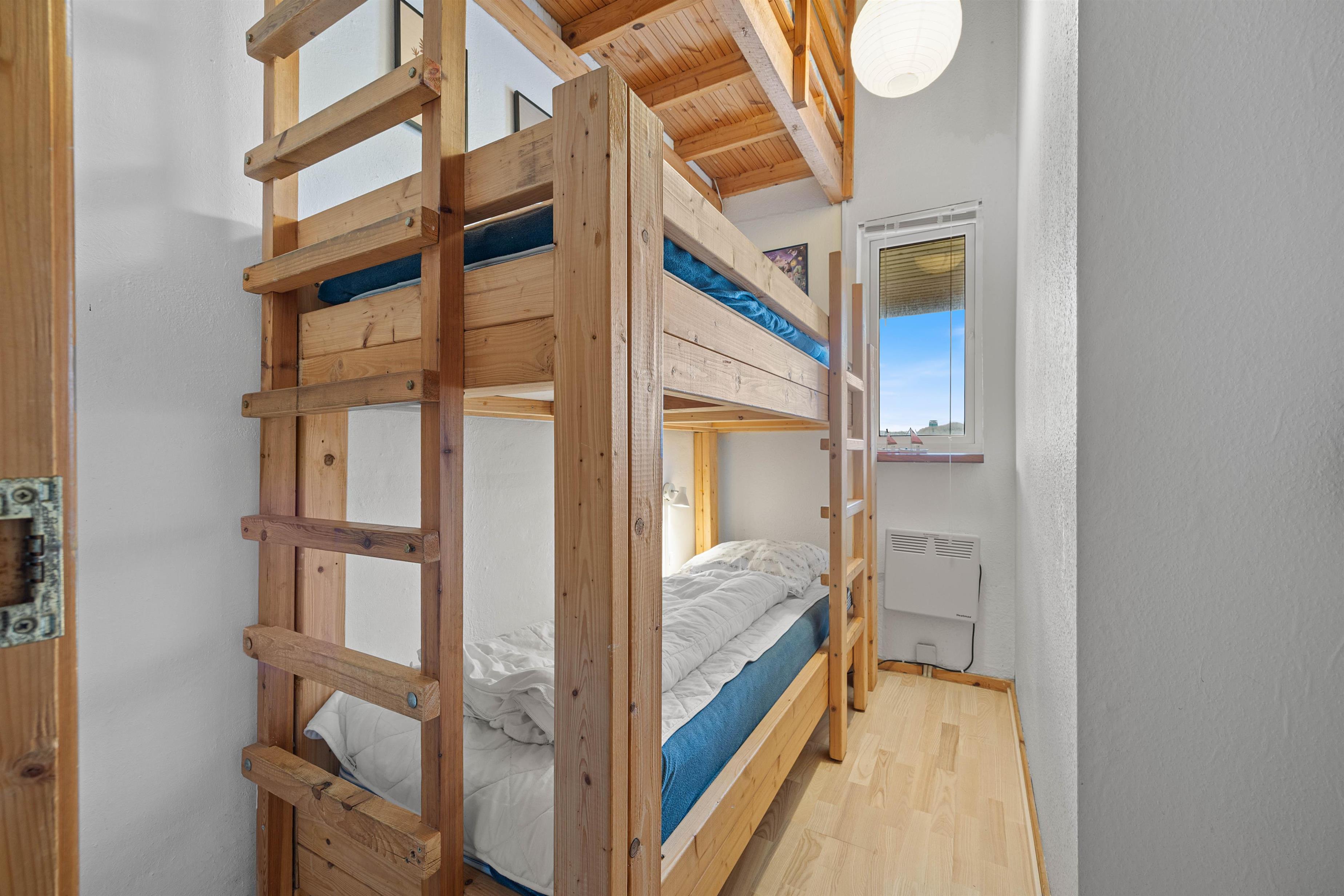 For sleeping arrangements, the holiday home offers three bedrooms. One bedroom features a double bed and bunk beds, the second bedroom has bunk beds, and the third bedroom contains a double bed. If you prefer not to have four people sleeping in one bedroom, there are two additional mattresses in the sleeping loft, which is accessible from the living area.