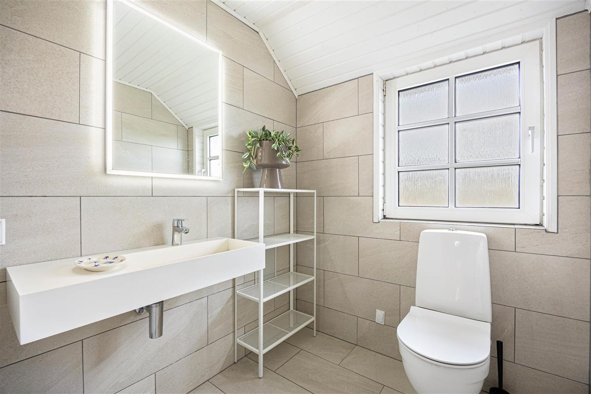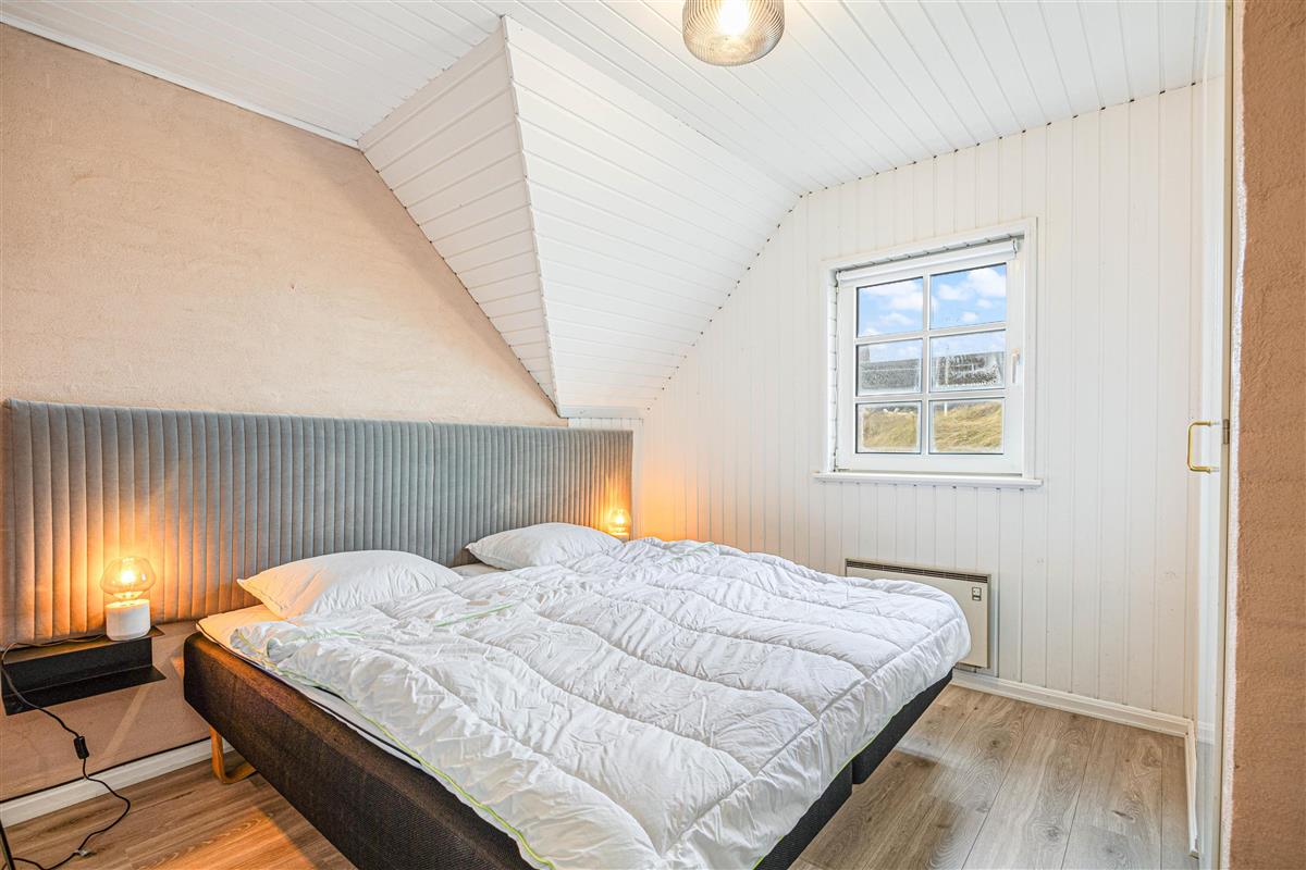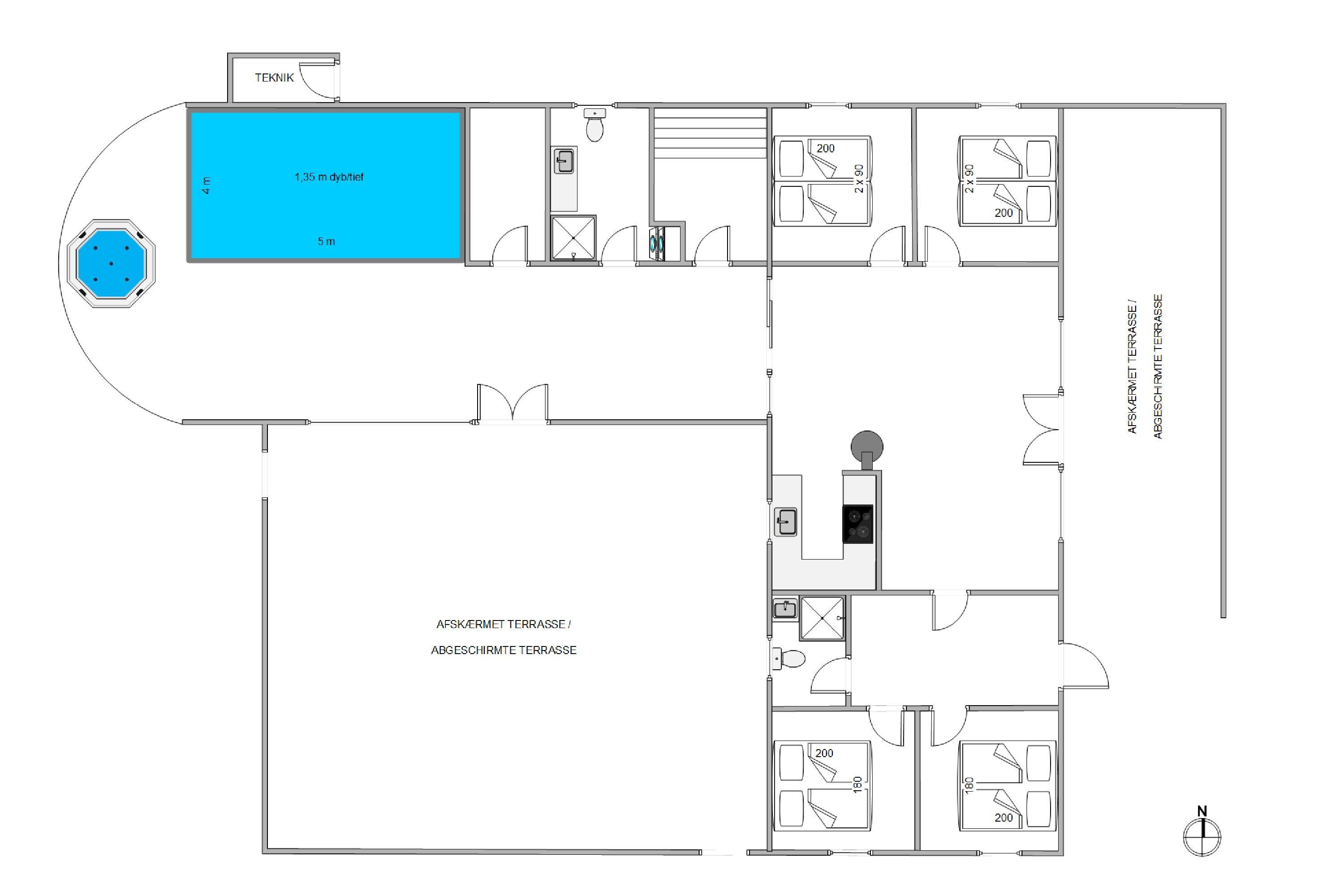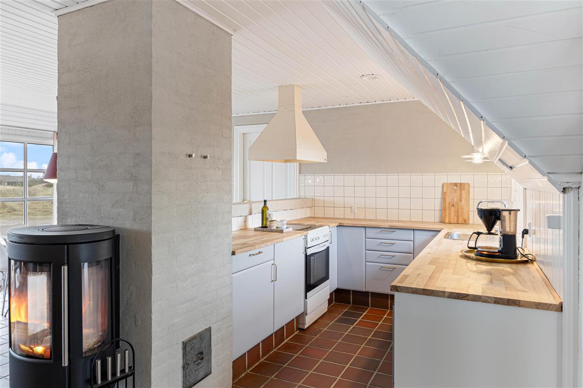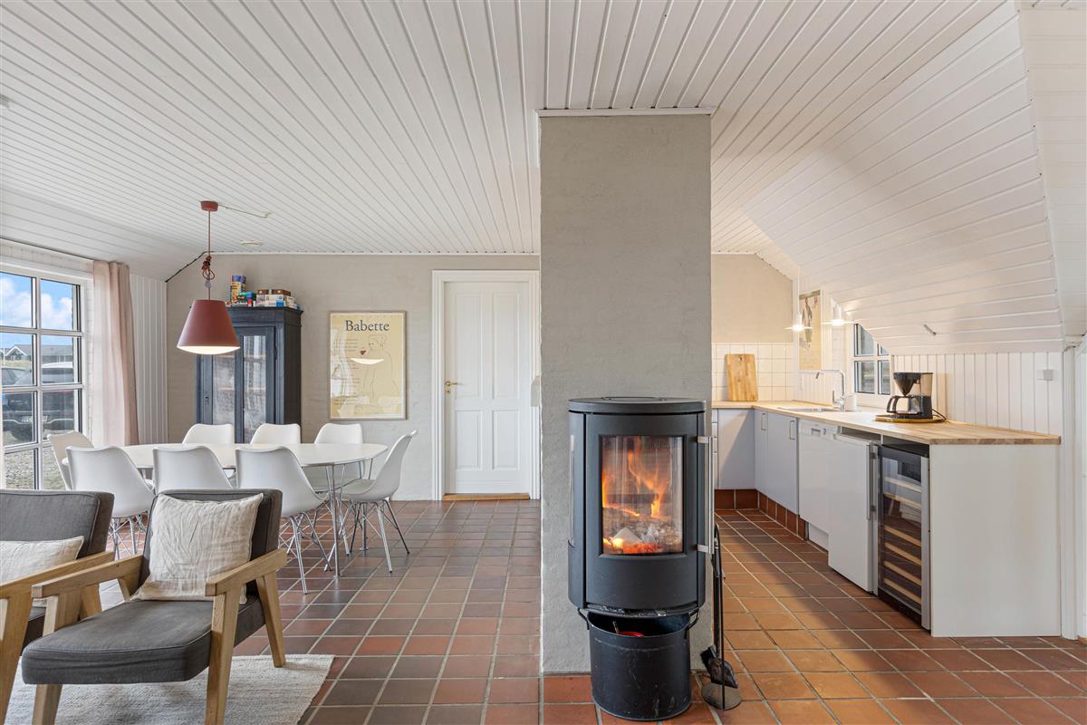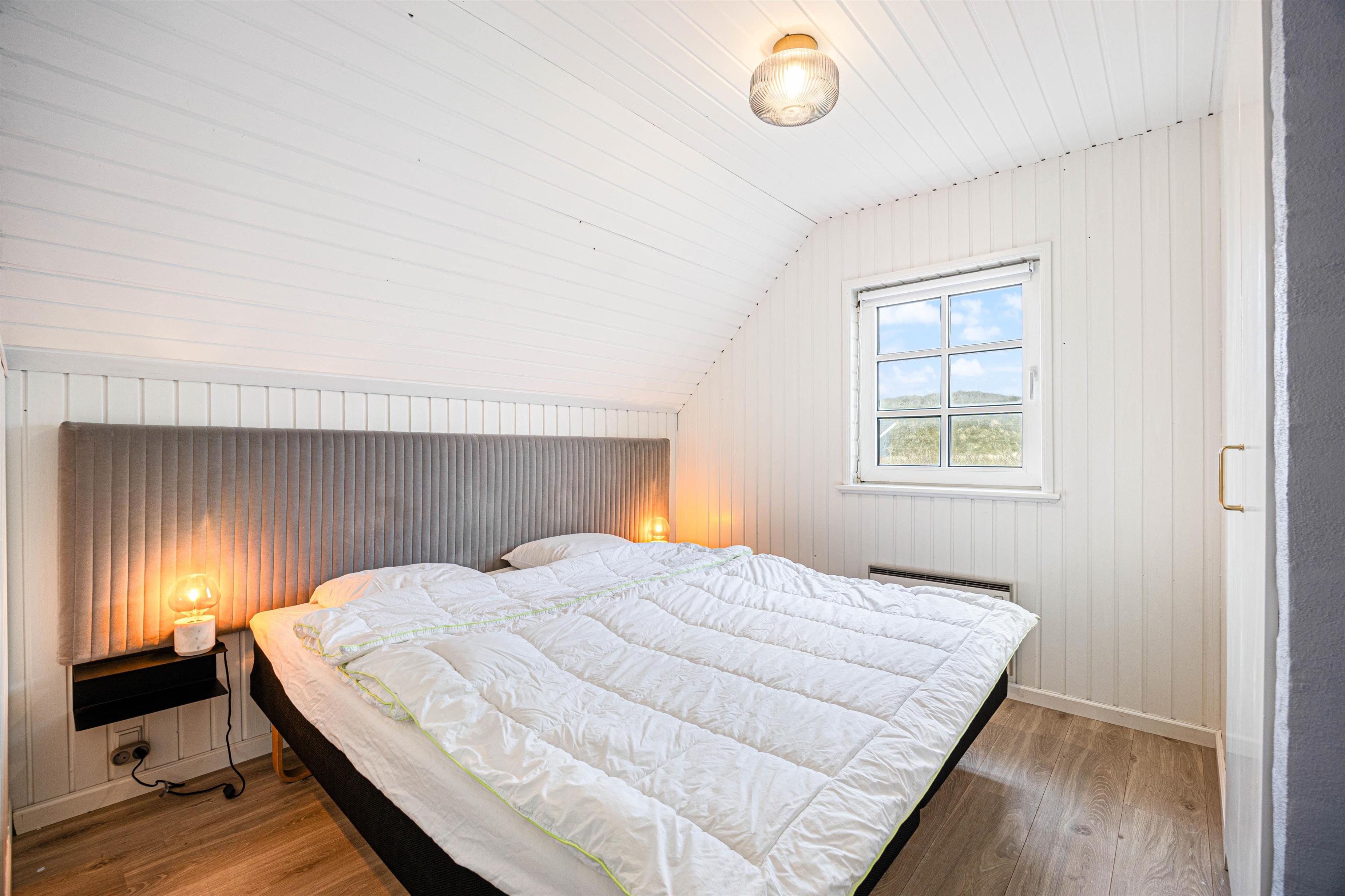 The interior was modernised in 2022, featuring washed walls and white-painted wooden panels which, combined with numerous windows, create bright and beautiful rooms. The bathroom was also newly renovated in 2022. The wood-burning stove in the centre of the spacious kitchen and living room creates a cosy atmosphere perfect for a relaxing holiday. The living room provides access to the lovely pool area with hot tub. The house has four bedrooms, all with double beds, and two renovated bathrooms.