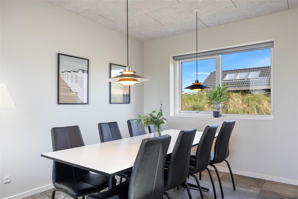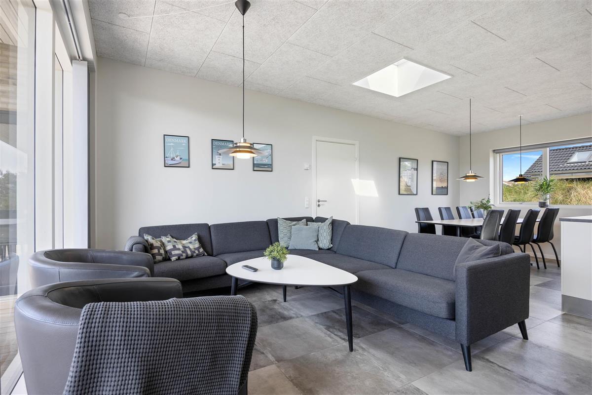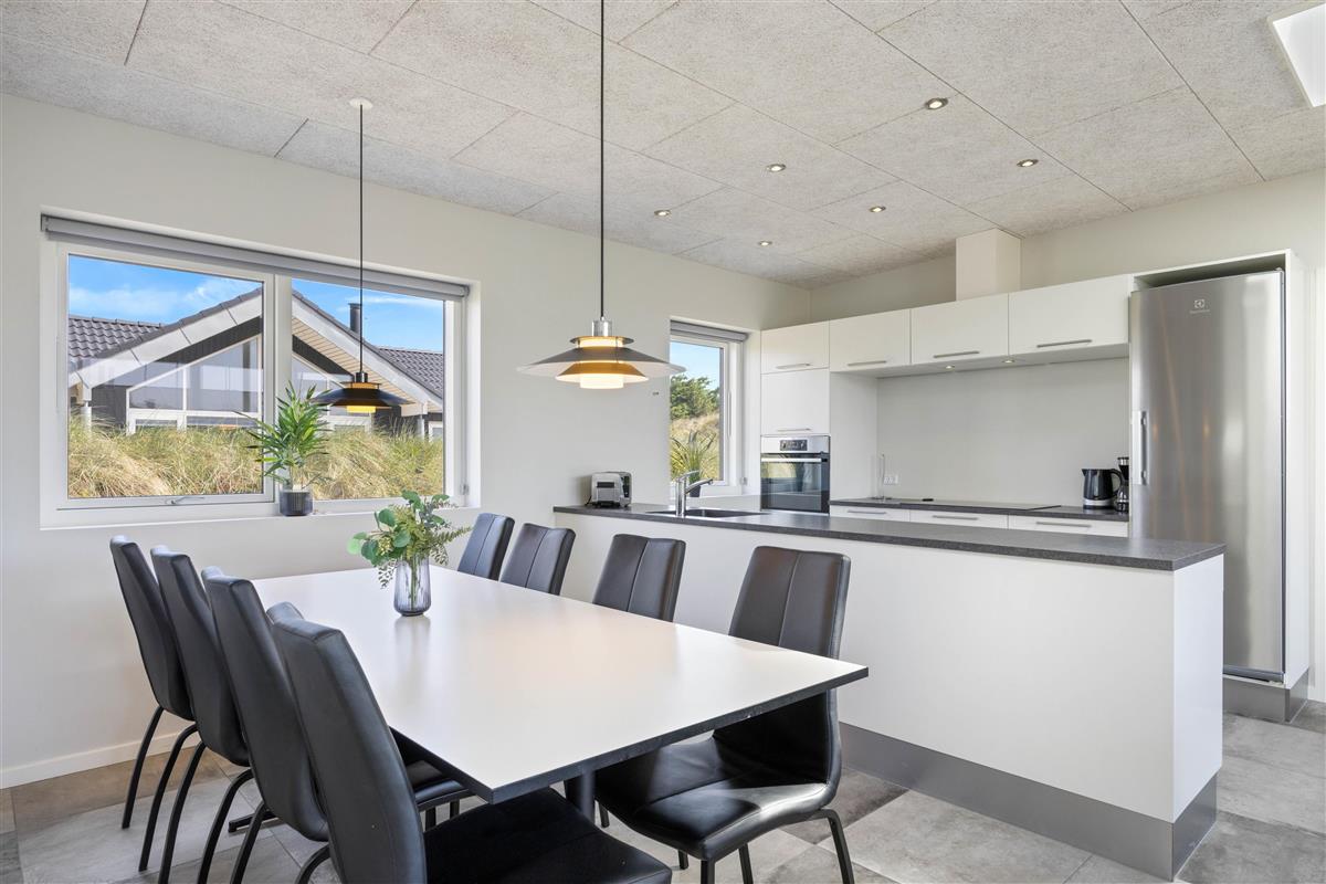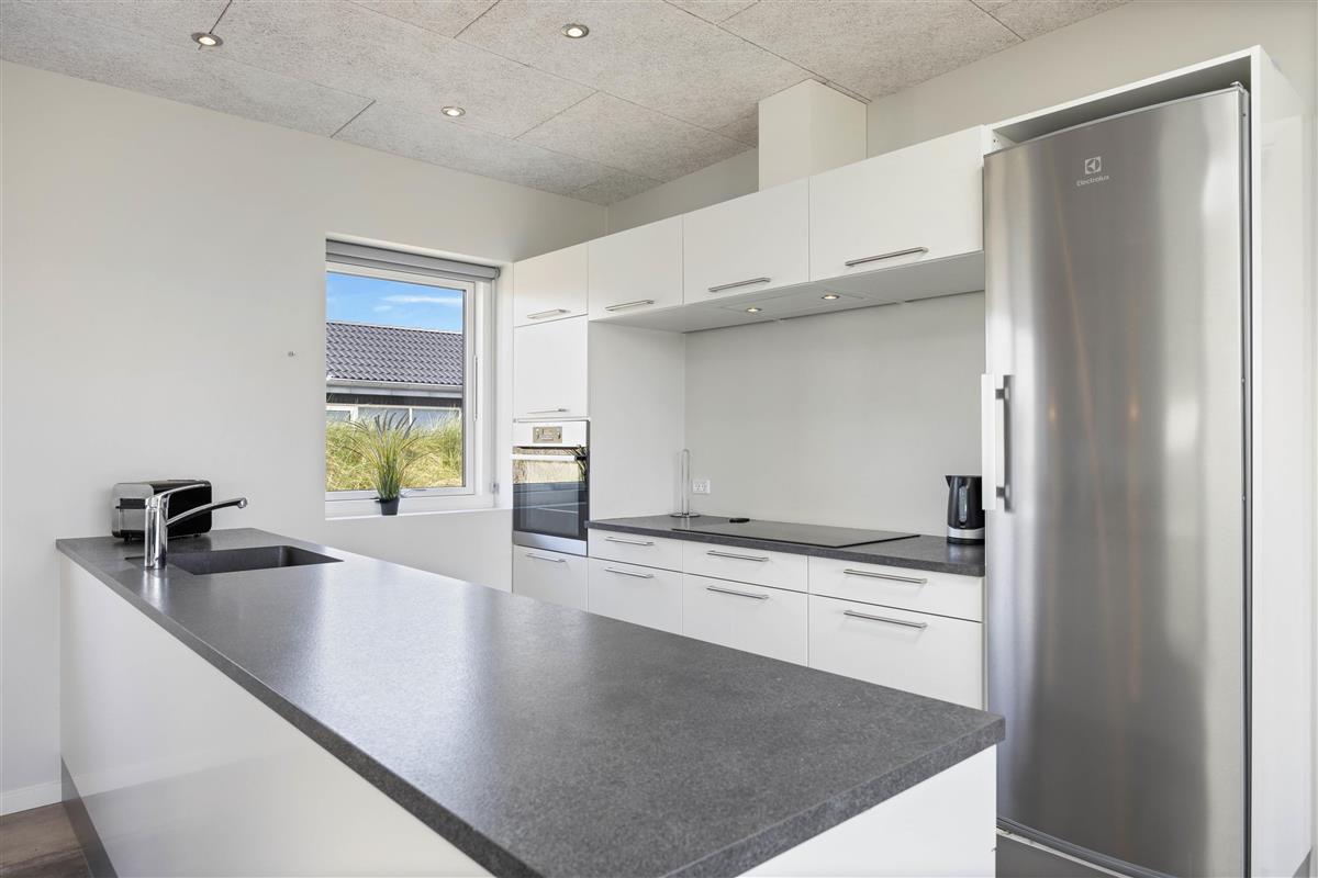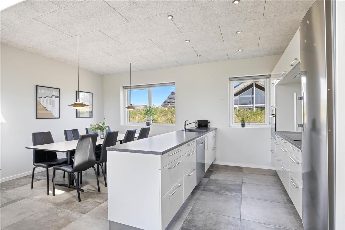 This Houvig holiday home is truly something special. You'll feel at home the moment you step inside. The large, bright rooms are wonderfully welcoming and hospitable. The spacious living area encompasses a kitchen, dining area and living room, decorated in striking black and white tones. The open-plan kitchen is well-equipped and perfect for preparing evening meals.