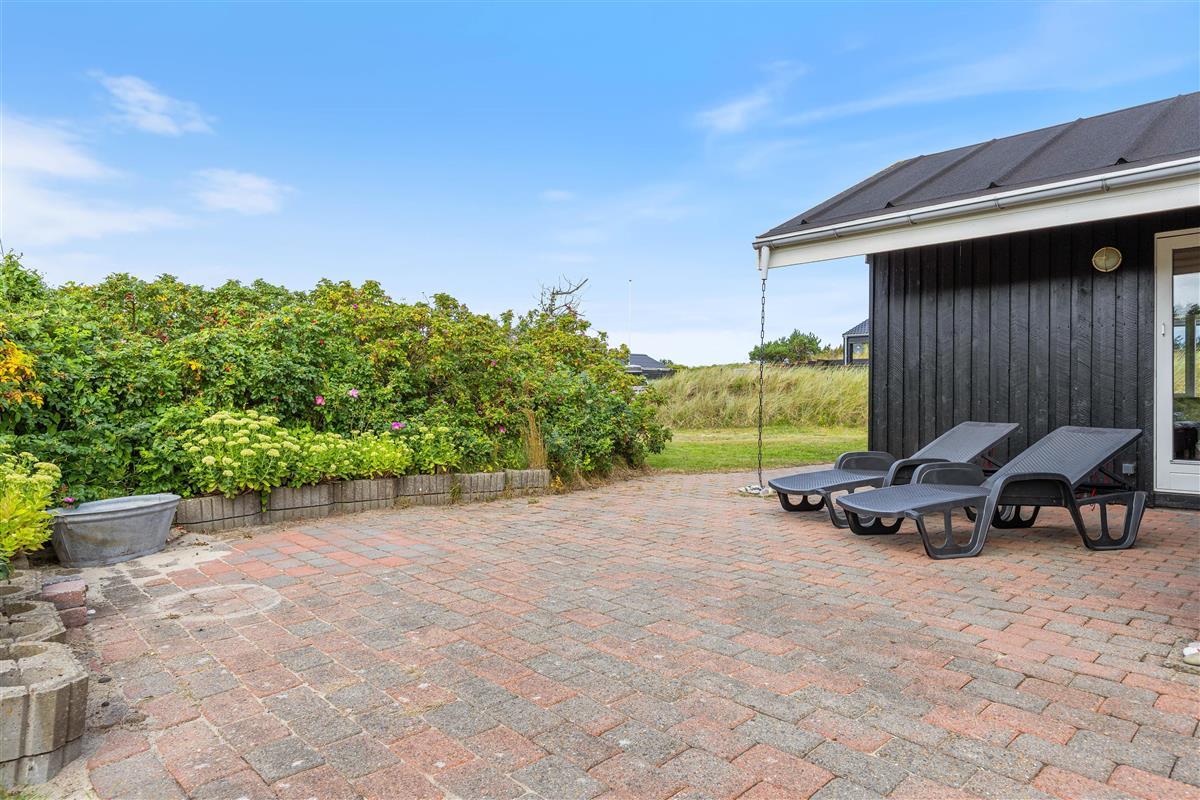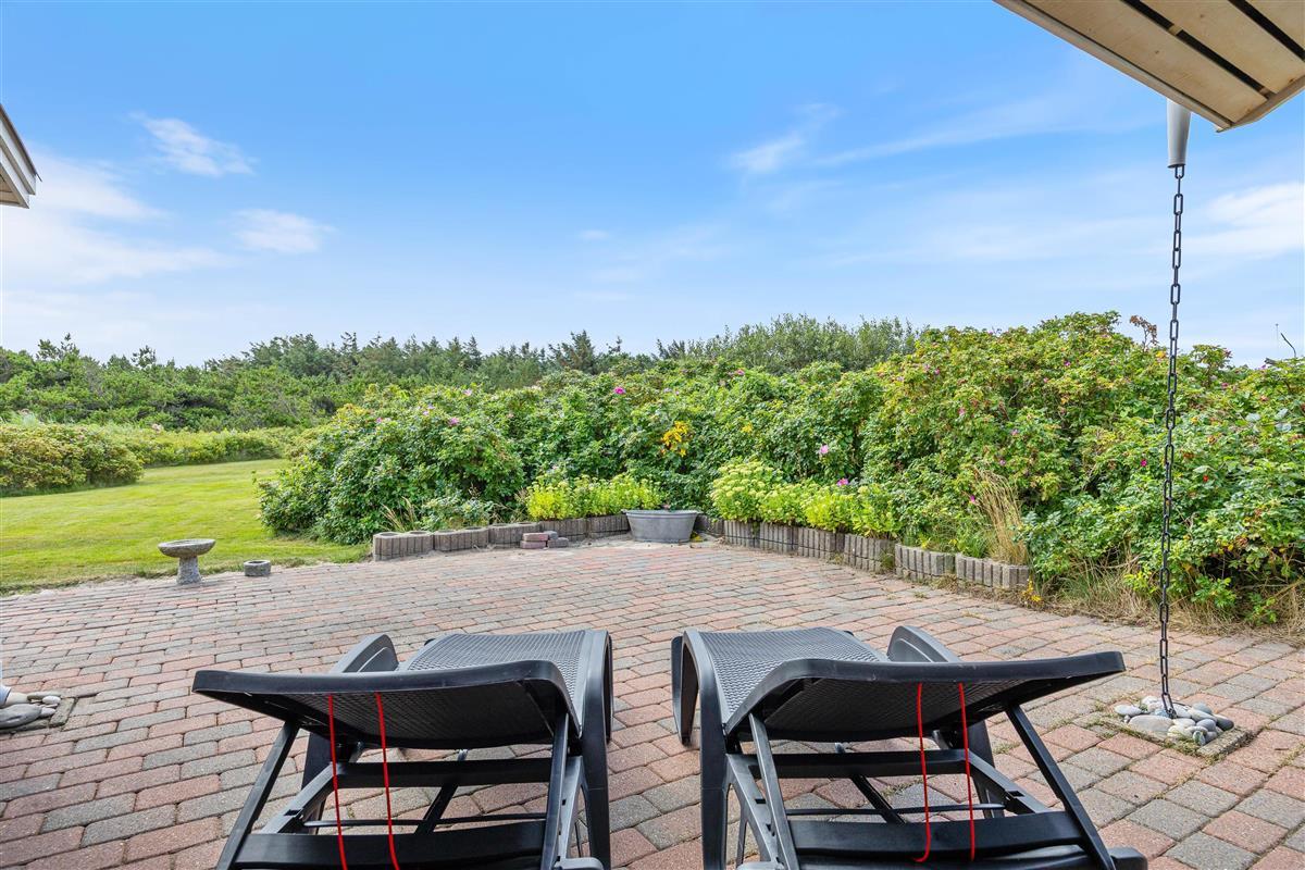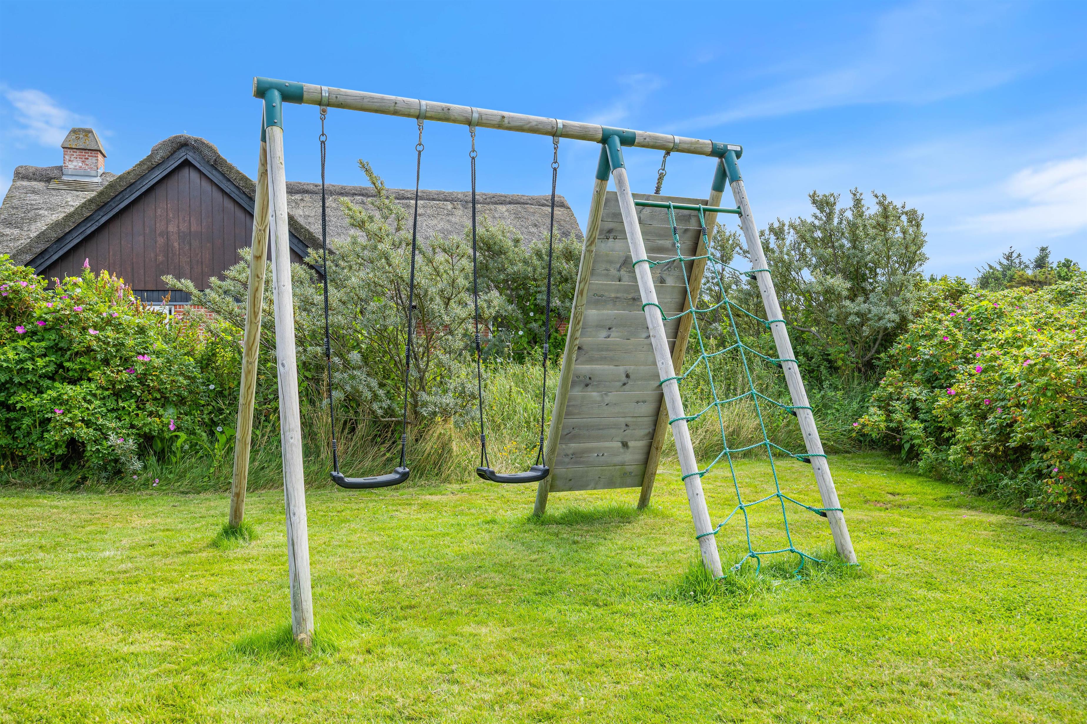 Vom Wohnzimmer des Ferienhauses habt ihr direkten Zugang zu einer teilweise überdachten und abgeschirmten Terrasse. Hier könnt ihr entspannen, Sonne tanken und die frische Meeresluft inhalieren. Während der Grill aufheizt, könnt ihr es euch auf den Sonnenliegen gemütlich machen und die Kinder können auf der Wiese spielen und schaukeln.