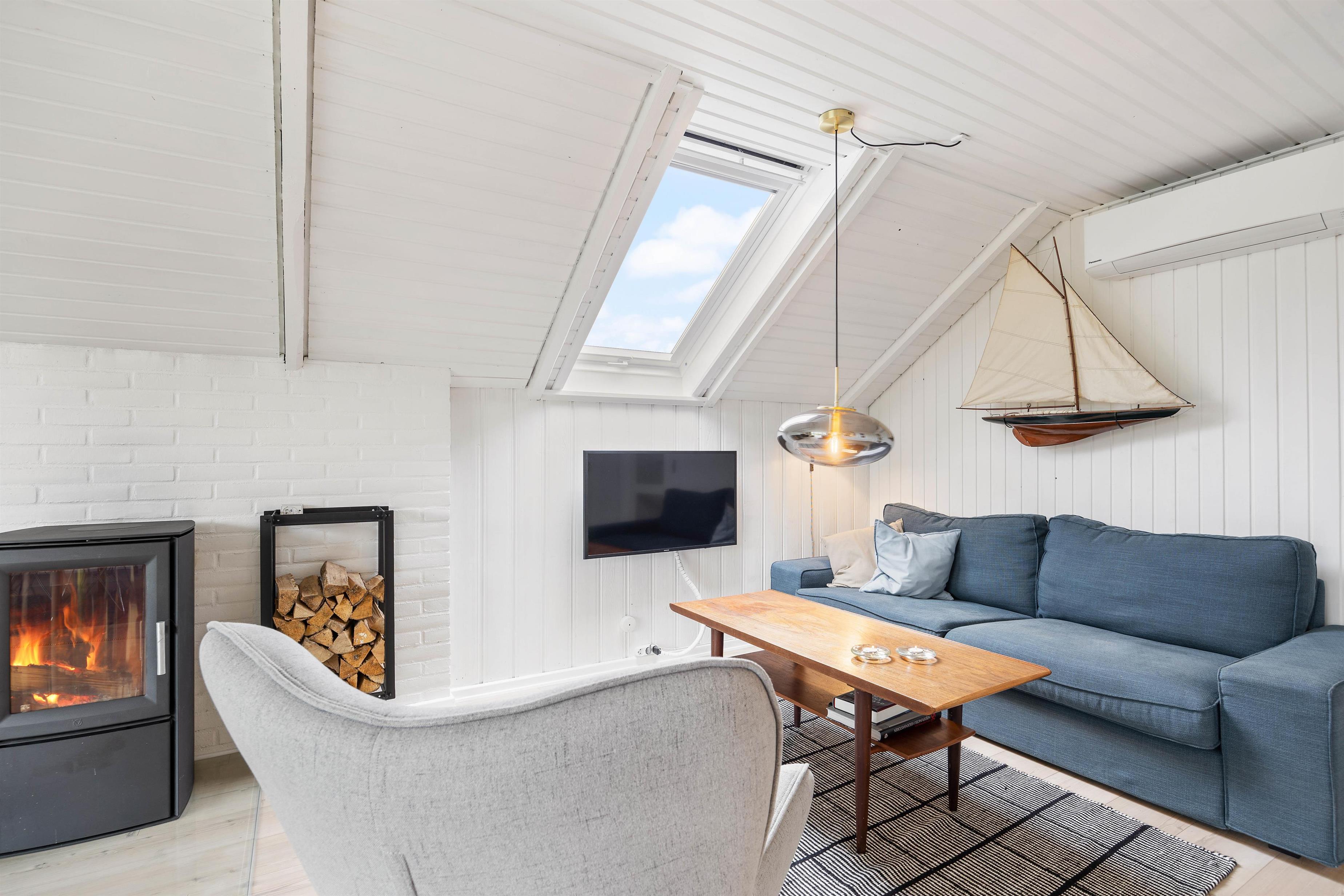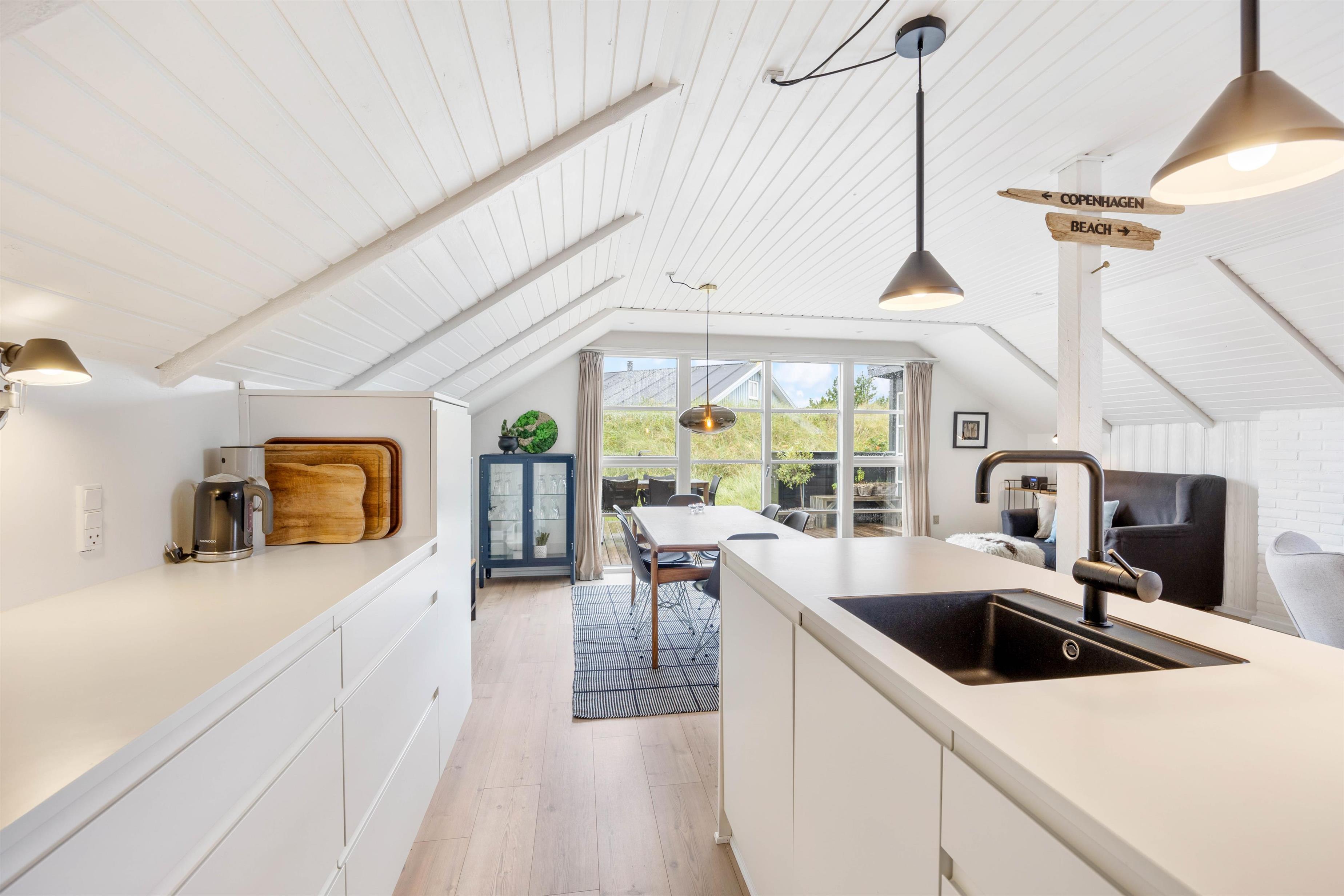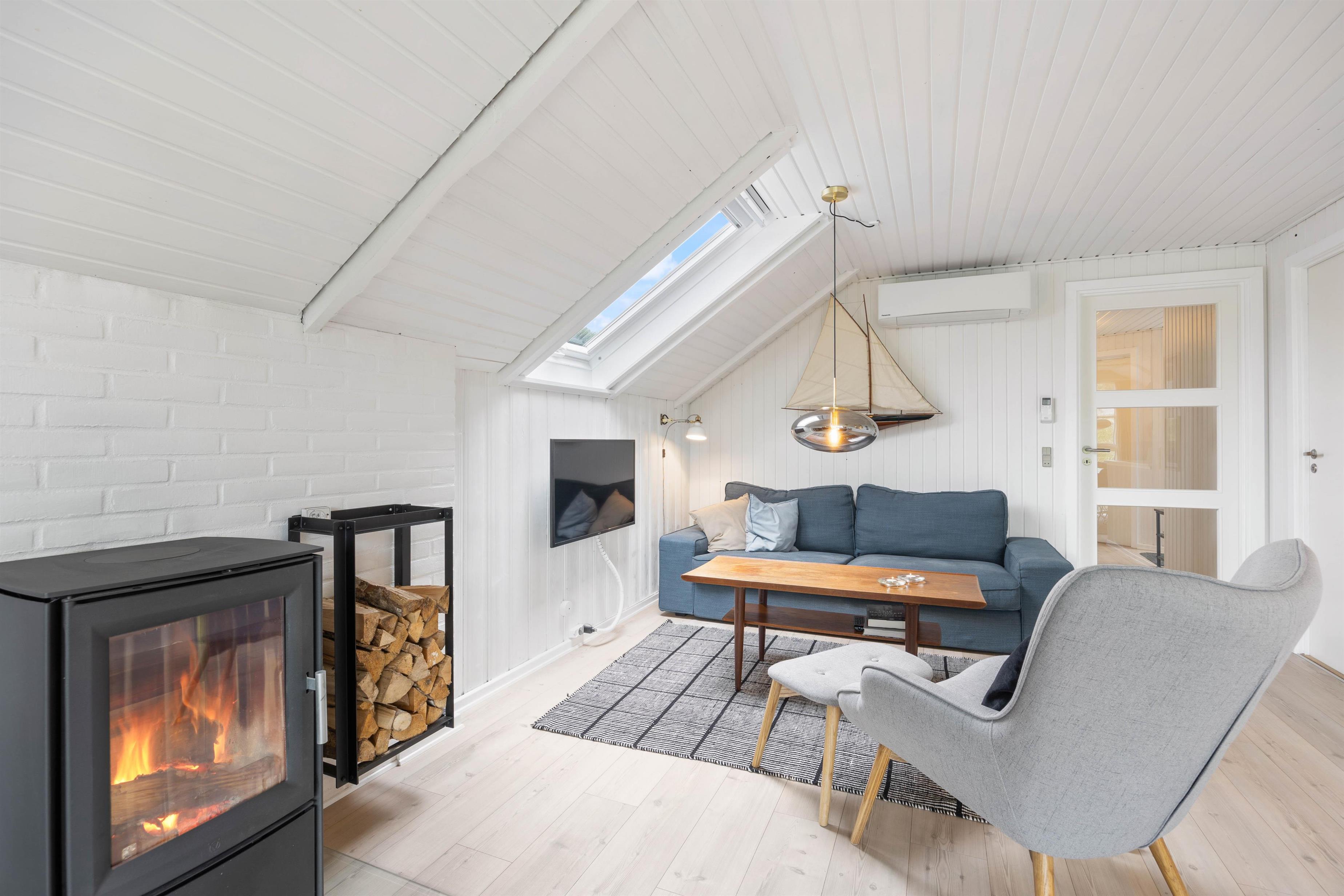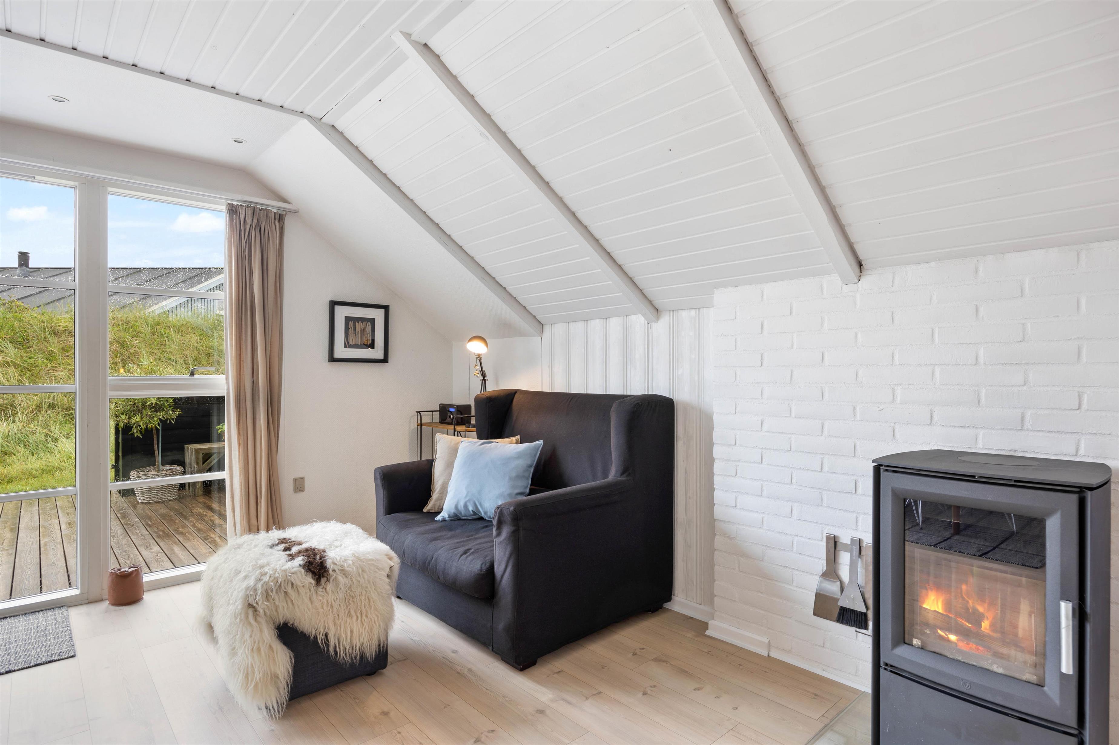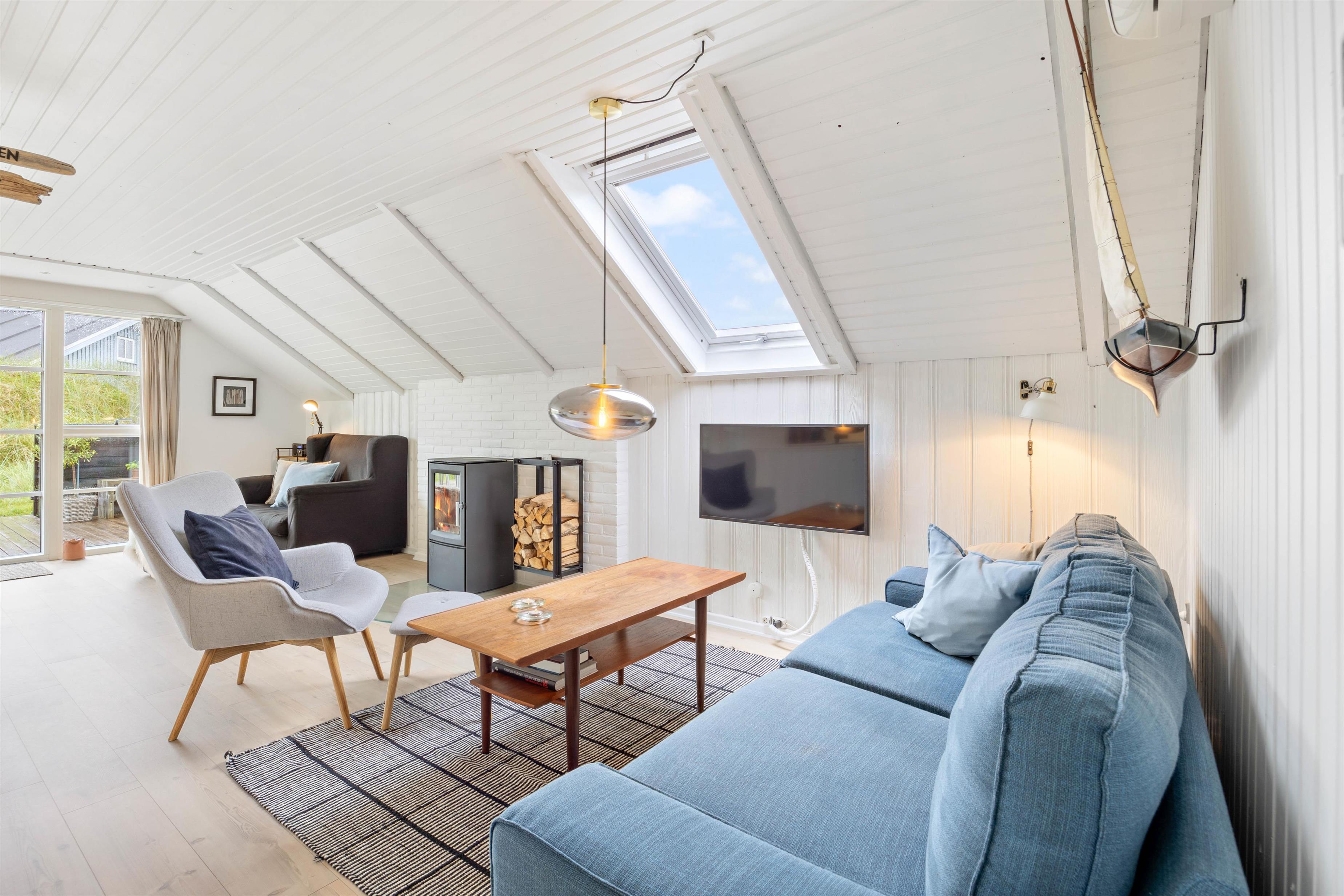 You'll feel instantly at home when entering this cosy holiday home in Houvig. The interior is bright and welcoming. The spacious open-plan area, combining the kitchen, dining area and living room, offers plenty of space to enjoy a good film while basking in the warmth of the wood-burning stove.