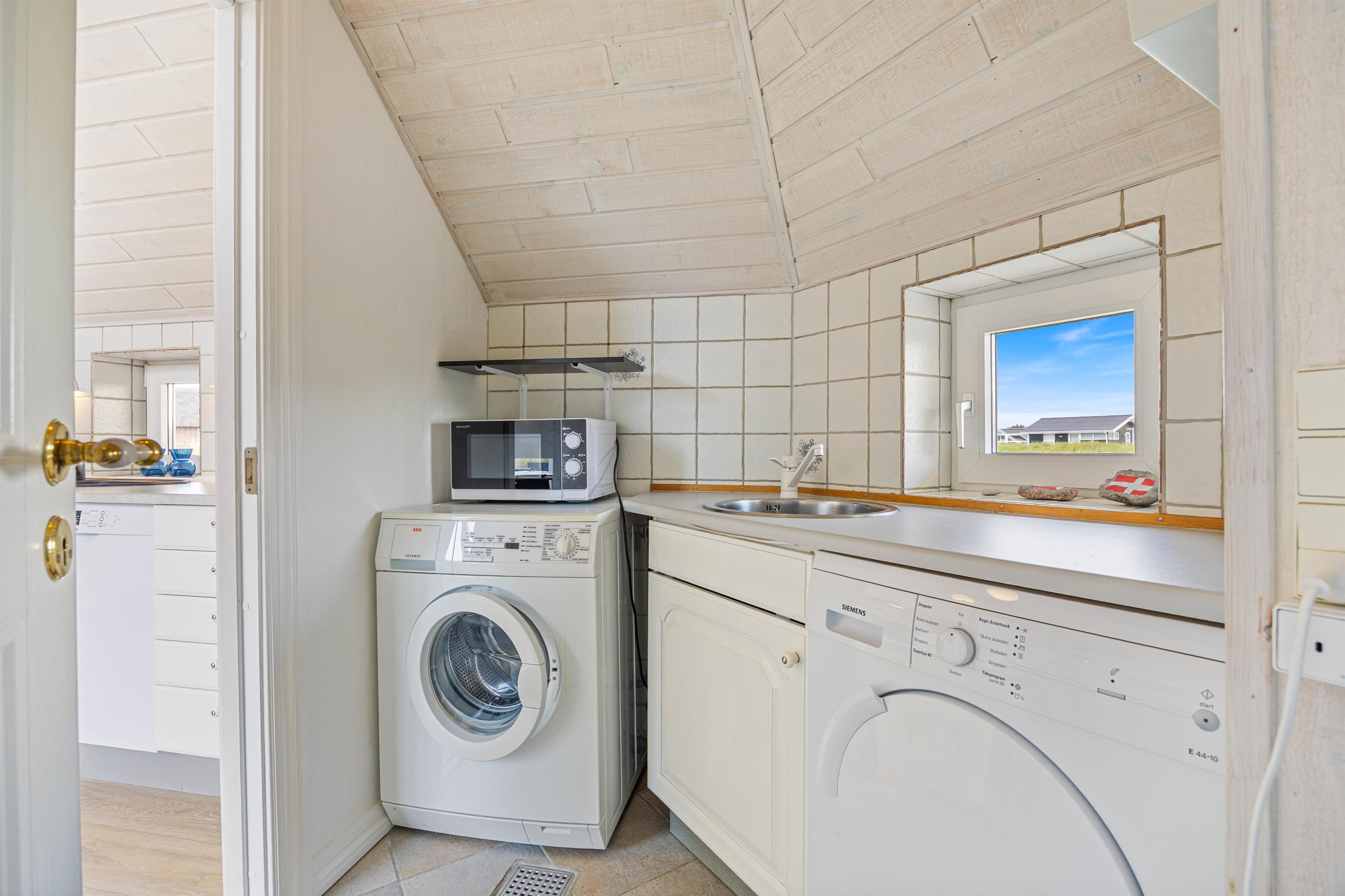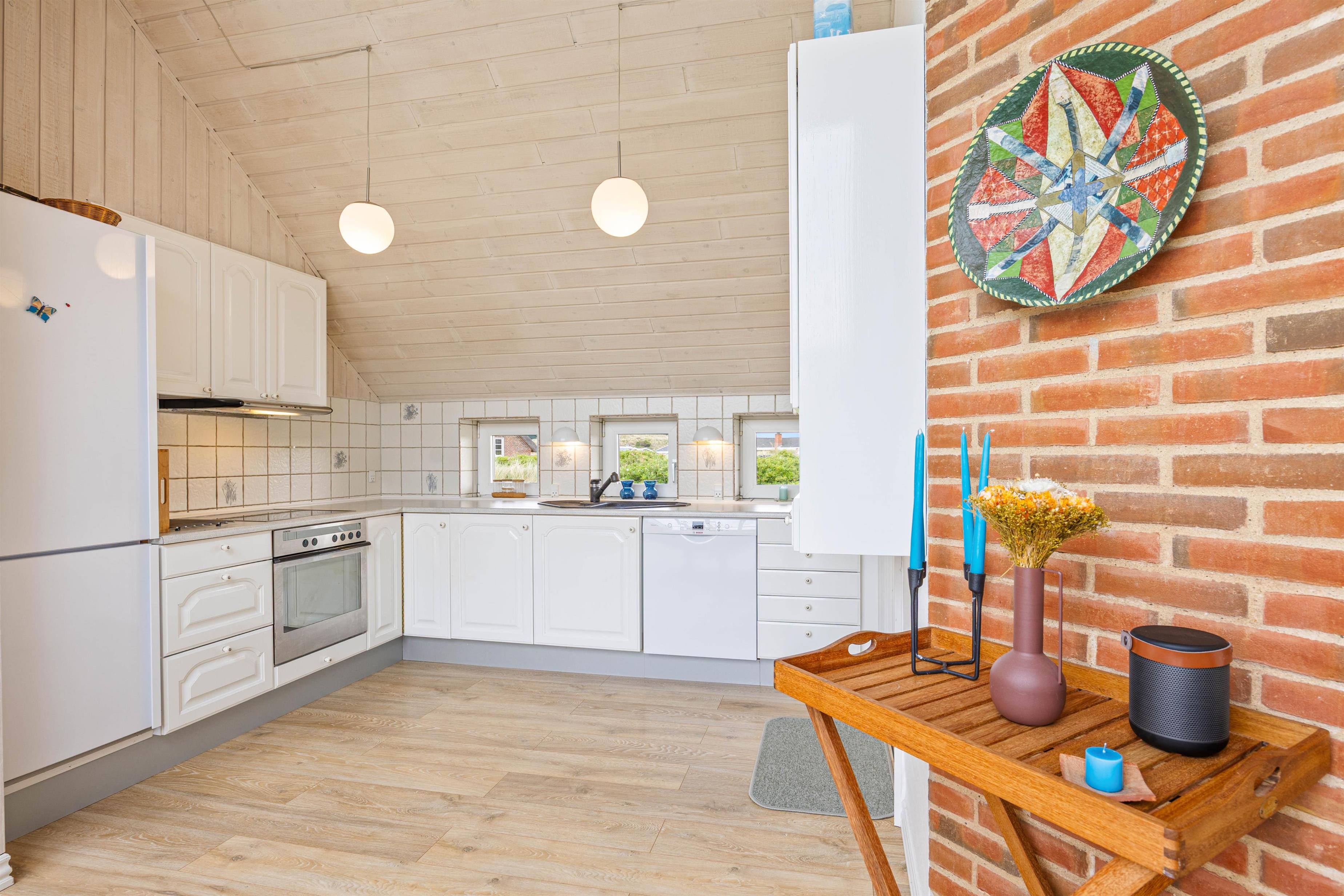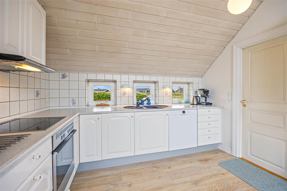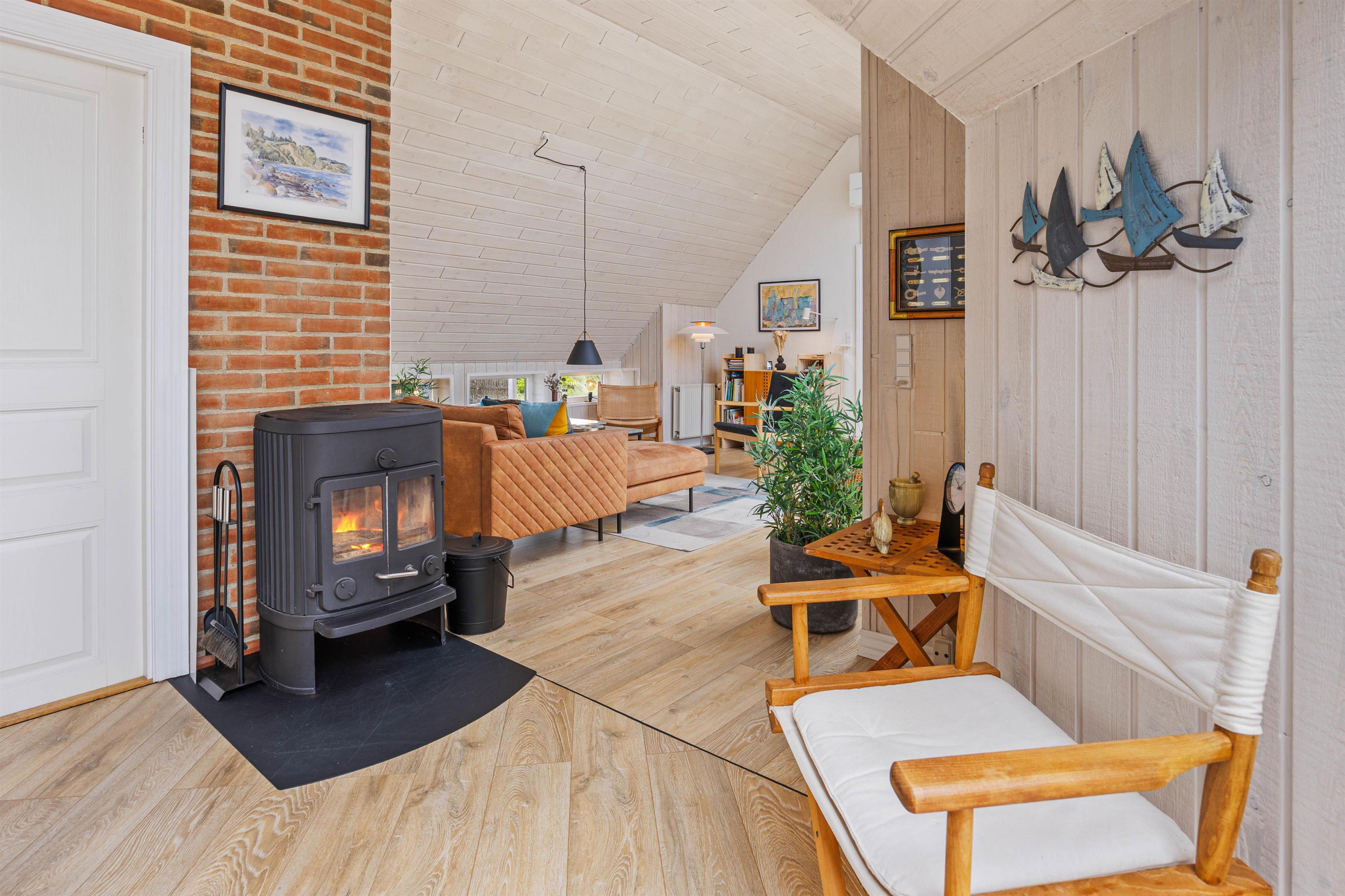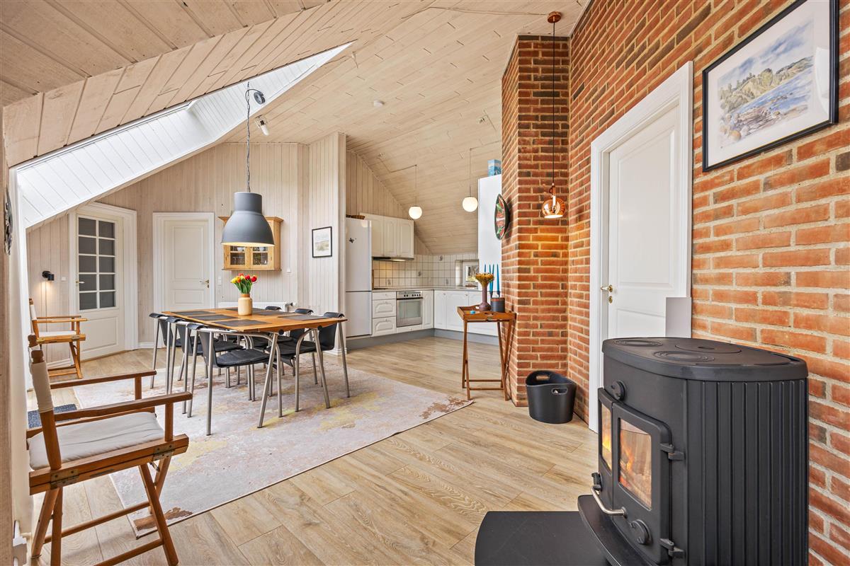 Enjoy views of the dune landscape, covered in heather and dune grass, through two large, beautiful window areas in the cosy living room and kitchen, where the attractive dining table sits directly under the glazed section. These two rooms flow into one another, and from the kitchen, you have access to a practical utility room with washing machine and tumble dryer.