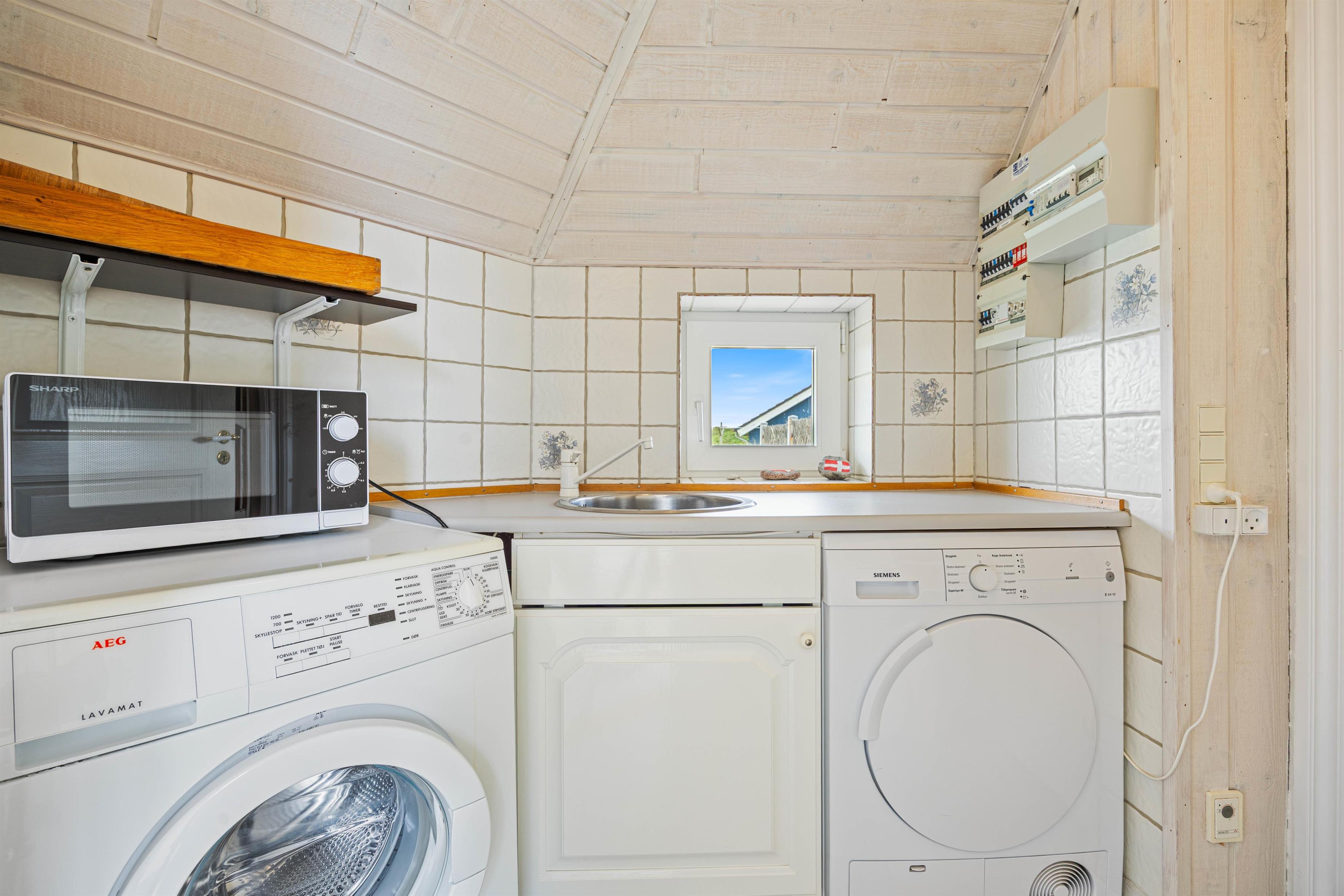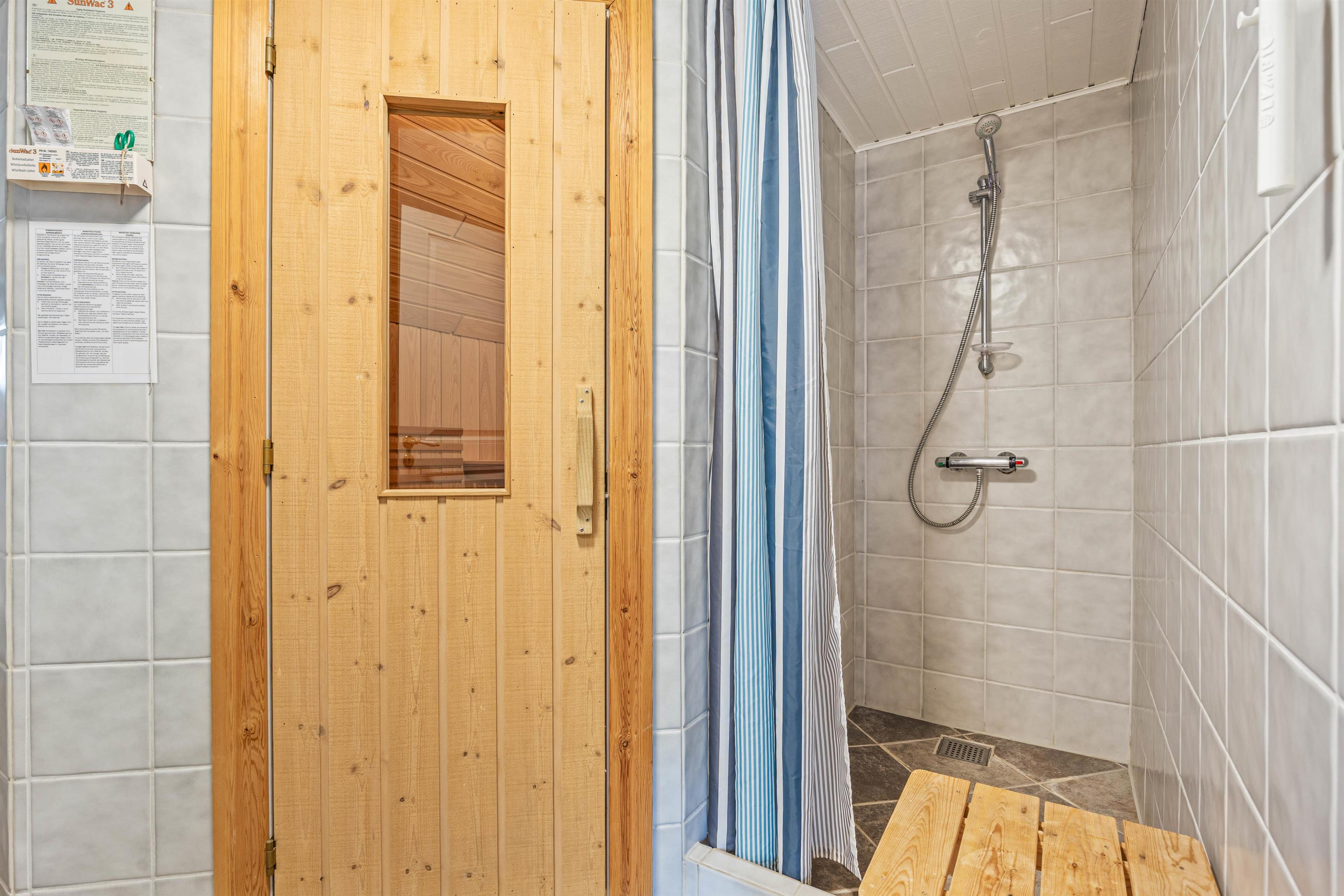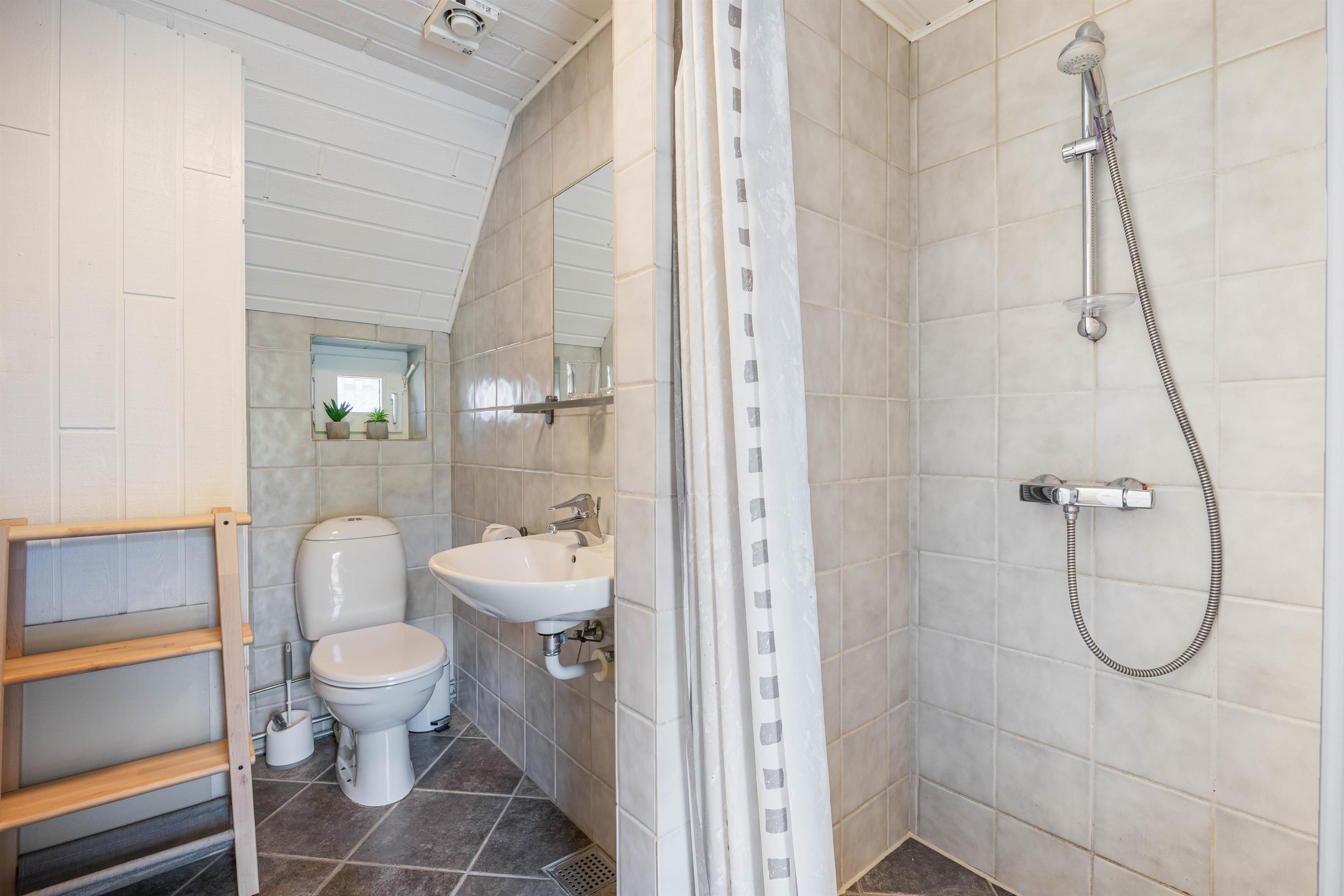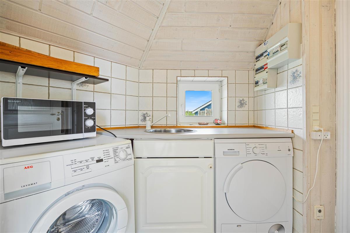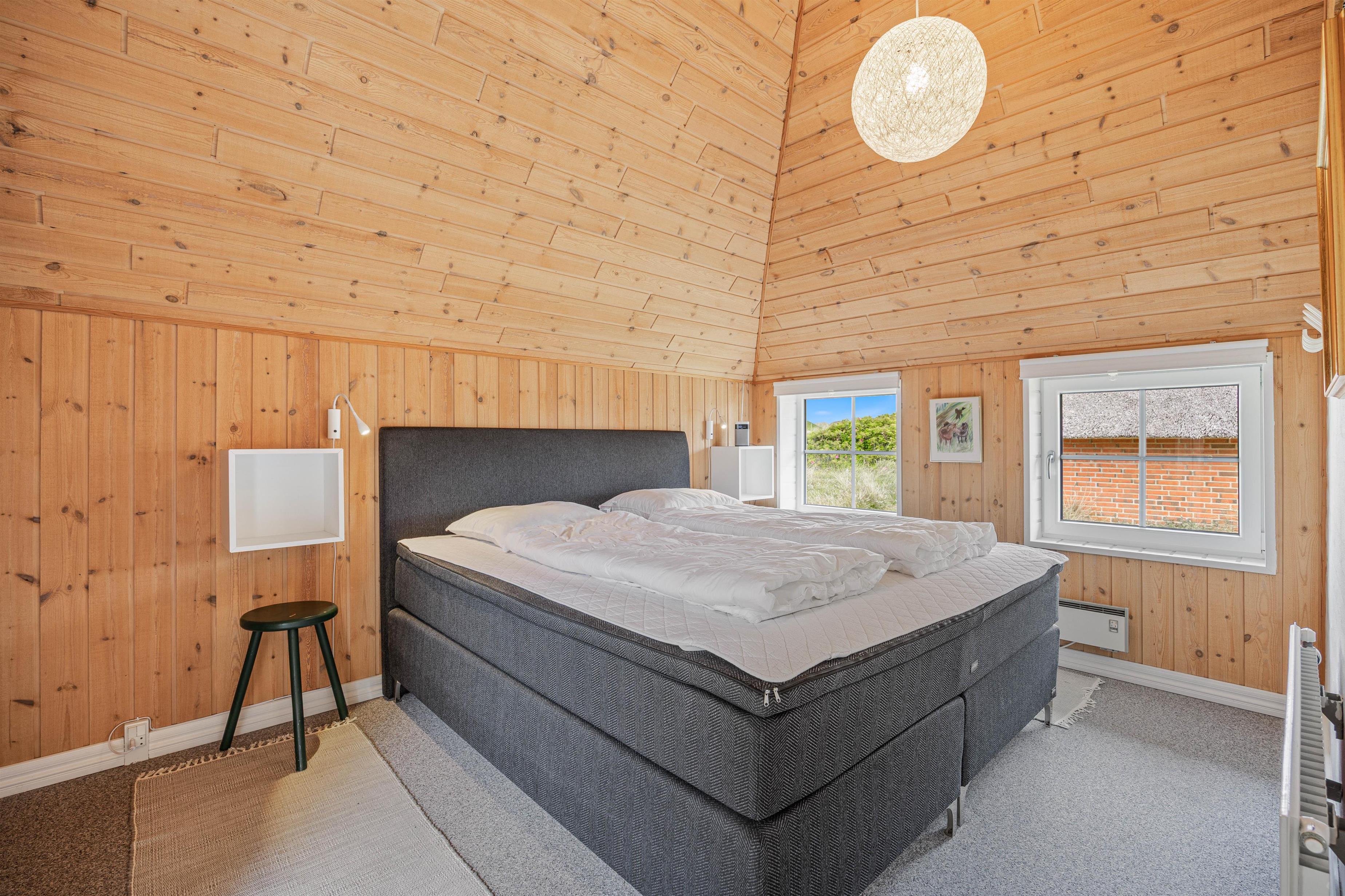 Enjoy views of the dune landscape, covered in heather and dune grass, through two large, beautiful window areas in the cosy living room and kitchen, where the attractive dining table sits directly under the glazed section. These two rooms flow into one another, and from the kitchen, you have access to a practical utility room with washing machine and tumble dryer.