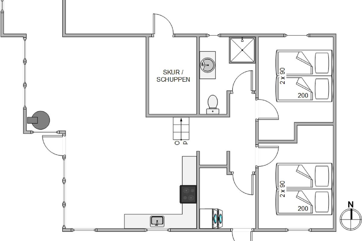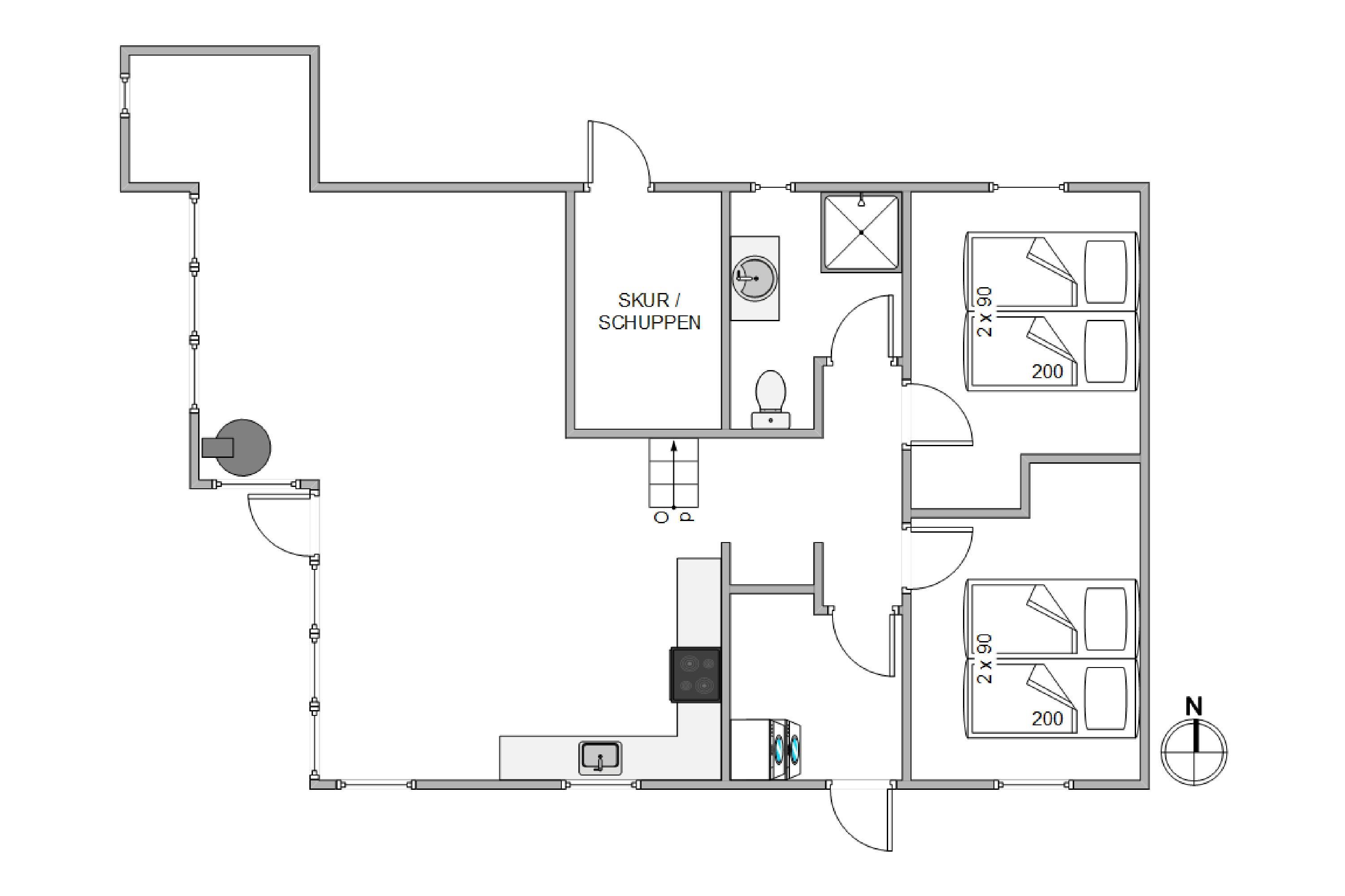 An excellent and cosy holiday home of 74 square metres. Light wooden flooring runs throughout the holiday home, with tiles in the bathroom only. The two bedrooms are furnished with double beds, and there's additional sleeping space for two people on a sofa bed in the sleeping alcove, located in the northwest corner of the living room.