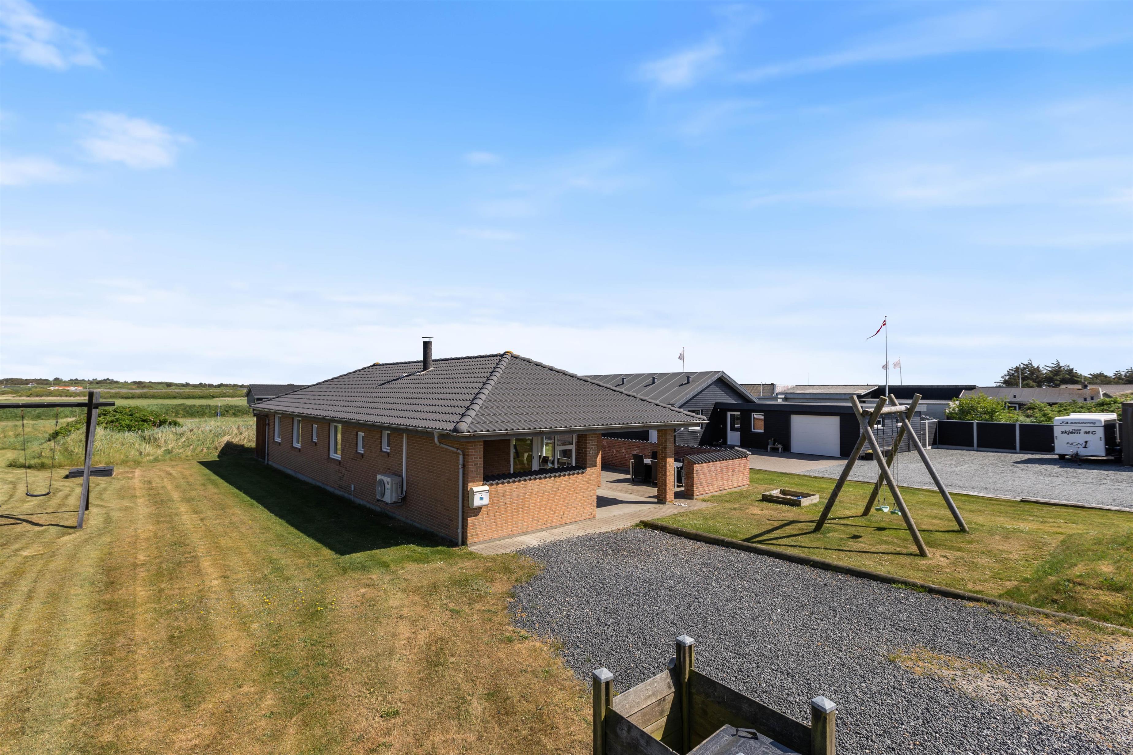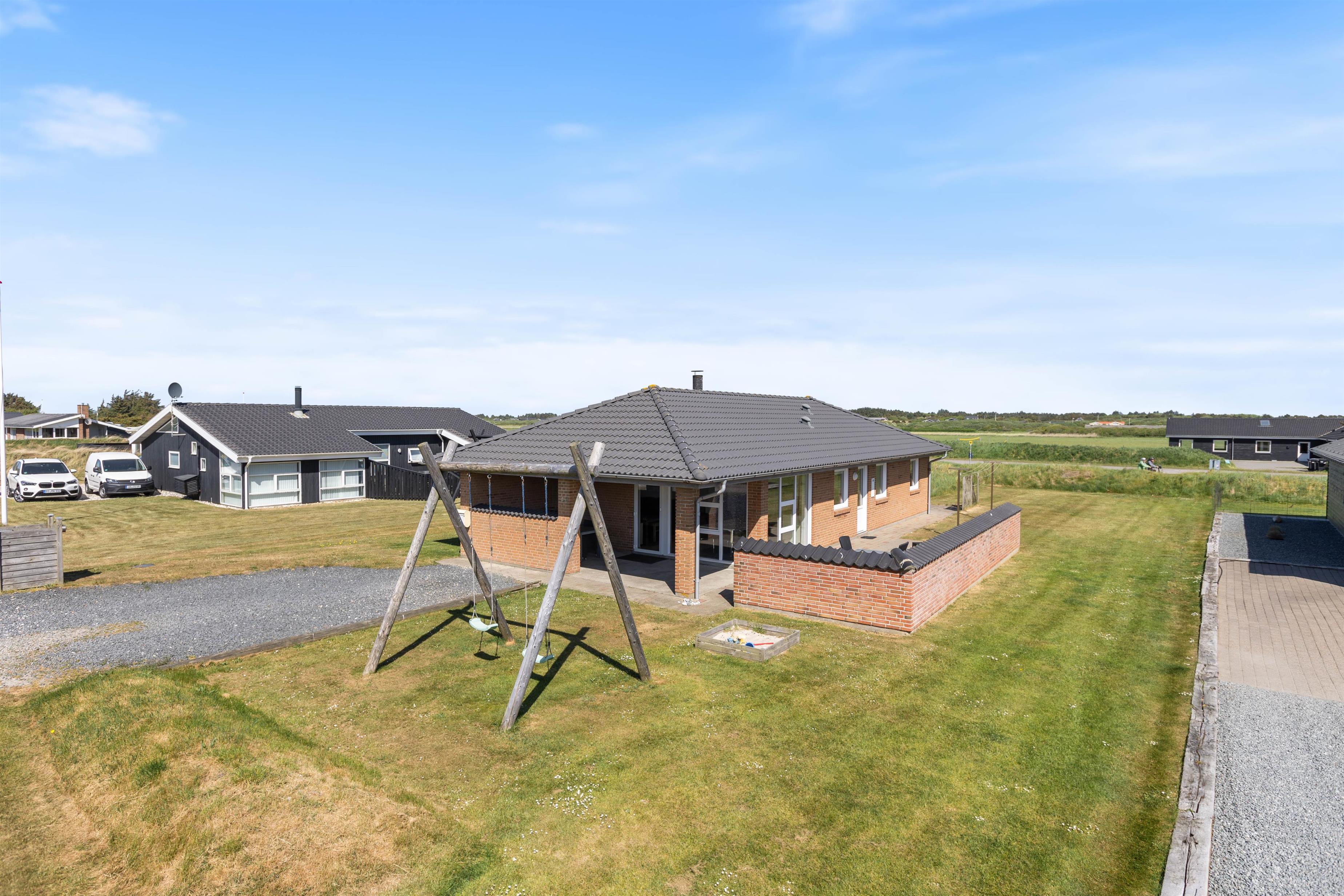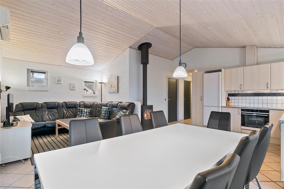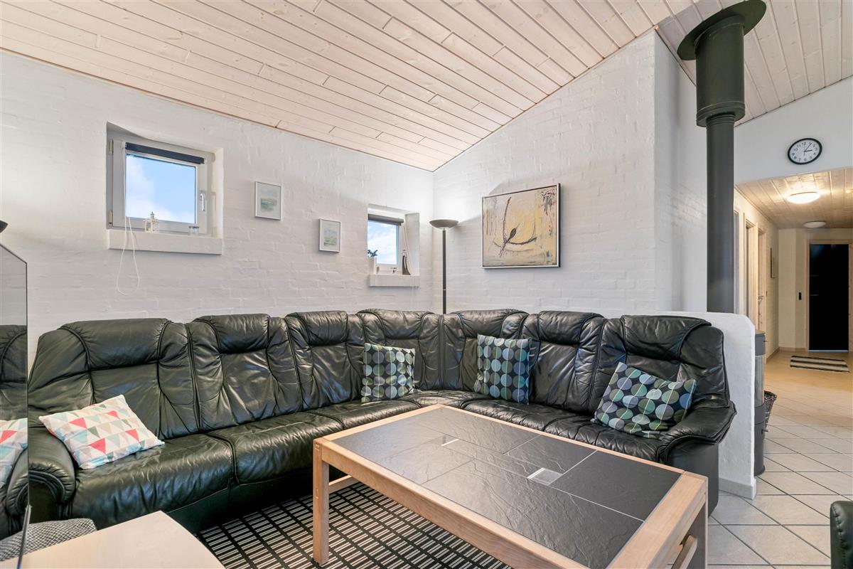 The holiday home has 4 bedrooms - one with a double bed and 2 with single beds. There are also 2 bathrooms, both featuring underfloor heating. If you're two families sharing the holiday home, each family can have their own bathroom. The holiday home is equipped with a heat pump, ensuring comfortable temperatures at low cost.