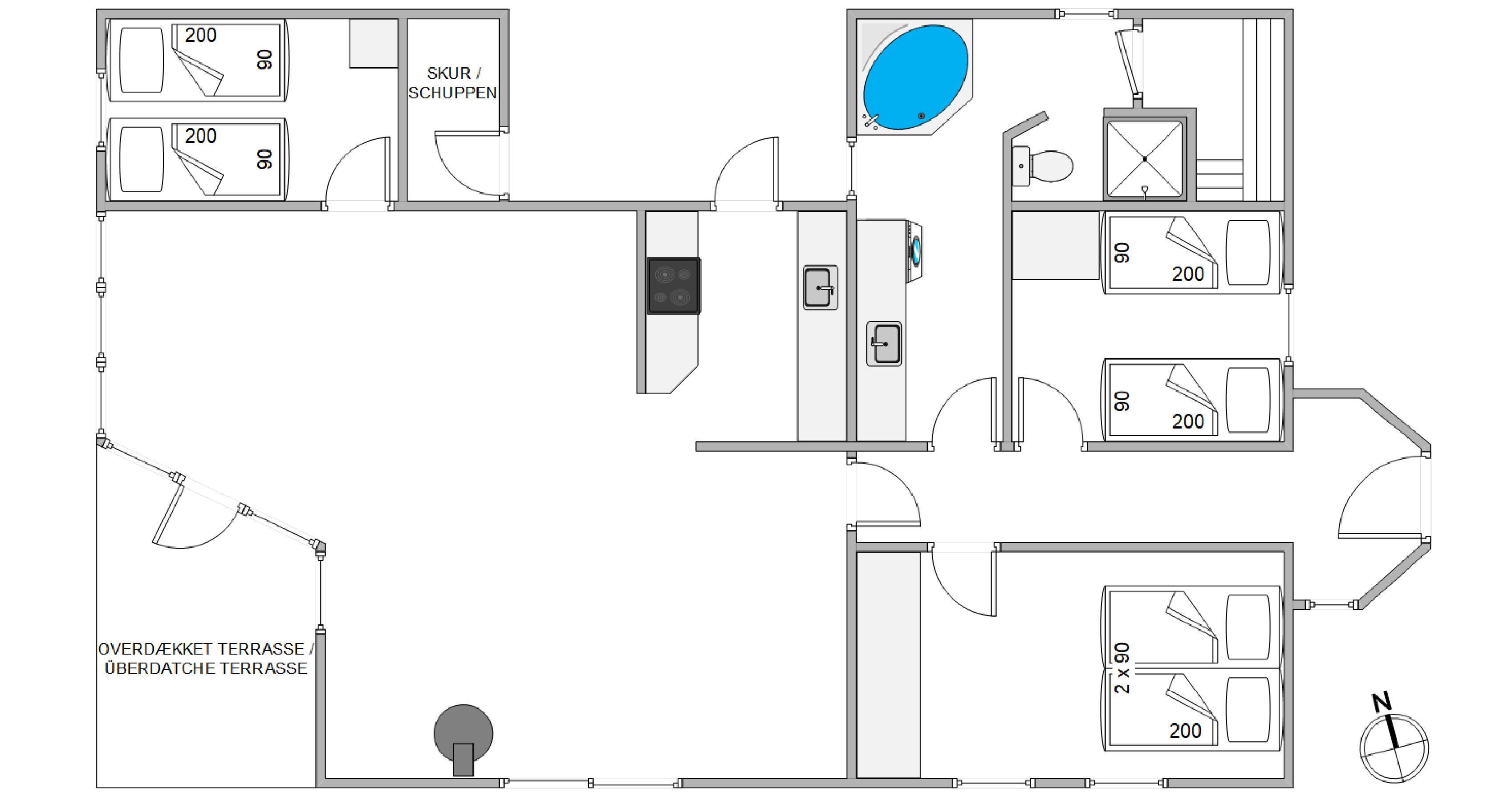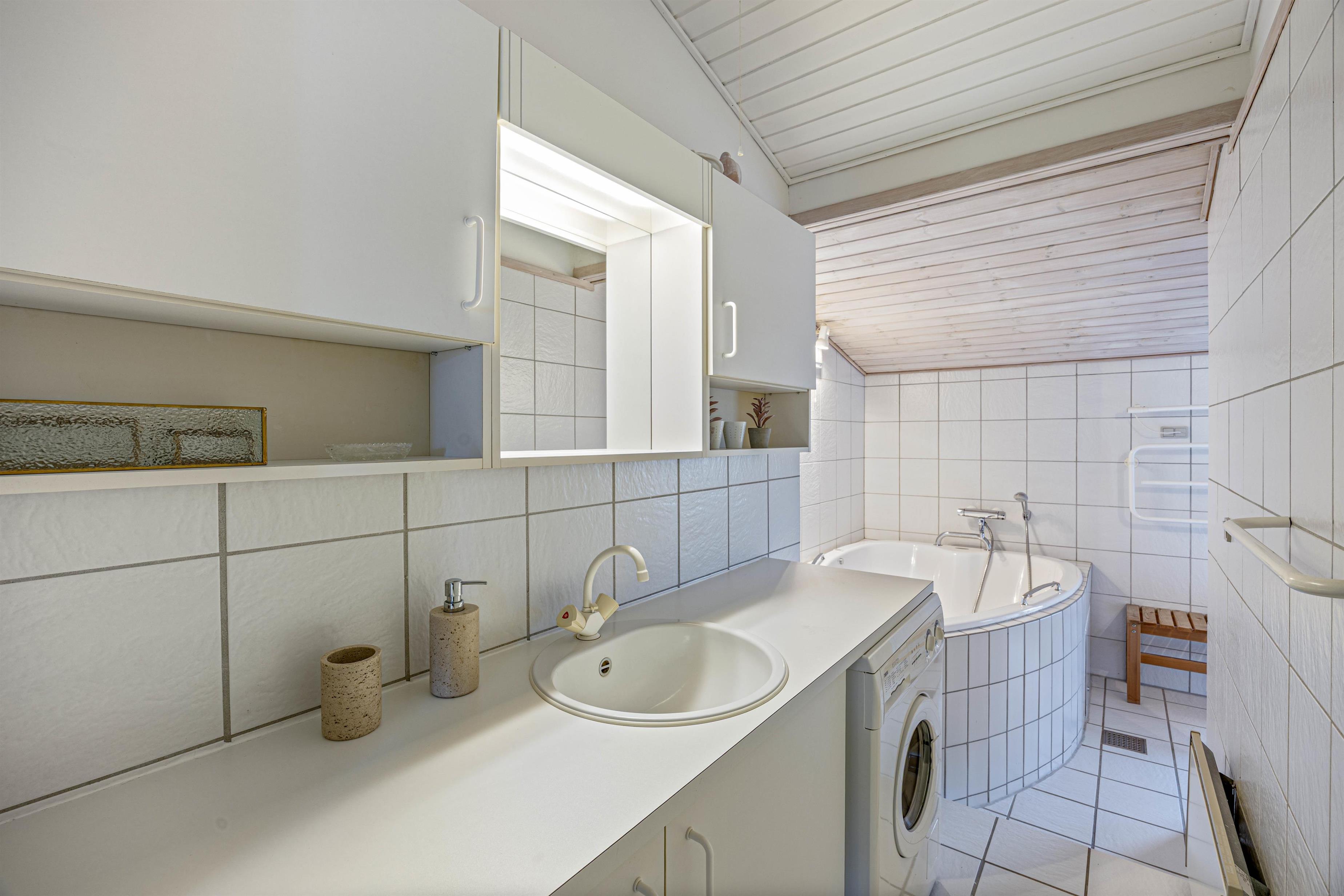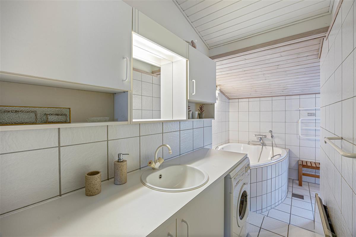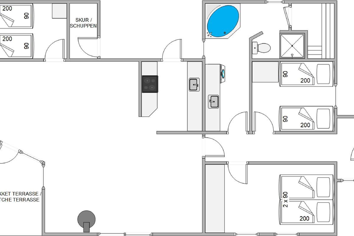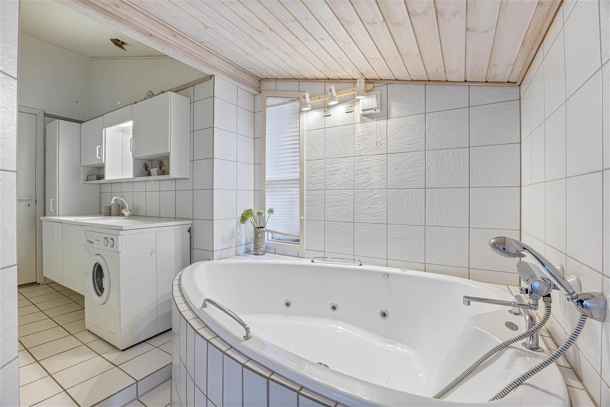 The holiday home at Troldedalen 23 in Houvig offers ample sleeping accommodation across three bedrooms - one with a double bed and two with twin beds each. The bathroom features two of the holiday home's highlights: the sauna and whirlpool. Here you can lean back, relax and forget everyday stress while enjoying the warmth and recharging your batteries. The bathroom also features underfloor heating, and an energy-efficient heat pump ensures a comfortable indoor climate throughout.