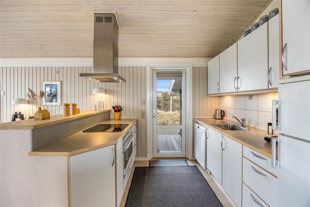 In the living room, you'll find a cosy wood-burning stove where you can warm up on cooler days, creating that typical holiday home atmosphere. From the sofa, large panoramic windows flood the house with sunlight and offer wonderful views of the surrounding landscape. The sofa area is perfectly positioned to be part of the action, helping plan the next day's activities. The dishwasher takes care of cleaning up in no time, and there's plenty of space to chat over drinks and play games while dinner is cooking.