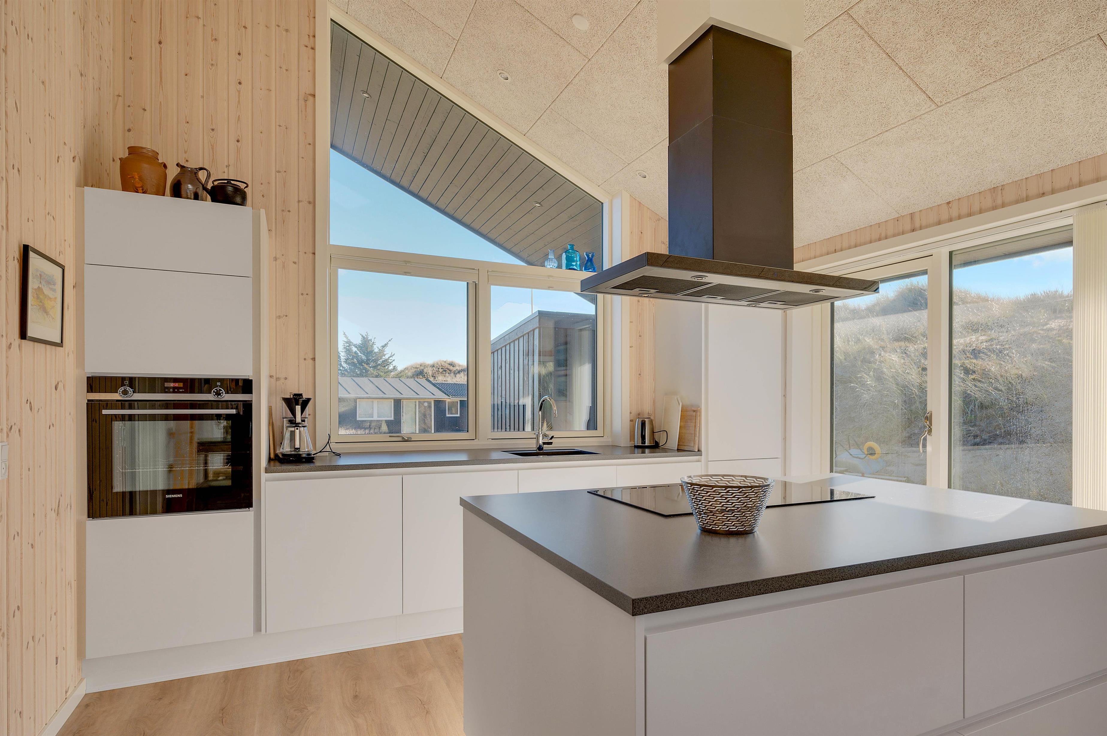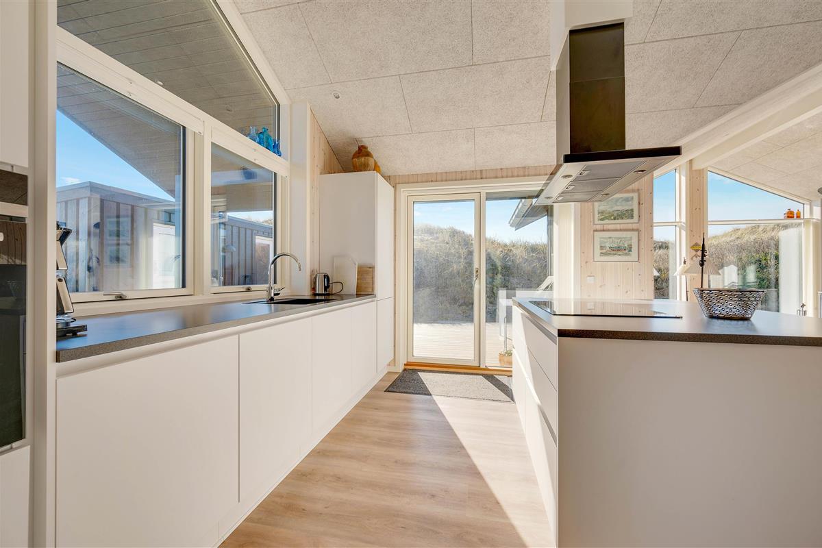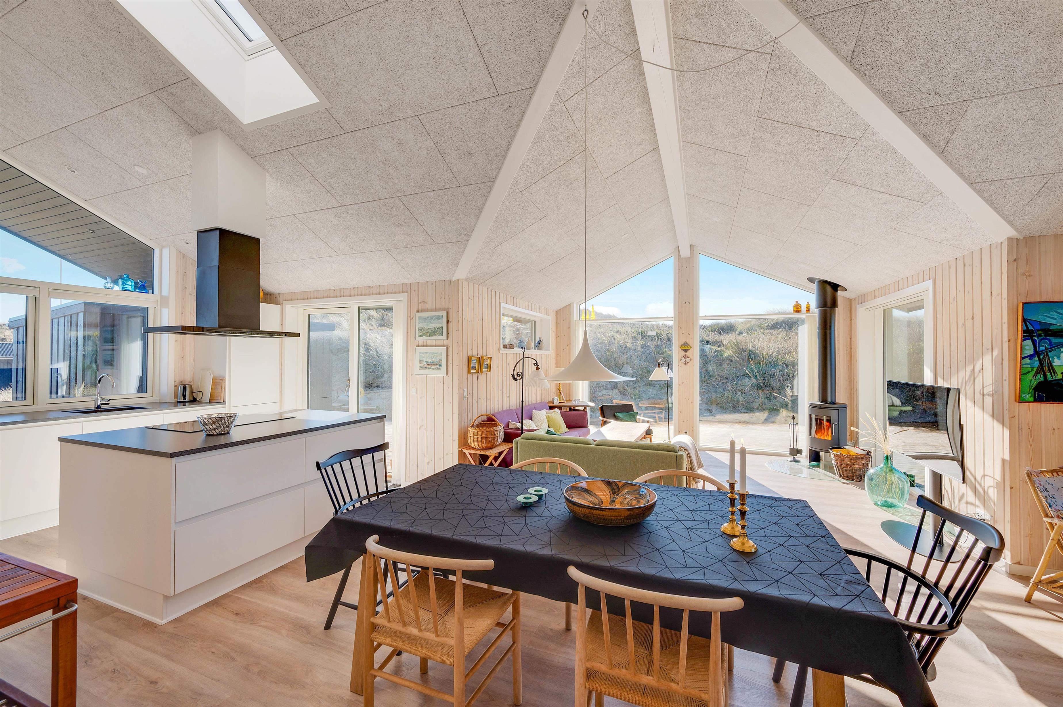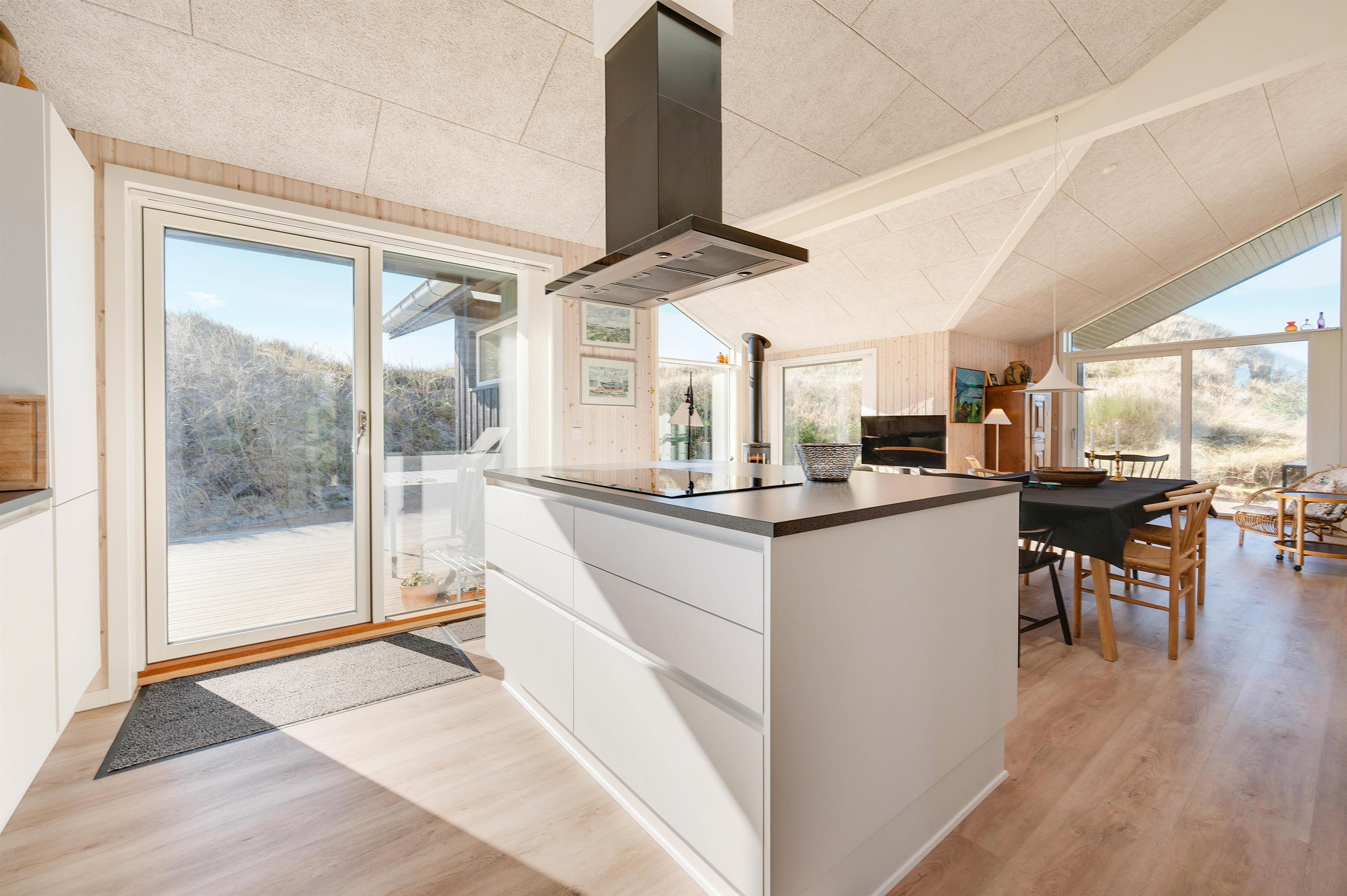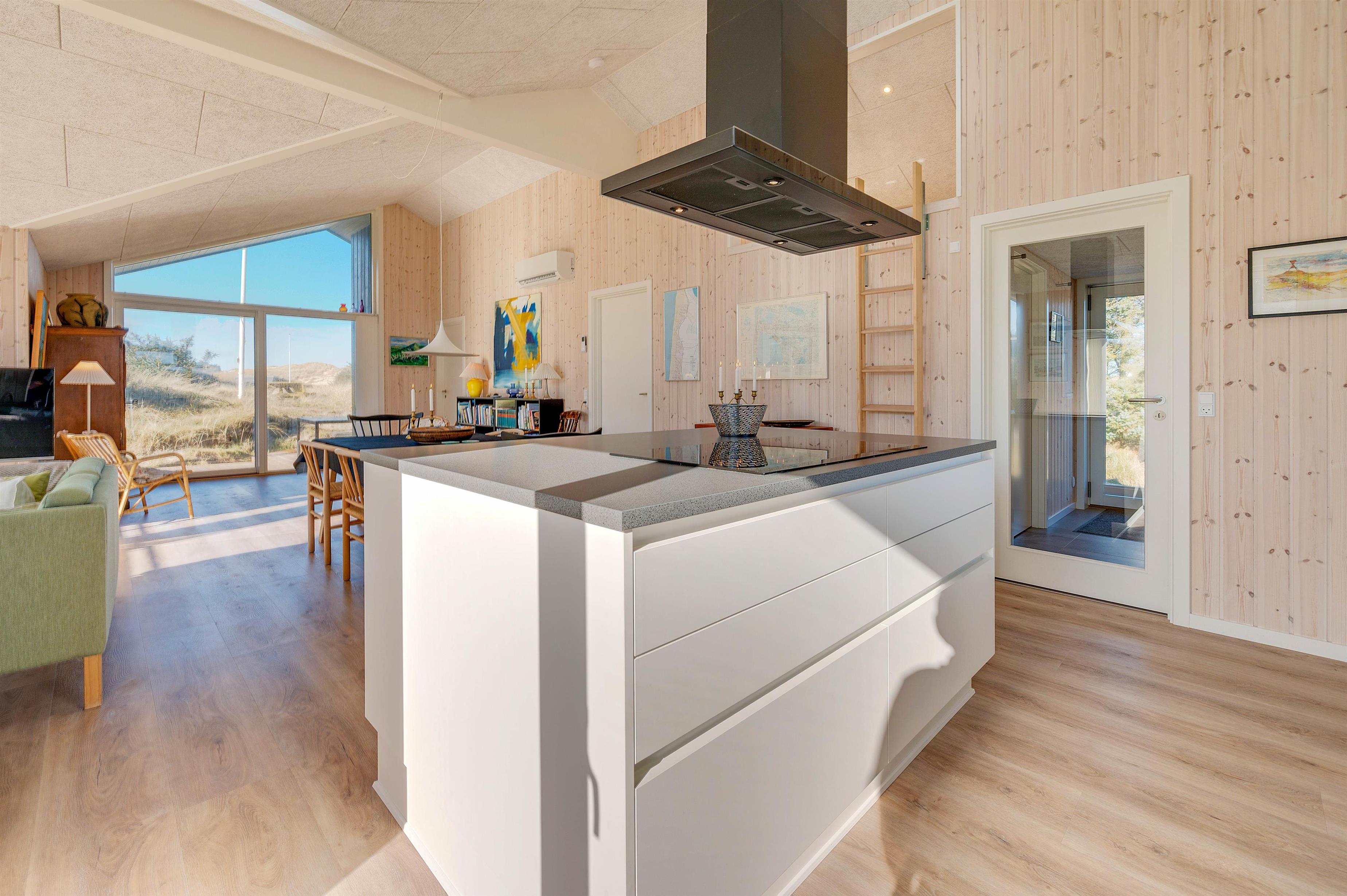 The large windows offer wonderful views of your natural grounds from every angle, showcasing the beautiful dune and natural landscape of Denmark's west coast. Whether you're settling down with a good book or enjoying a relaxing evening of television, the sofa area with its large window front invites you to spend cosy evenings in comfort. For warmth, you can light the wood-burning stove and listen to the crackling fire, or alternatively use the cost-effective heat pump. The modern kitchen is well-equipped with all necessities and perfect for social cooking around the island.