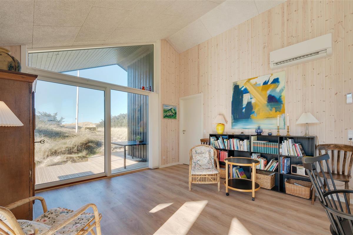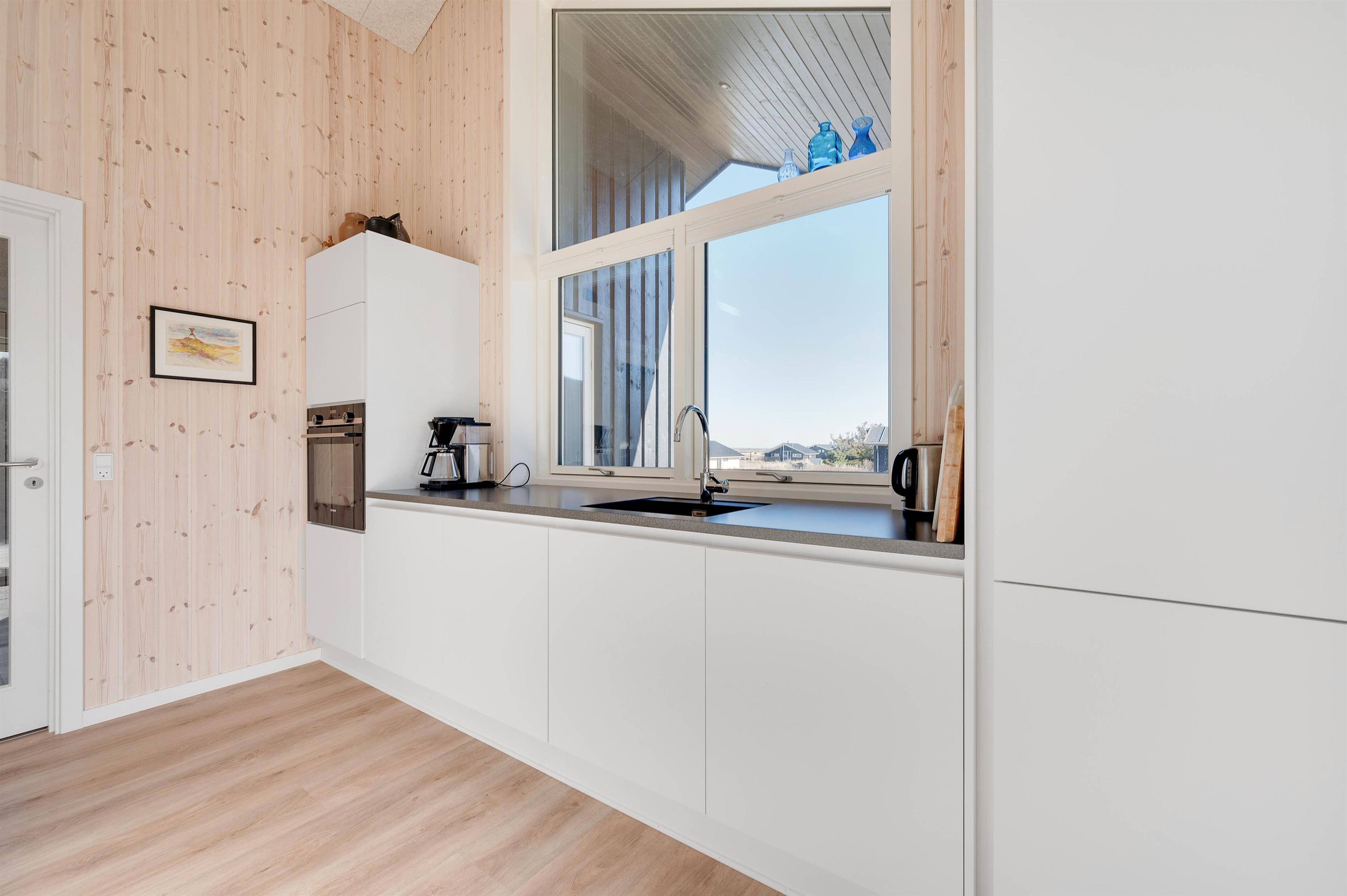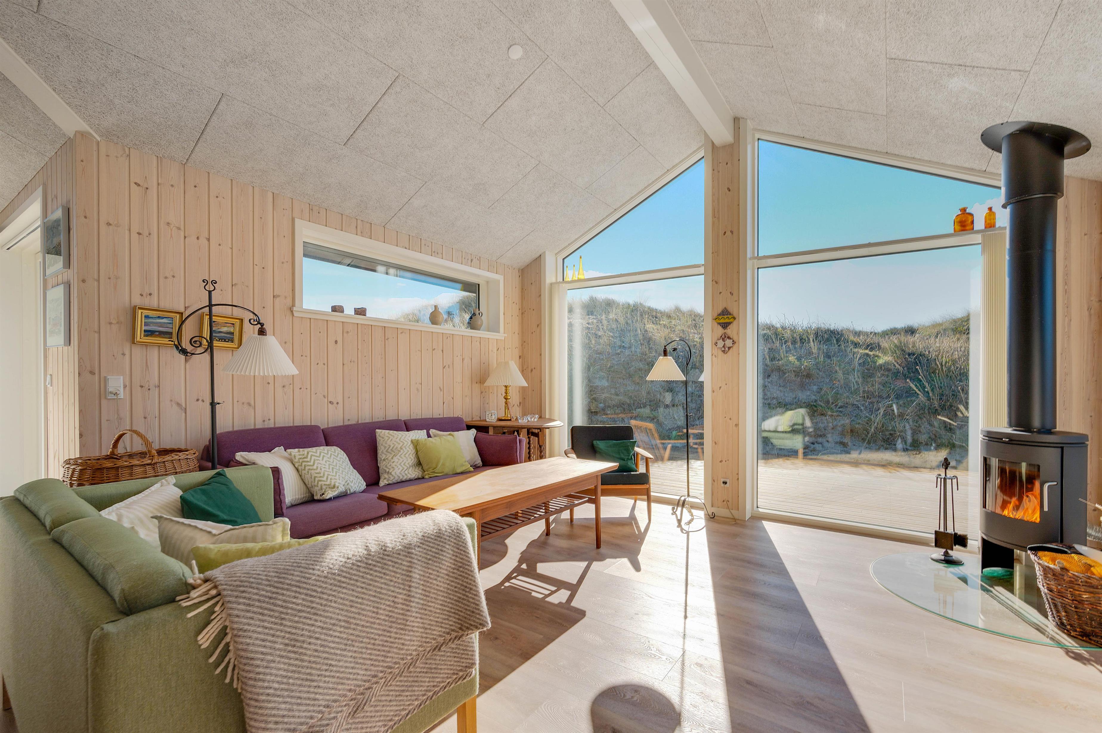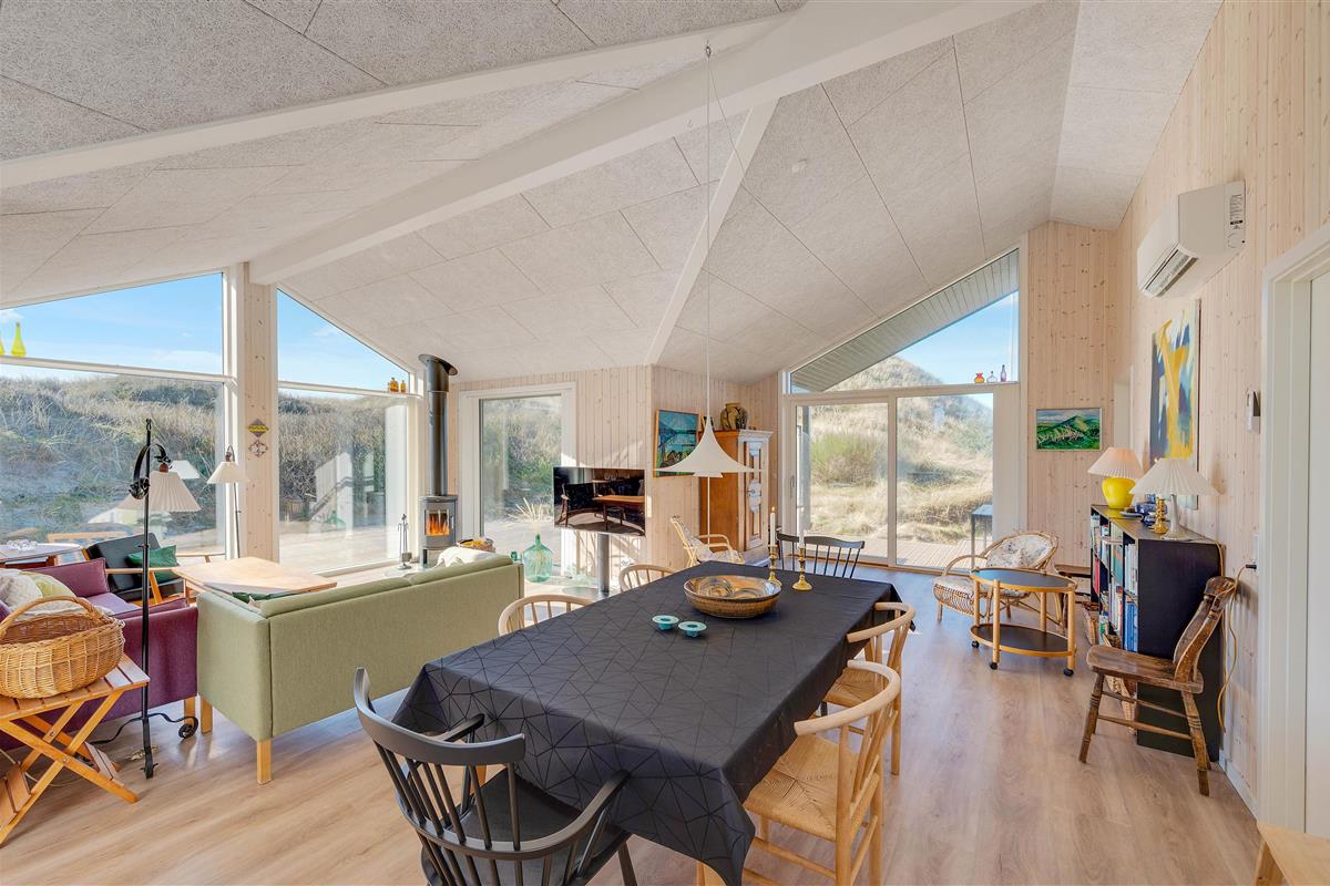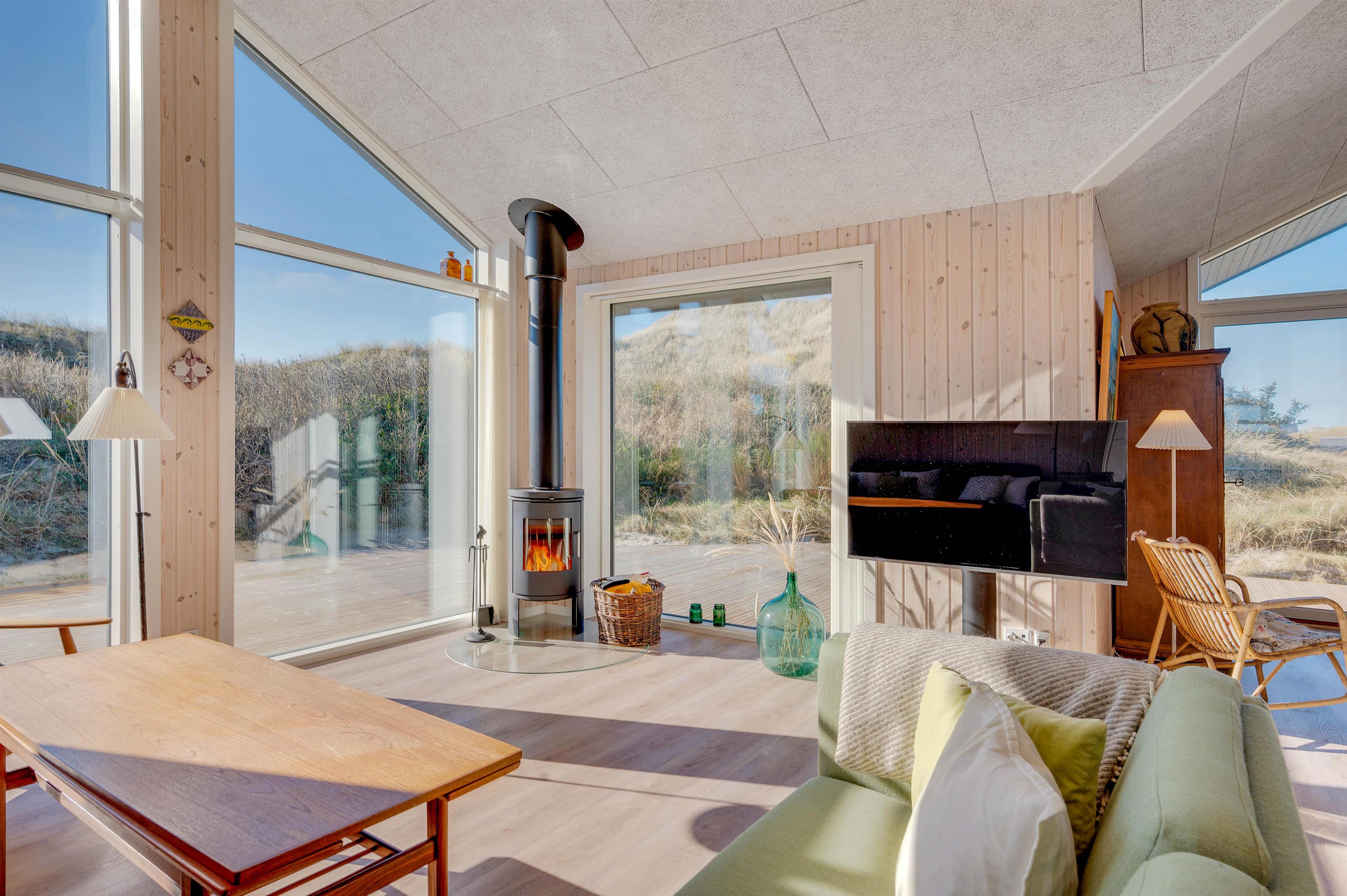 The large windows offer wonderful views of your natural grounds from every angle, showcasing the beautiful dune and natural landscape of Denmark's west coast. Whether you're settling down with a good book or enjoying a relaxing evening of television, the sofa area with its large window front invites you to spend cosy evenings in comfort. For warmth, you can light the wood-burning stove and listen to the crackling fire, or alternatively use the cost-effective heat pump. The modern kitchen is well-equipped with all necessities and perfect for social cooking around the island.