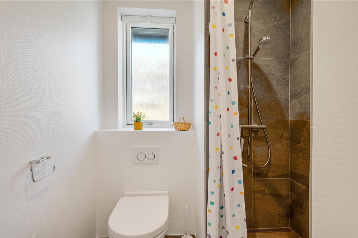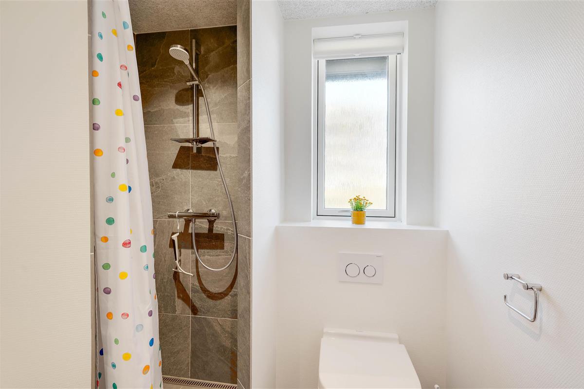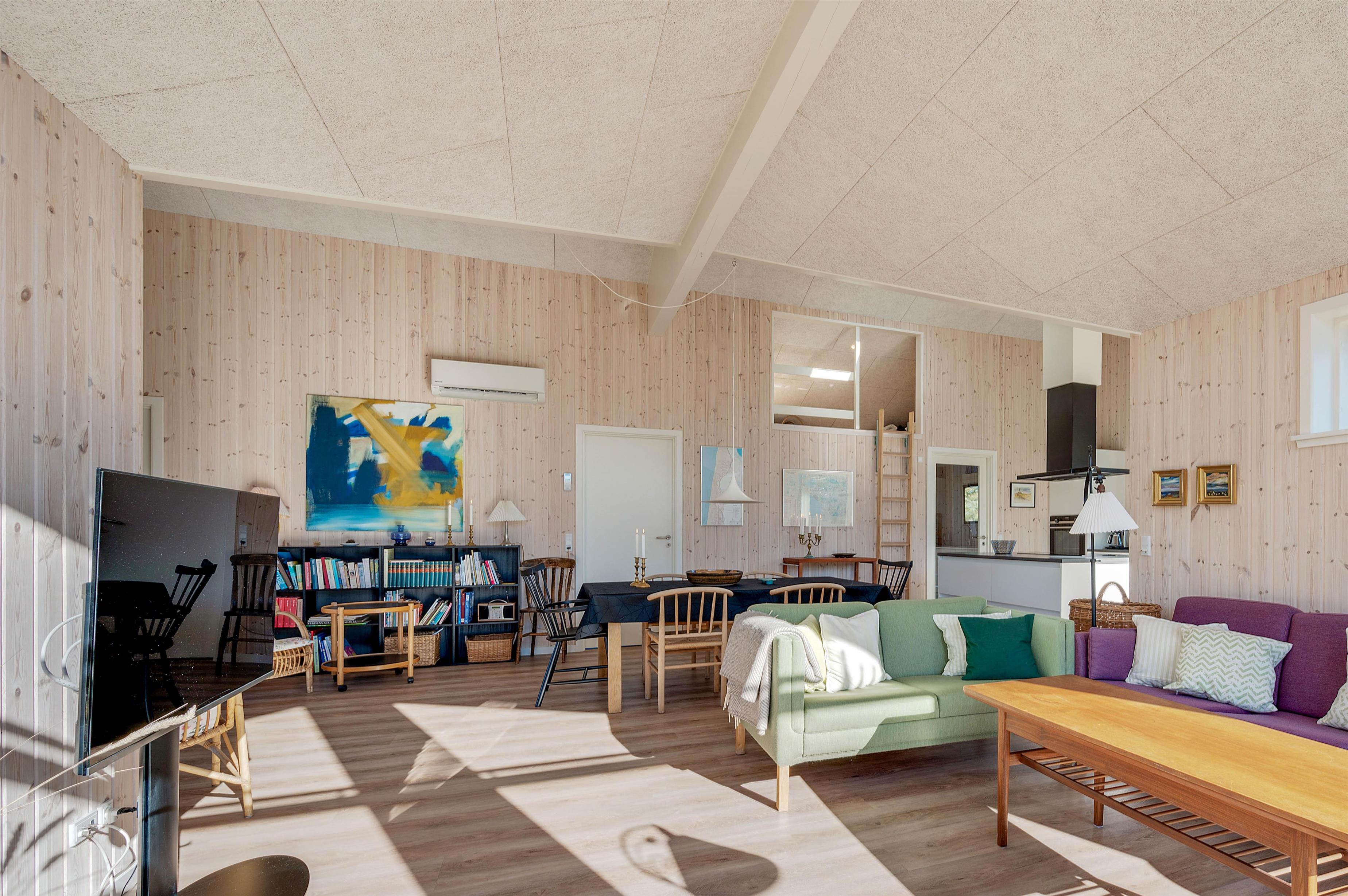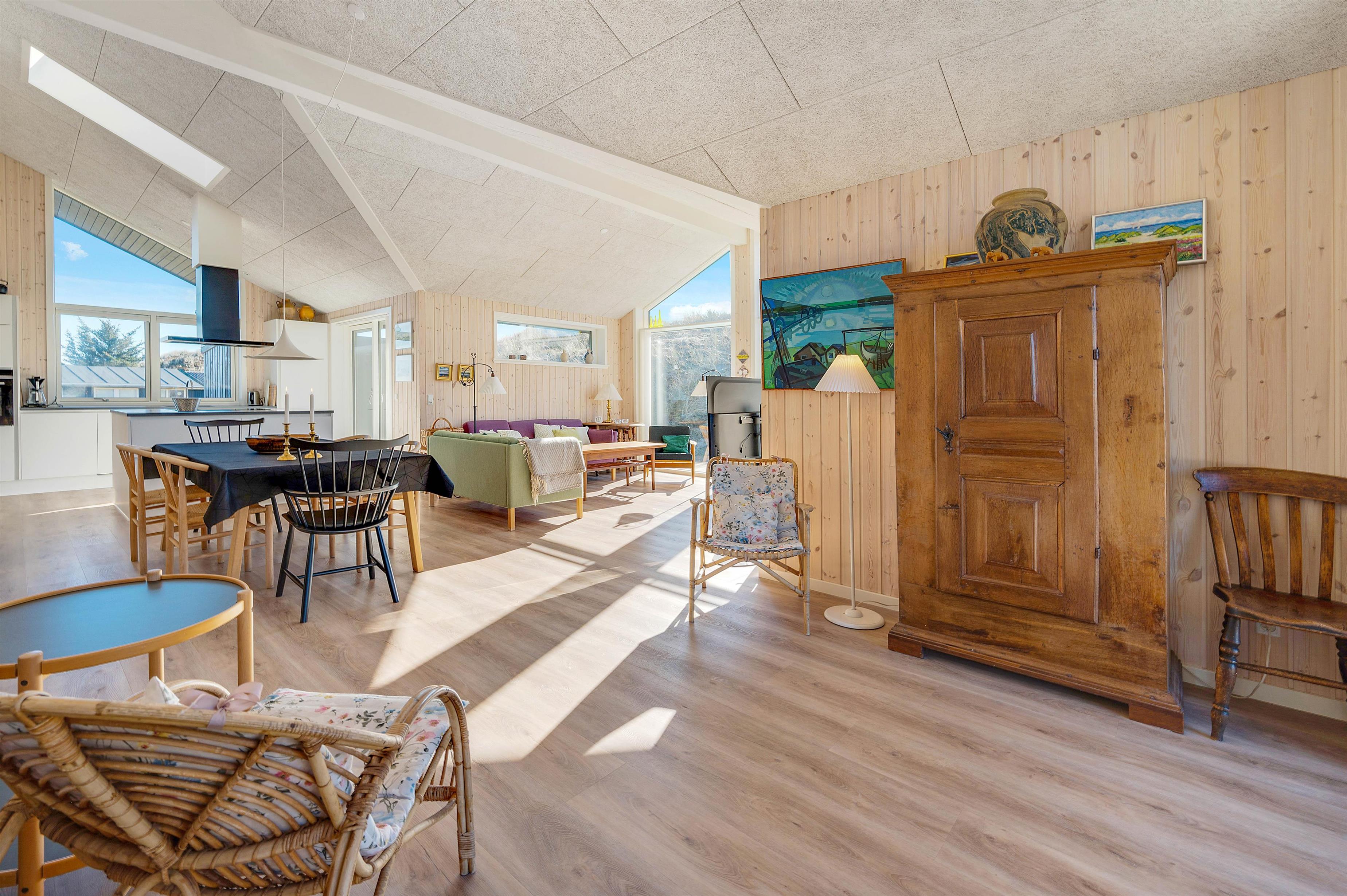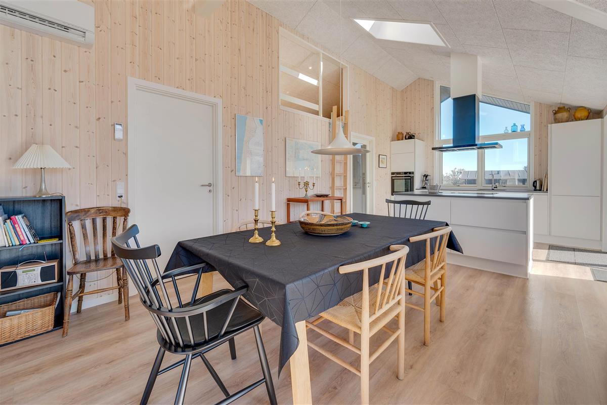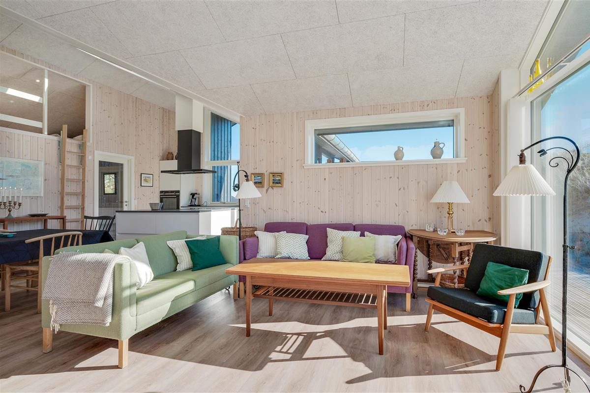 The large windows offer wonderful views of your natural grounds from every angle, showcasing the beautiful dune and natural landscape of Denmark's west coast. Whether you're settling down with a good book or enjoying a relaxing evening of television, the sofa area with its large window front invites you to spend cosy evenings in comfort. For warmth, you can light the wood-burning stove and listen to the crackling fire, or alternatively use the cost-effective heat pump. The modern kitchen is well-equipped with all necessities and perfect for social cooking around the island.