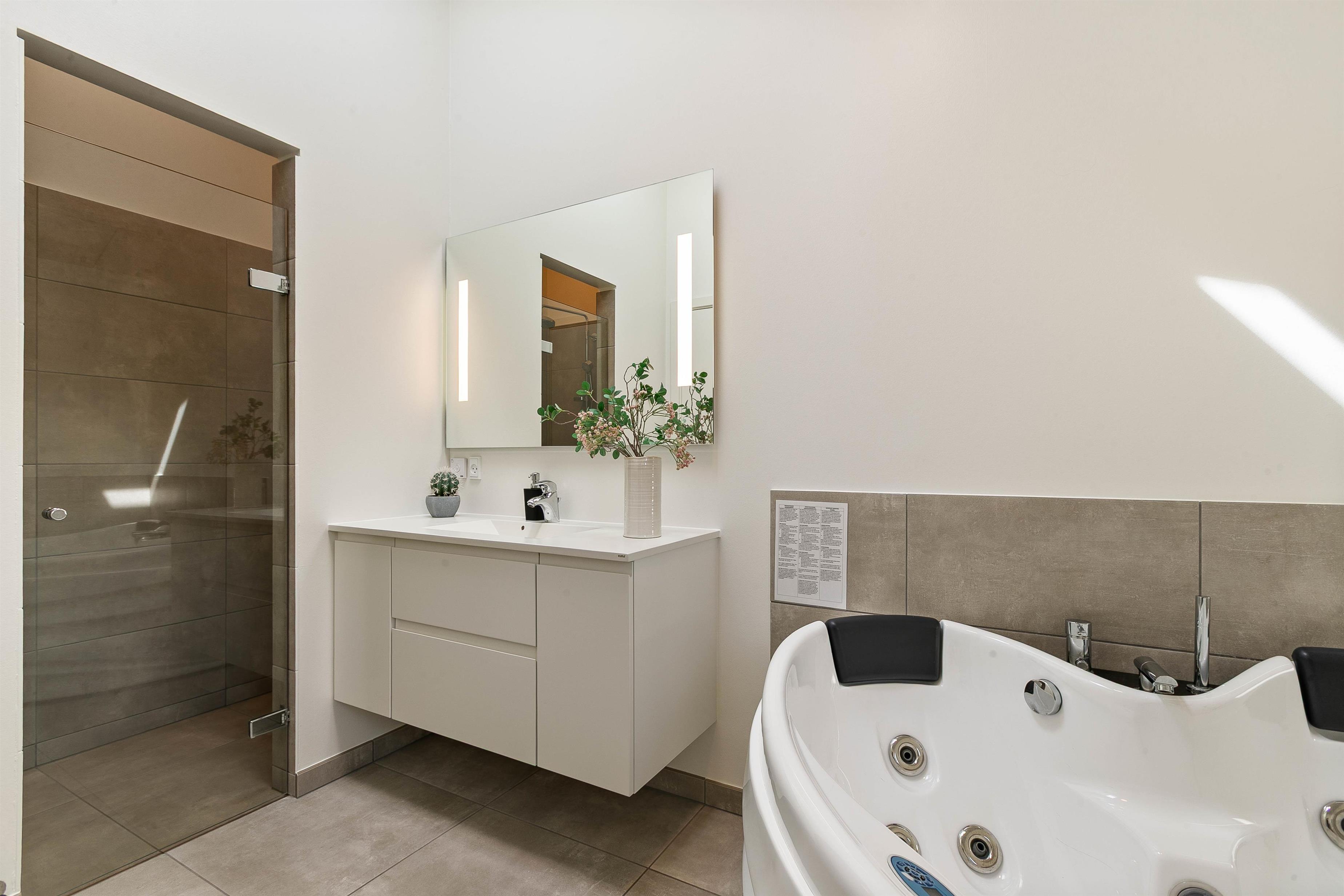 The holiday home features two bathrooms, with one en-suite to one of the bedrooms. The main bathroom offers a sauna and whirlpool for wellness indulgence, allowing holiday relaxation to spread throughout your body.