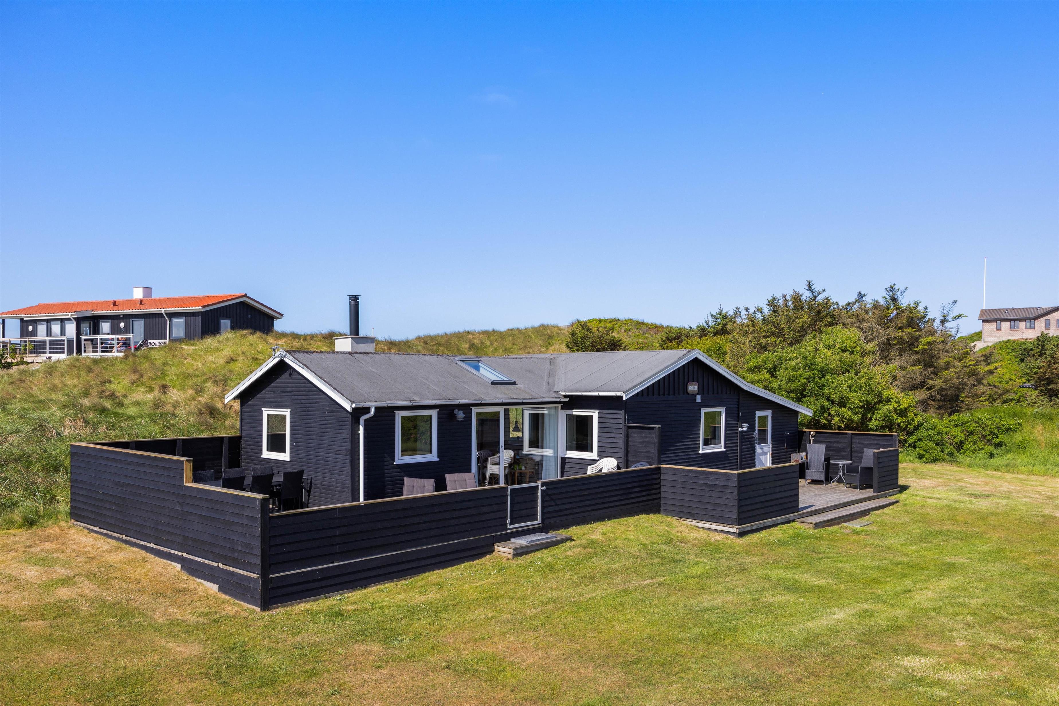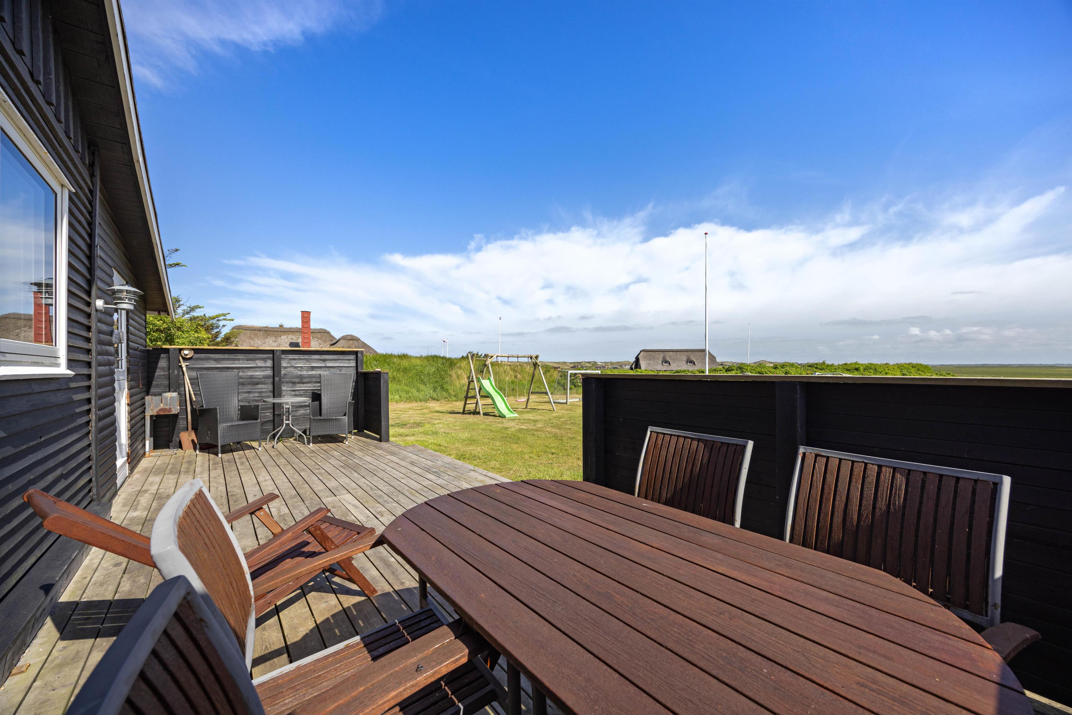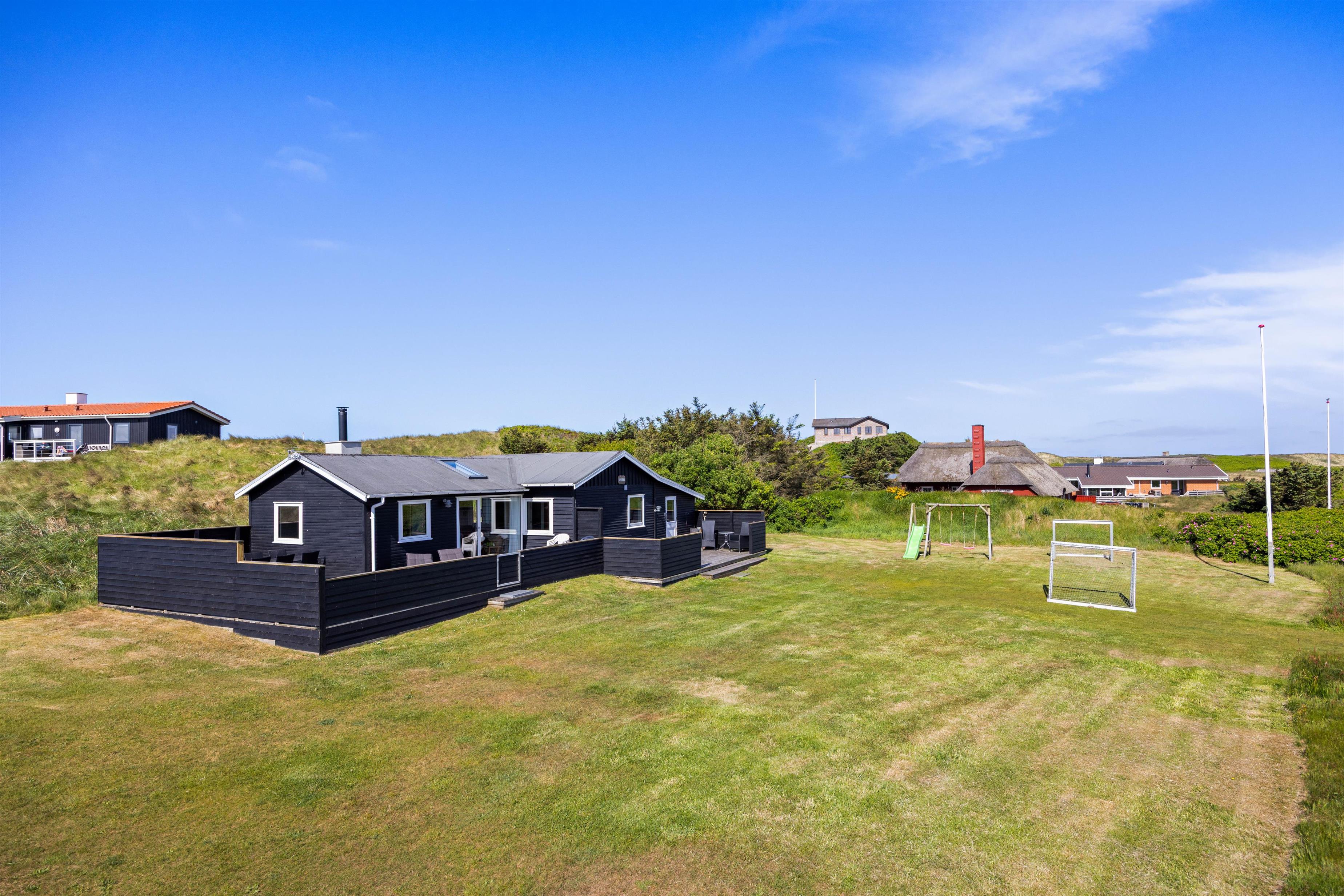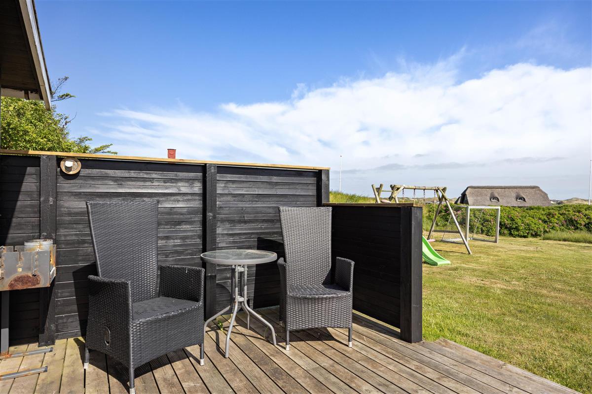 From the sheltered east-facing terrace, you can enjoy your morning coffee while watching the sunrise over the meadows of Denmark's West Coast. Protected from the wind, it's perfect for family barbecues. While dinner is cooking, children can play freely in the large natural grounds.