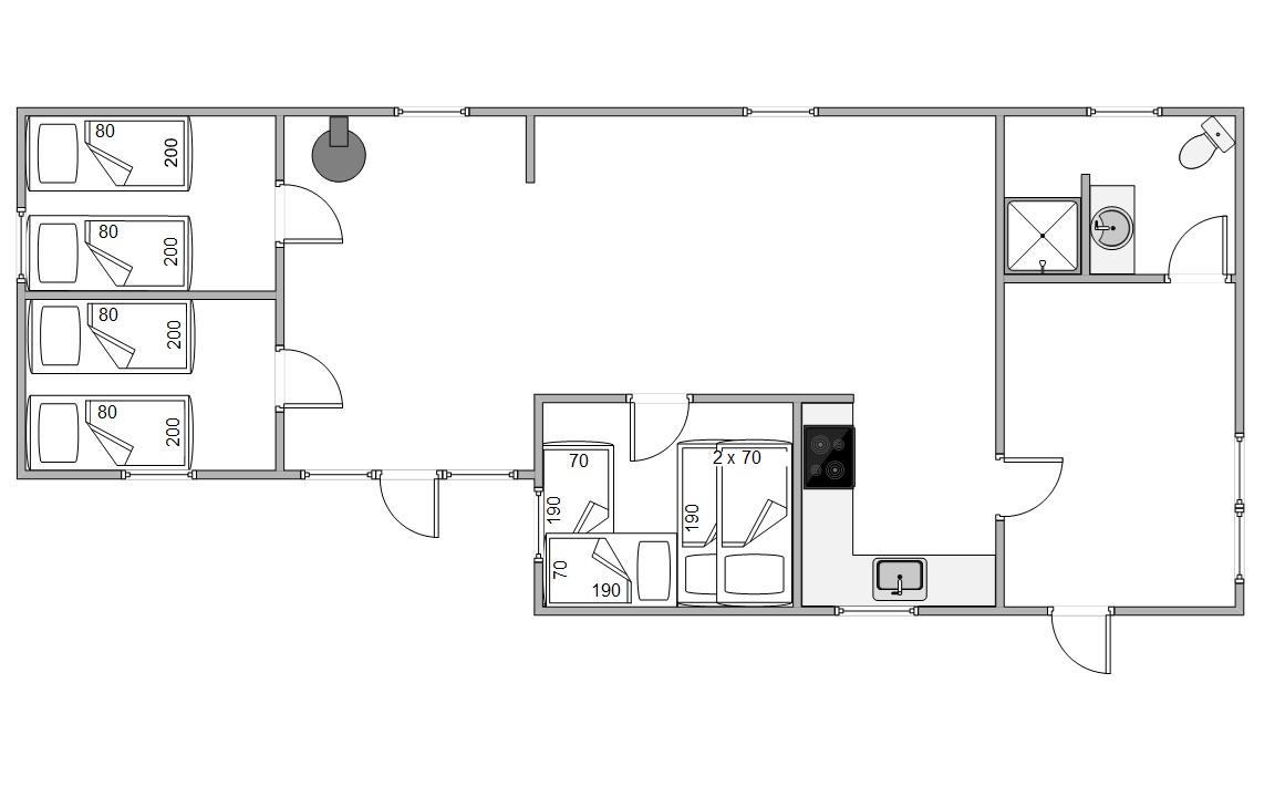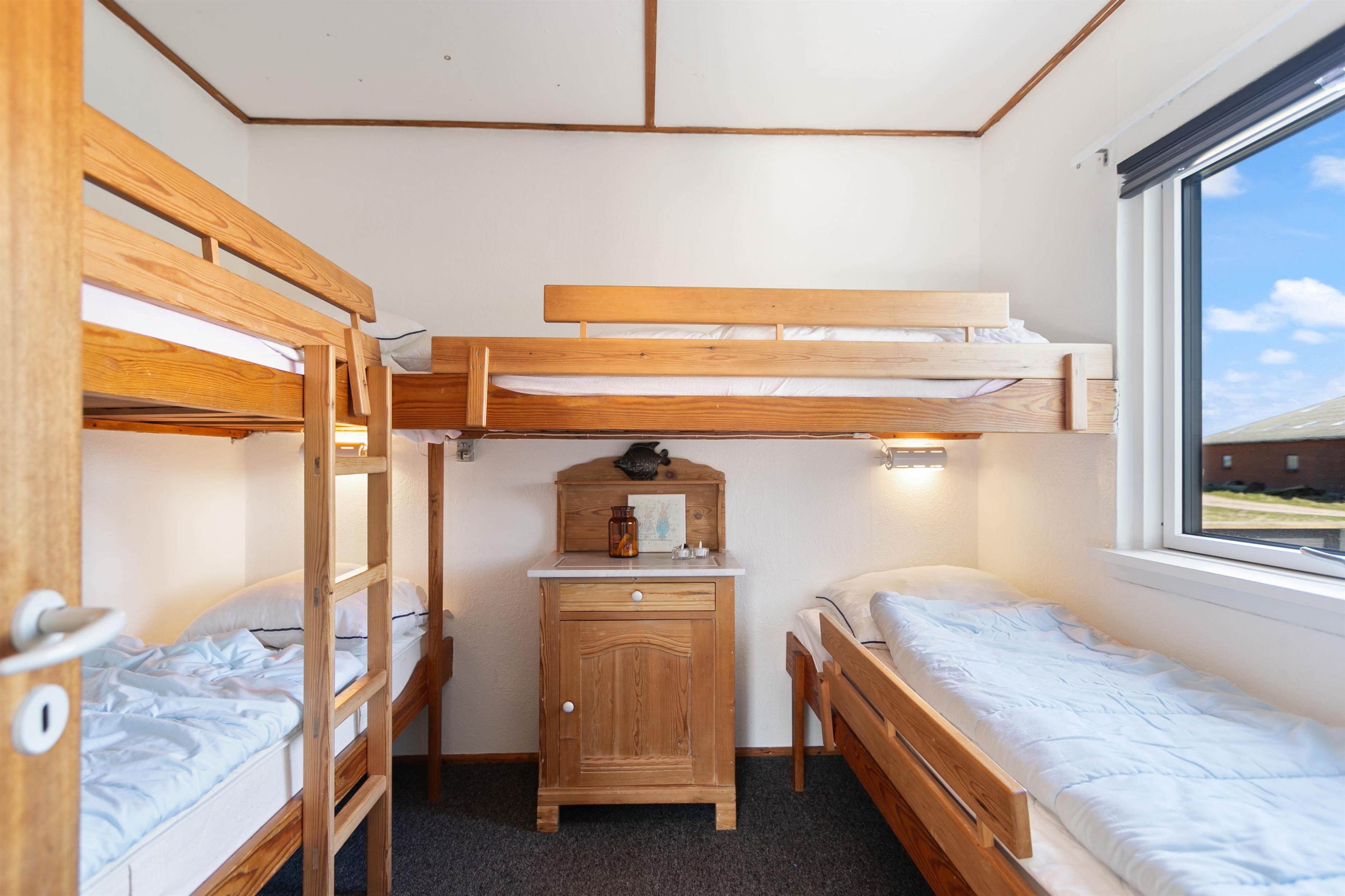 The sleeping arrangements are divided into three bedrooms: two with single beds and one with both single and bunk beds. Children can have their own space to enjoy and play.