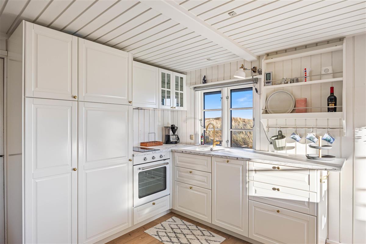 The atmosphere exudes true country cottage charm, enhanced by the crackling wood-burning stove, panelled walls, and magnificent views from every window. You'll truly feel connected to the West Jutland landscape.