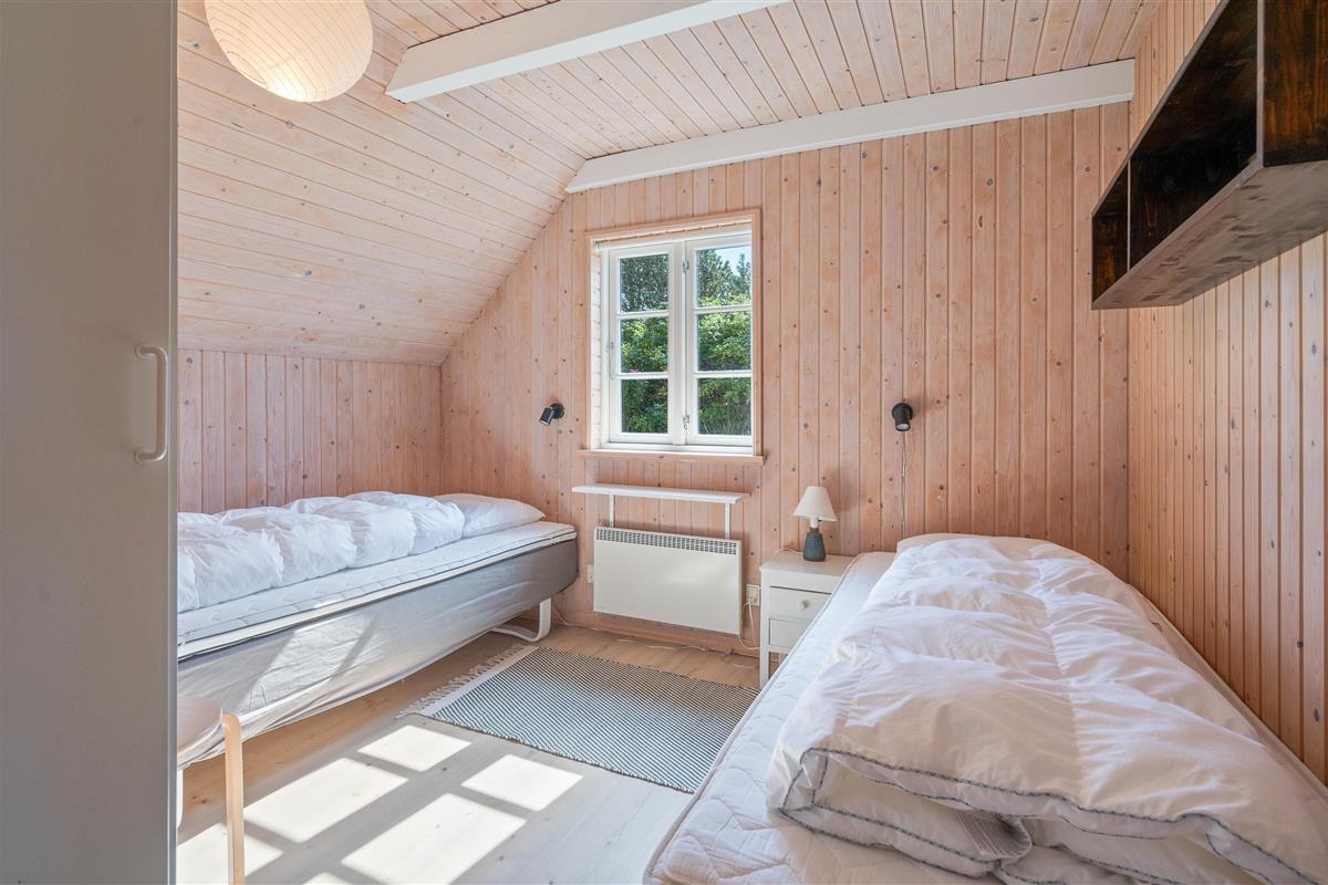 The holiday home features a bright and beautiful bathroom with double sinks, washing machine, shower and underfloor heating. Here you'll also find the house's sauna, particularly welcome after chilly days by the sea. There are 3 bedrooms in total in the Houvig holiday home. One room has a double bed, while the other two rooms each have 2 single beds.