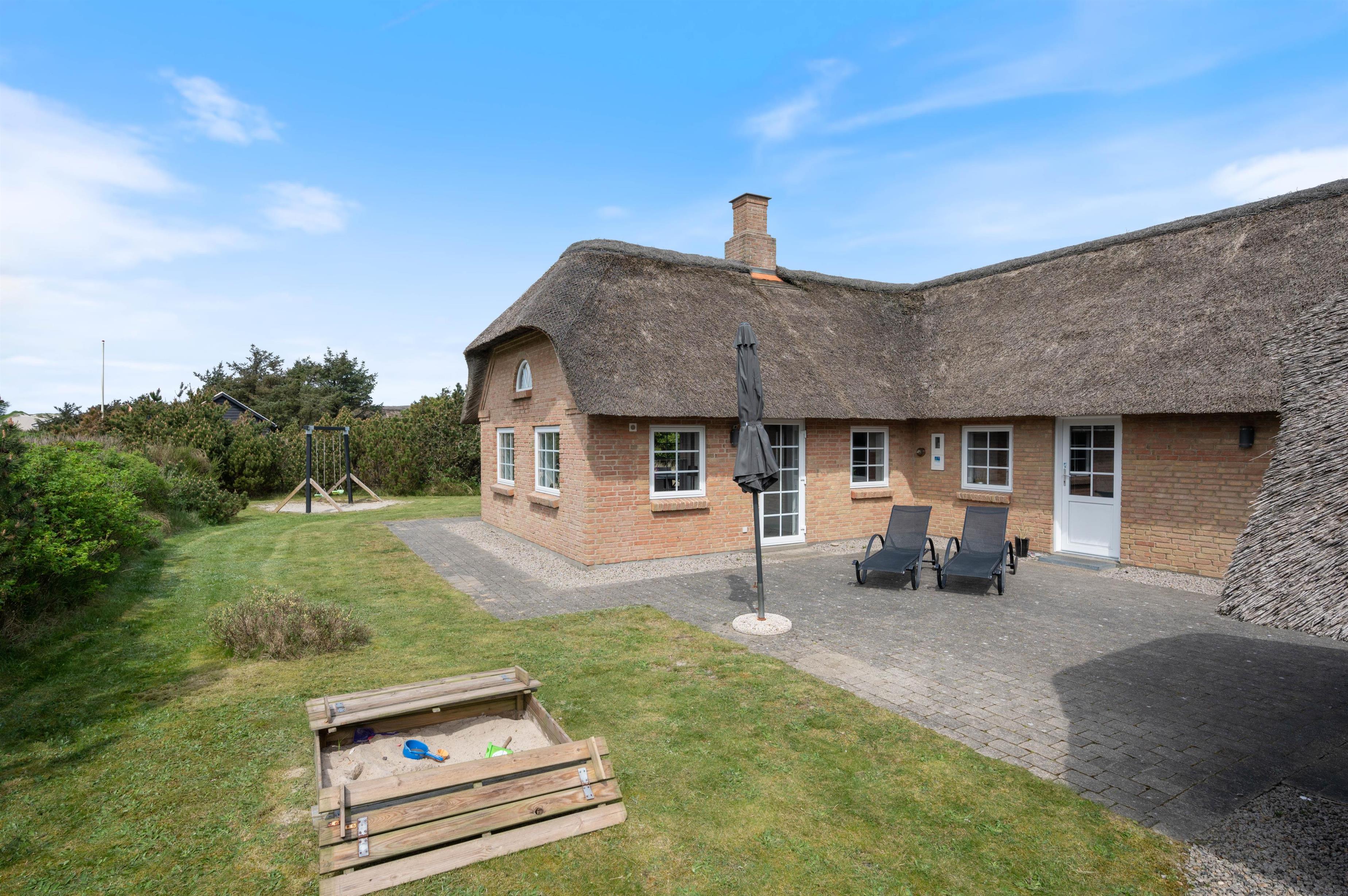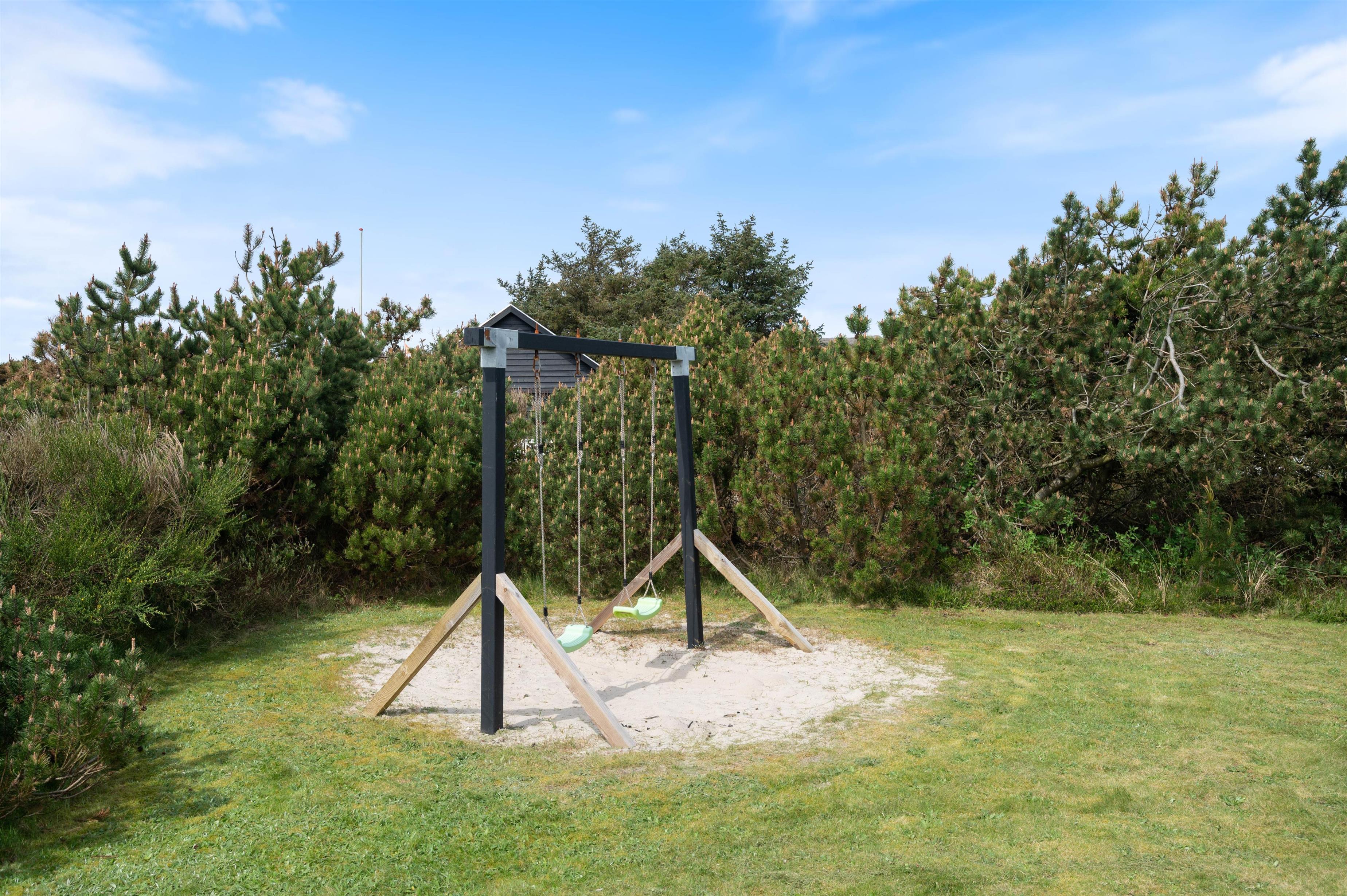 The holiday home at Skovdalen 15 offers a lovely outdoor area where you can spend sunny, warm holiday days. The space caters for all ages. Children can enjoy the sandpit and swing, while adults can relax on the terrace with its garden furniture and sun loungers, keeping a watchful eye.