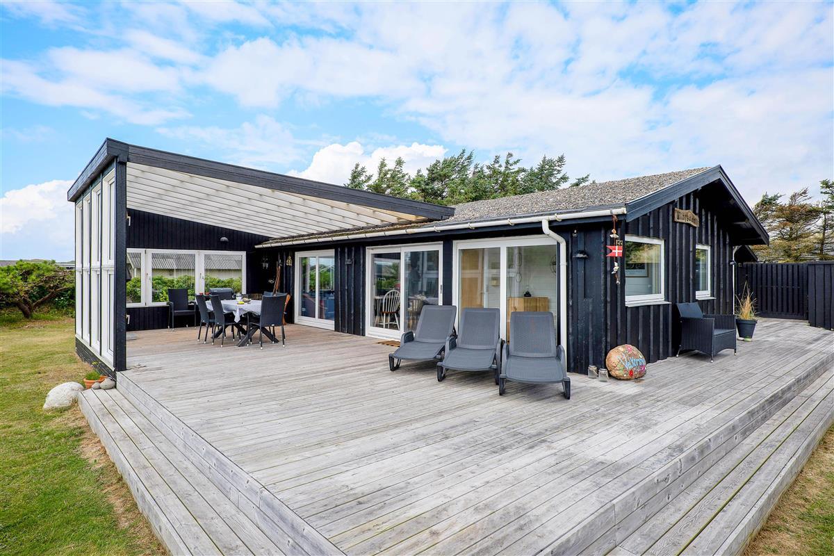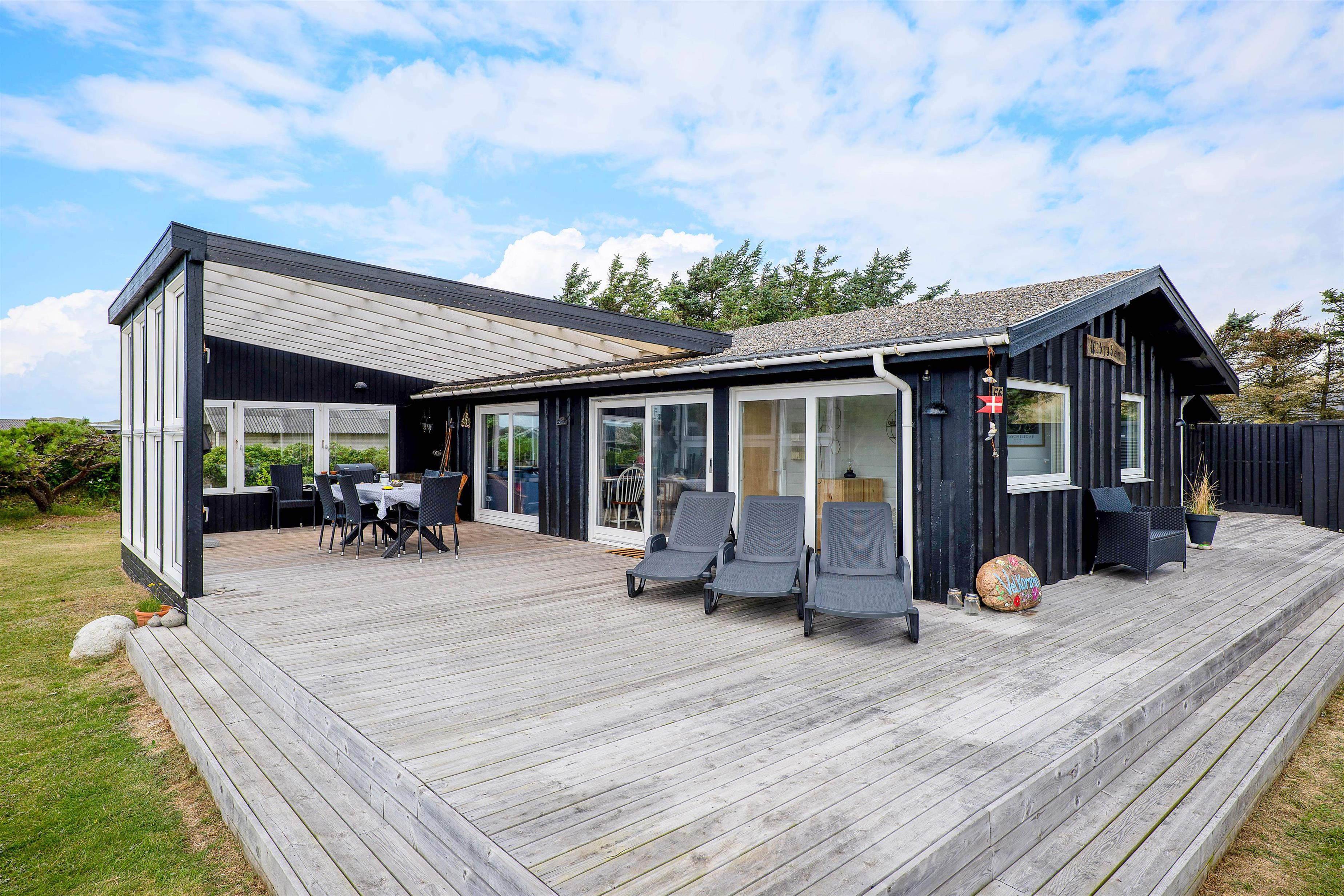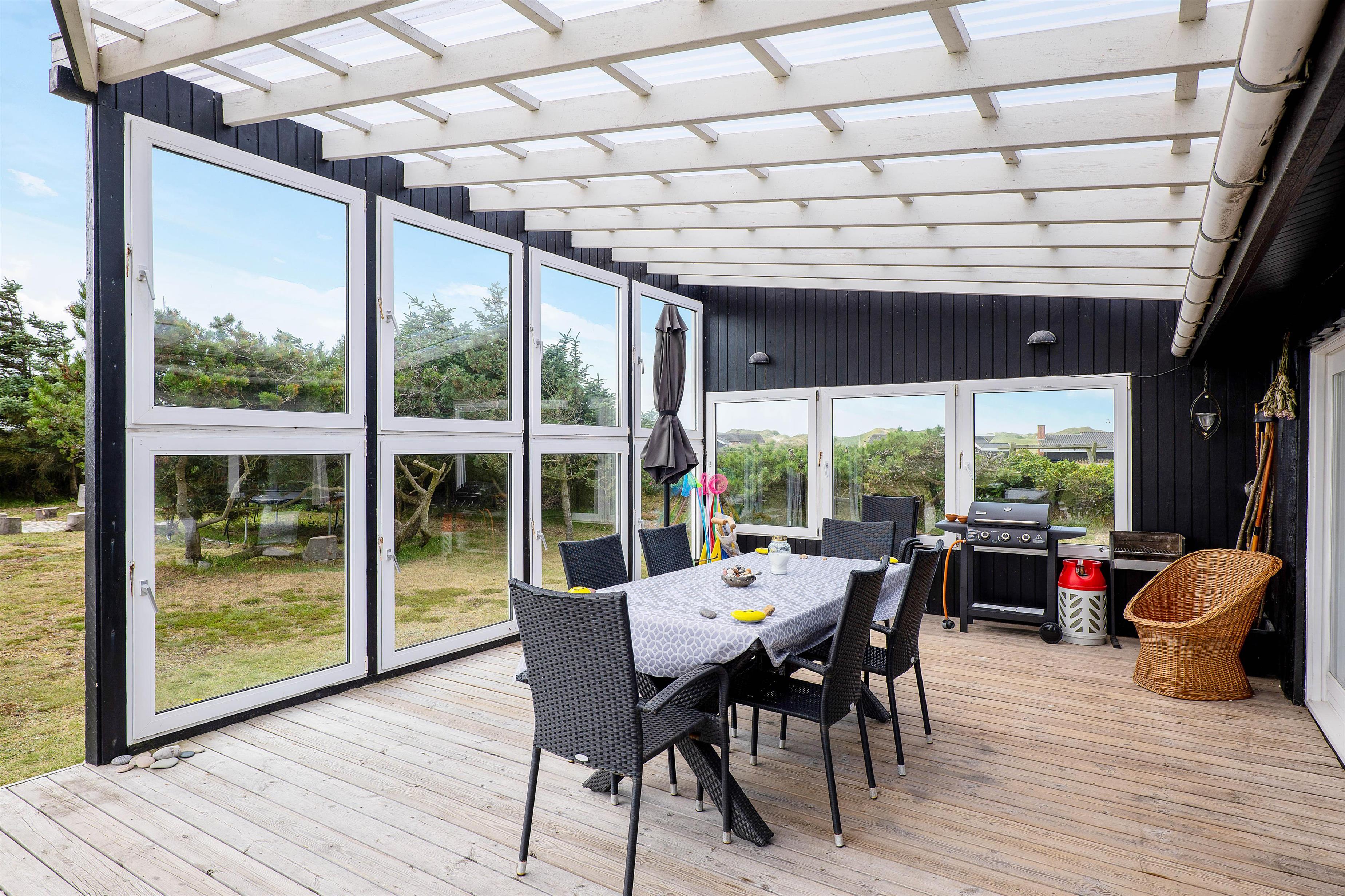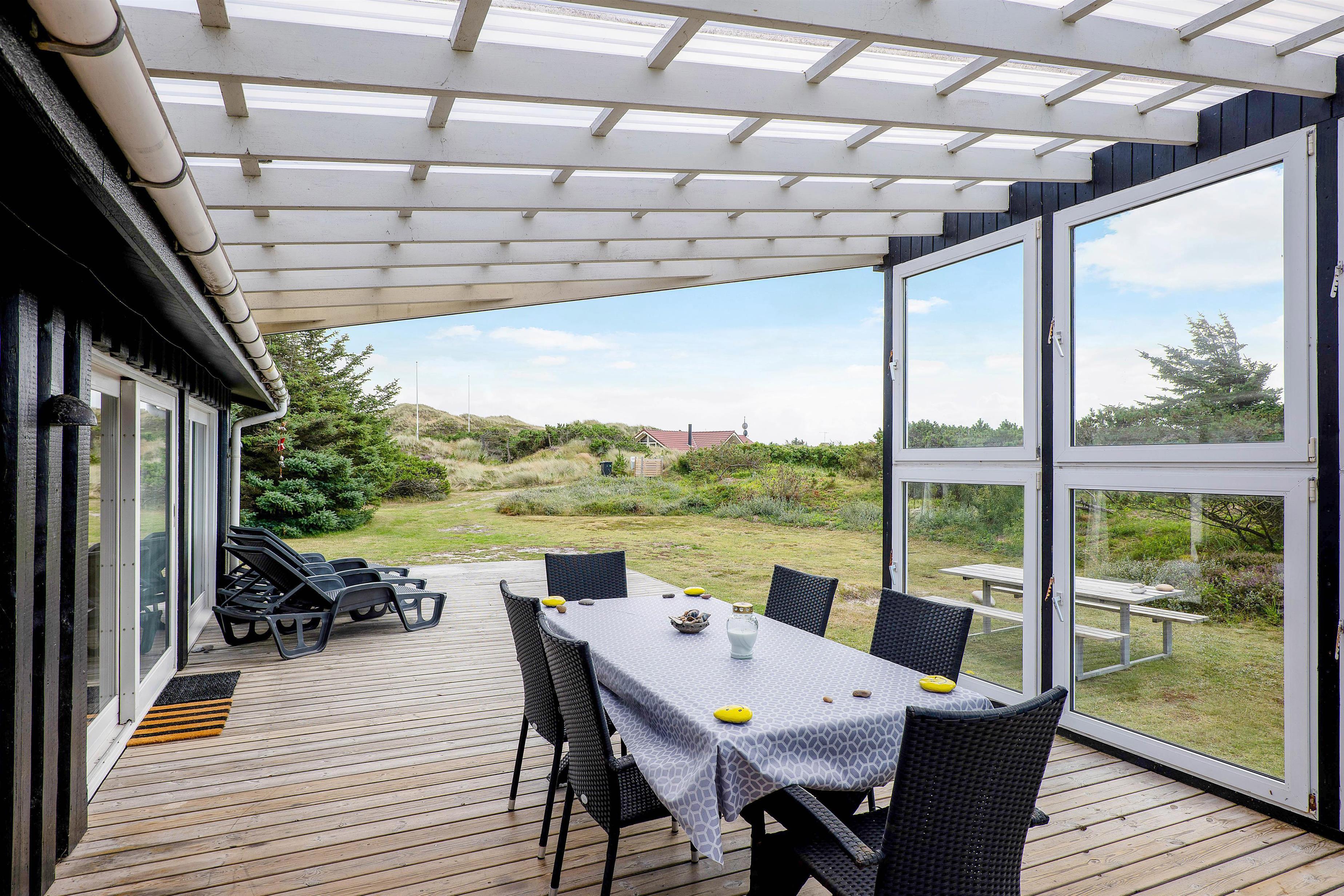 You can also enjoy your holiday on the large terrace that wraps around the entire house. Depending on the Danish weather, you can settle in various corners and angles of the terrace. On rainy days, you can enjoy listening to the rain drumming on the roof of the covered section of the terrace, located right outside the living room.