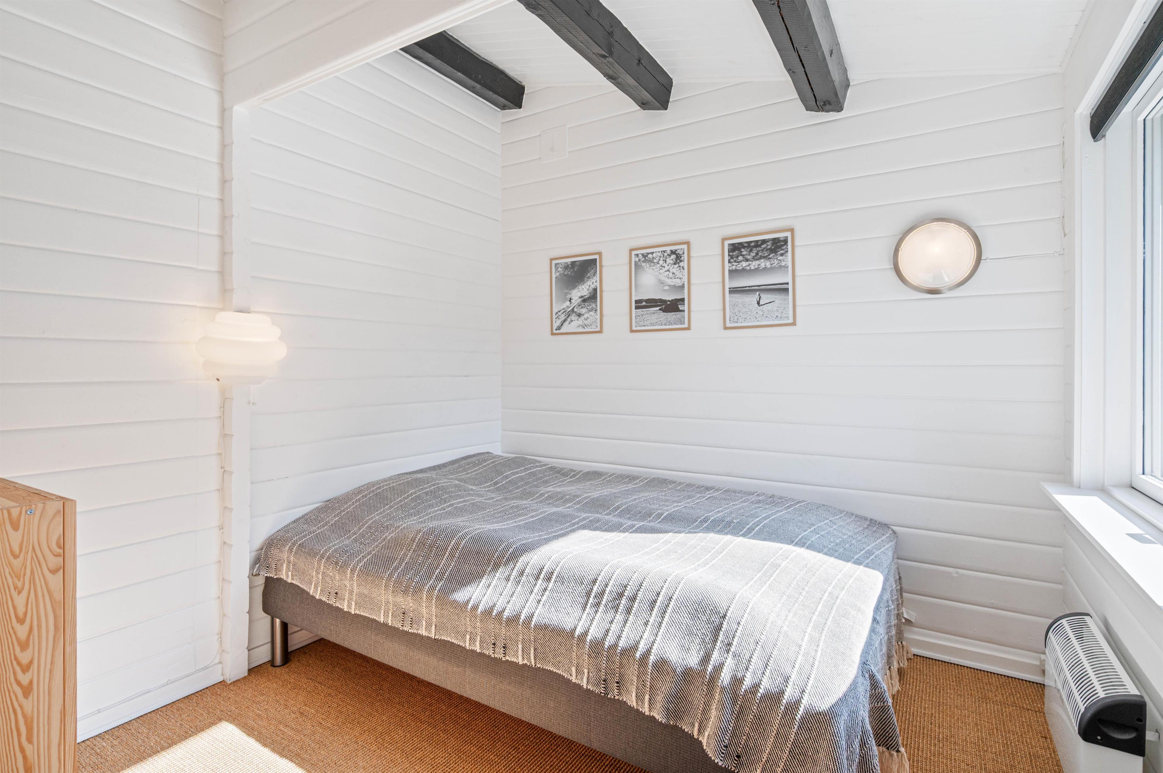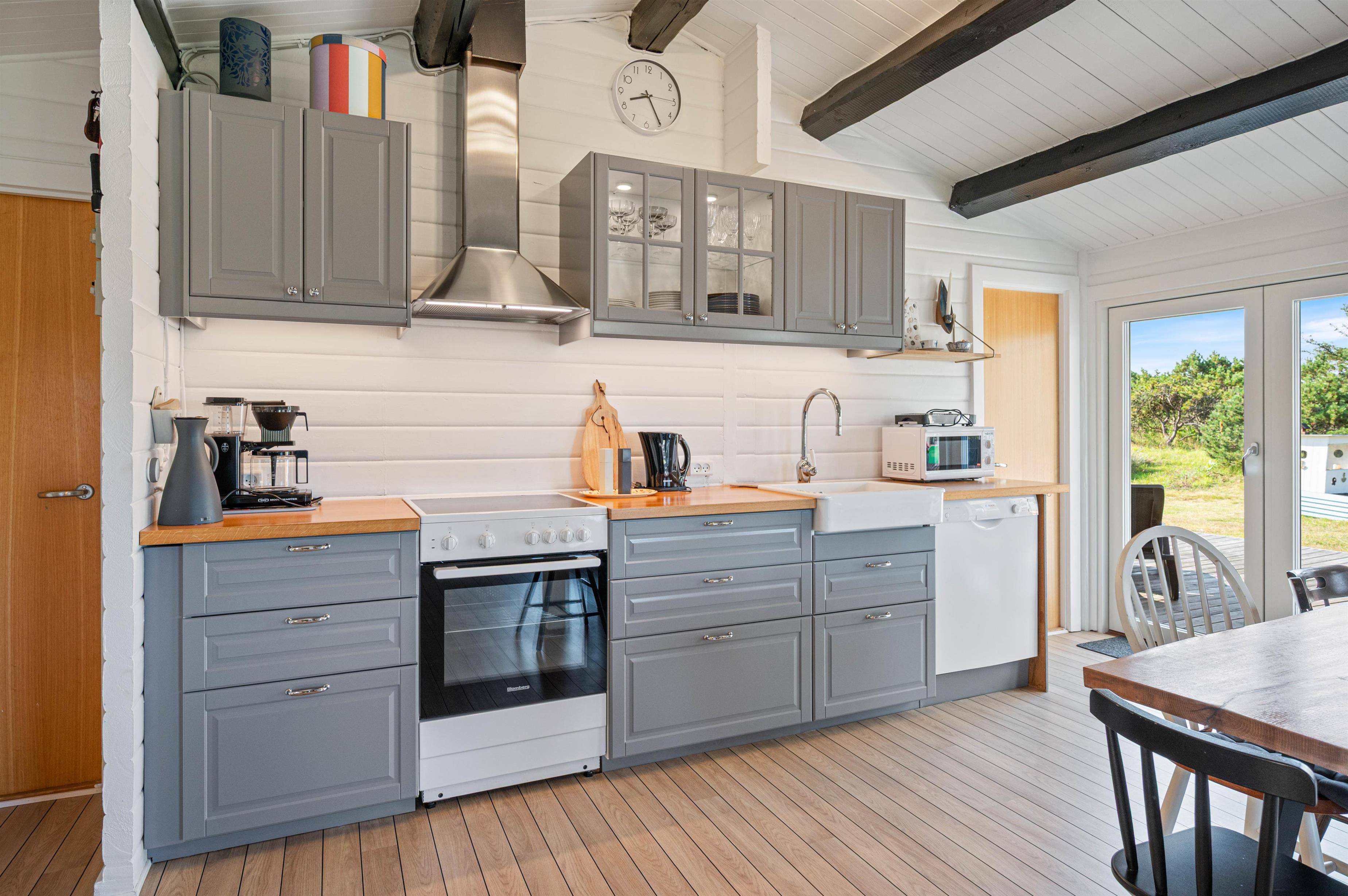 The distinctive atmosphere is enhanced by bright ceilings and walls, vaulted ceiling and exposed beams. The dark beams against the light ceiling create a striking contrast with the rest of the interior. The holiday home is bright and inviting, making you want to settle down comfortably on the sofa.
