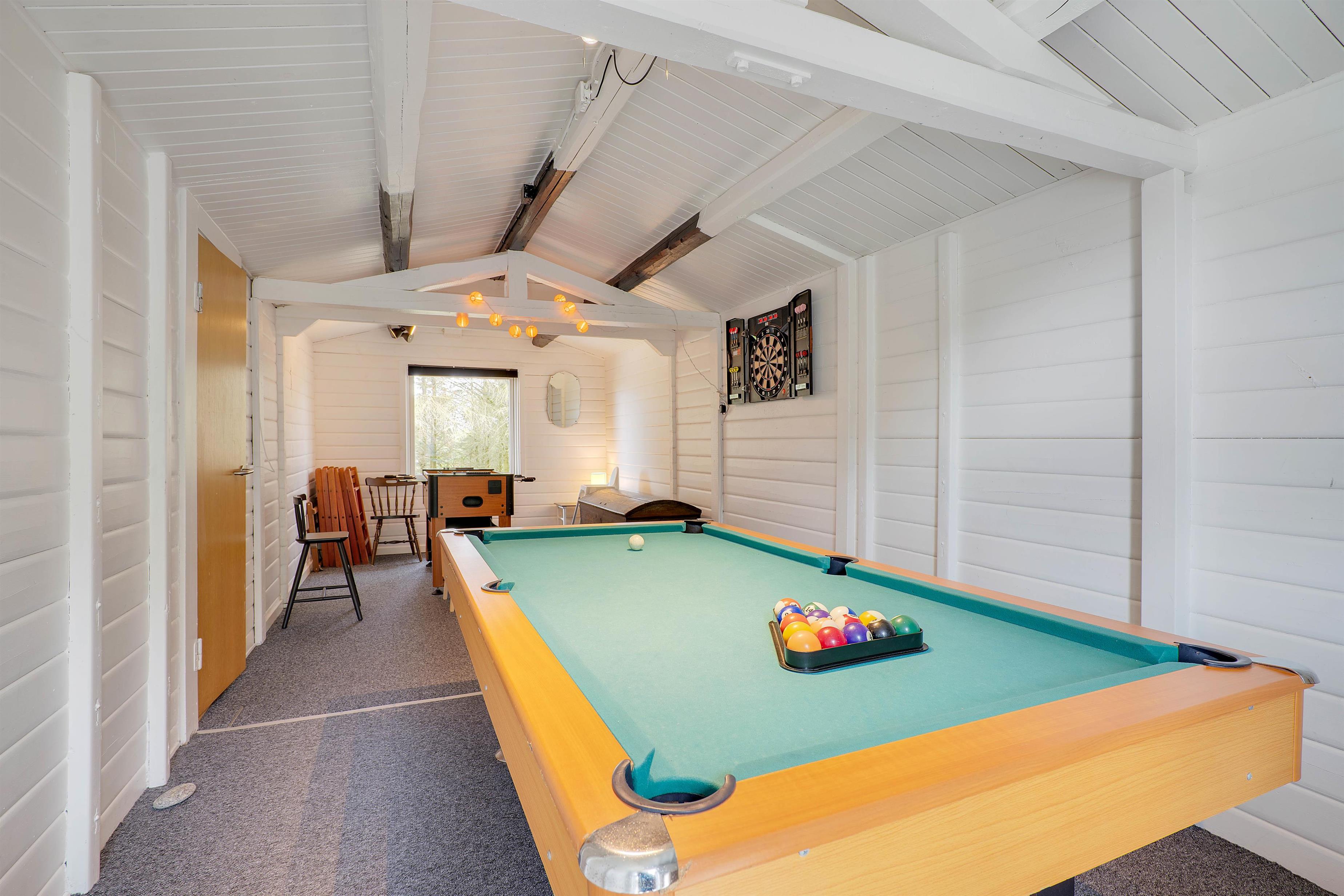 Superb games room with pool table, darts and football table