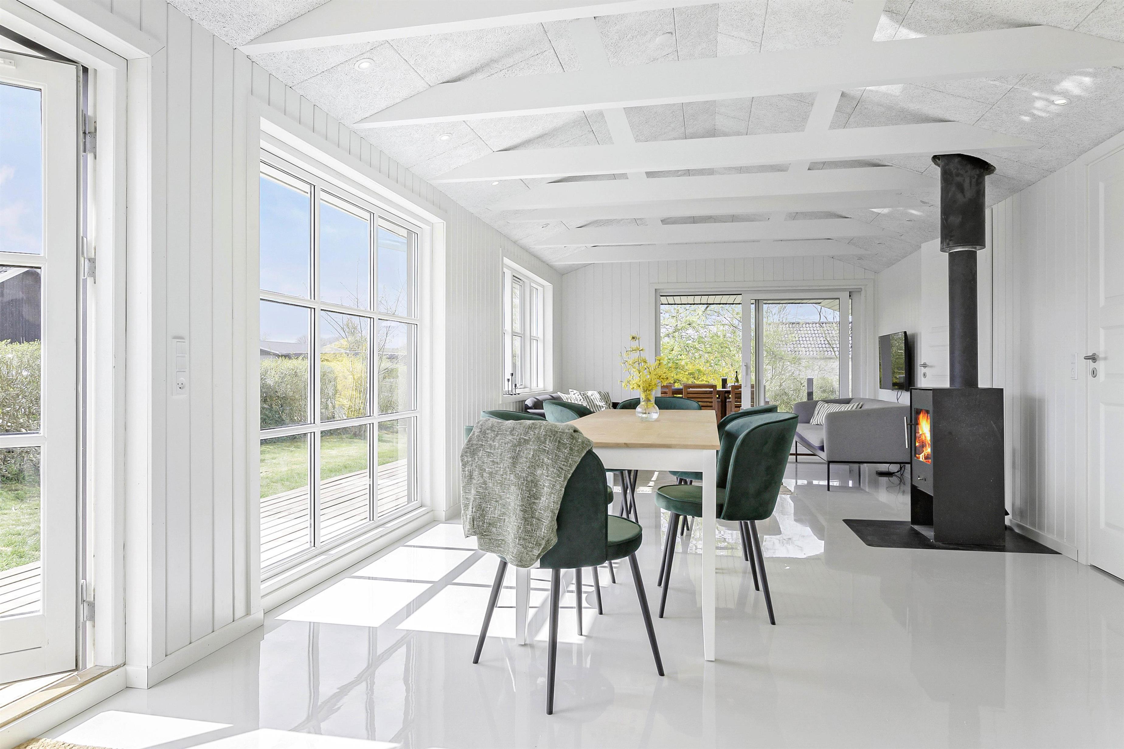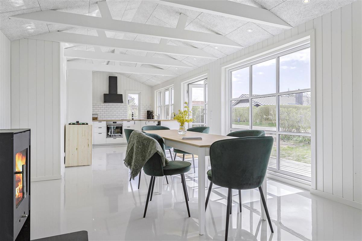 Die offene Wohnfläche des Ferienhauses in Houvig verbindet zeitgemäßen Komfort mit einem gemütlichen Ambiente. In der voll ausgestatteten Küche könnt ihr eure liebsten Gerichte zubereiten, während die Spülmaschine die Reinigung im Handumdrehen erledigt. Kuschelige Abende erwarten euch im Wohnzimmer, wo ein Holzofen für wohlige Wärme sorgt. Zusätzlich sorgt eine Wärmepumpe für ein angenehmes Raumklima, während ihr euch am Esstisch trefft, um einen lustigen Spieleabend zu veranstalten.