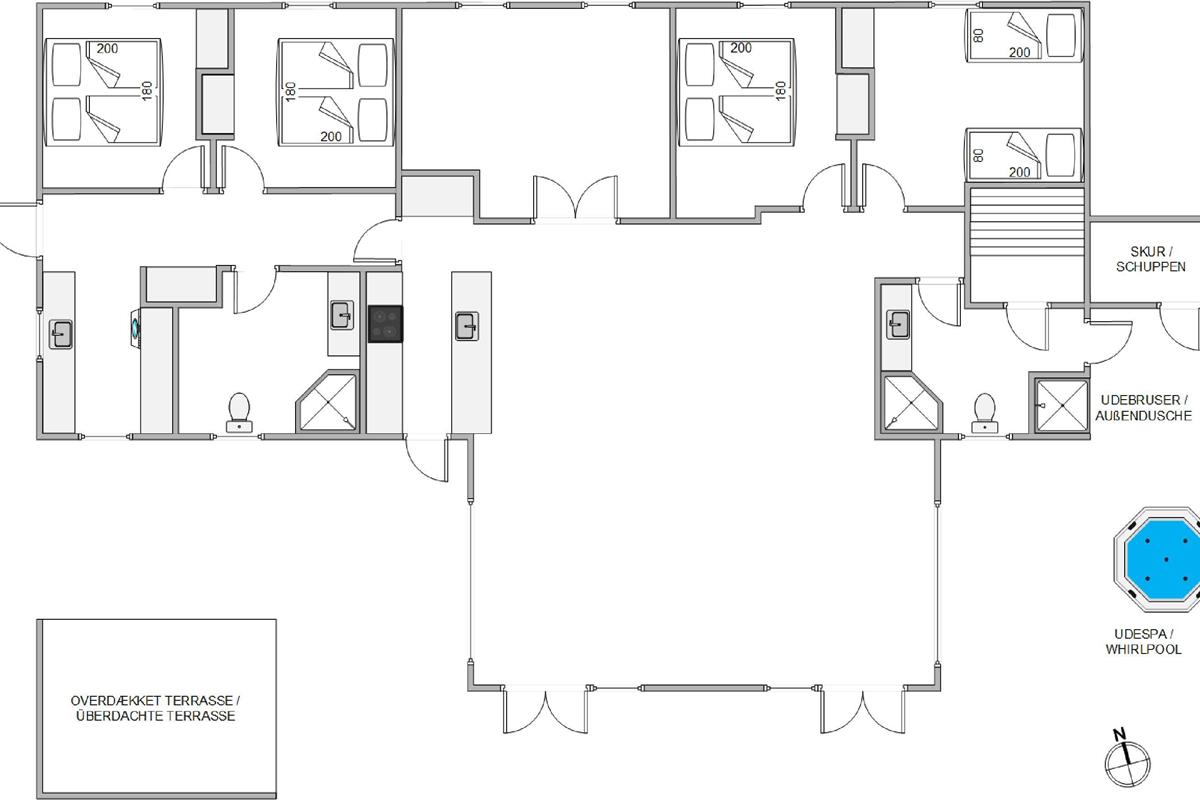 The holiday home's 175 square metres offer plenty of space for all guests. The eight beds are arranged across four comfortable bedrooms - three with double beds and one with twin beds. The holiday home also has two bathrooms, making this luxurious house perfect for holidays with friends.