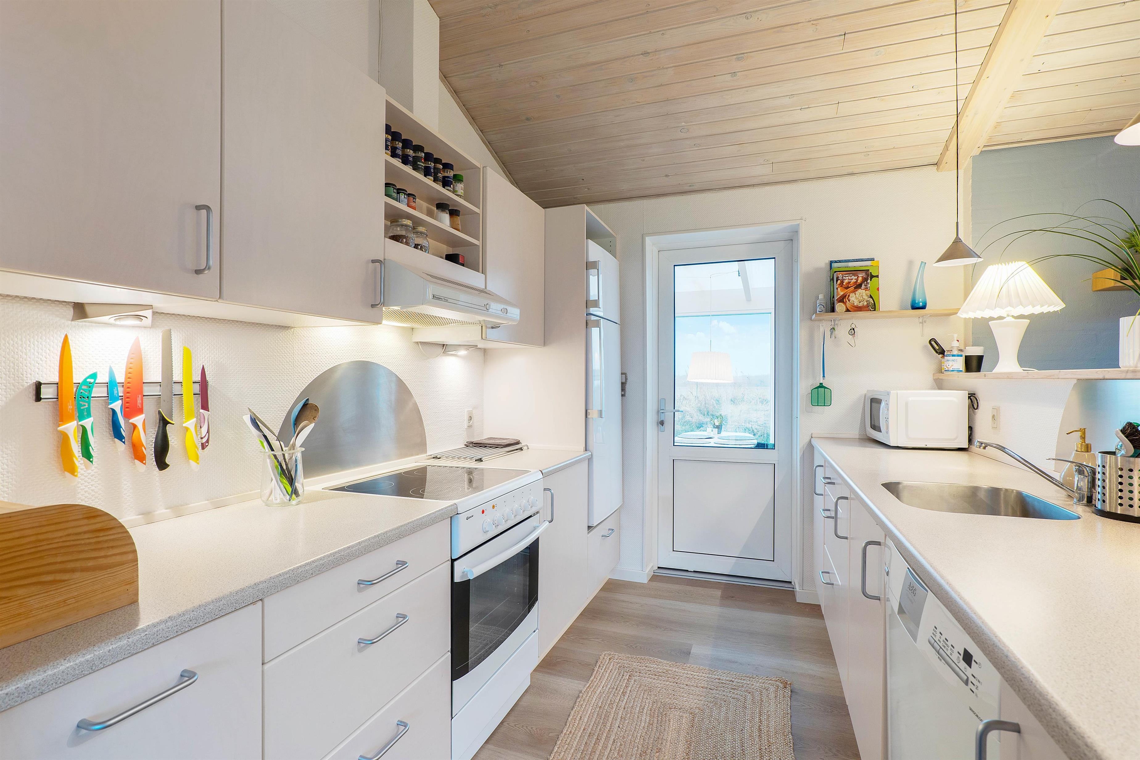 The living room opens into the stylish, well-maintained kitchen. This well-equipped space includes a microwave, dishwasher and fridge with a 50-litre freezer compartment, allowing you to stock up comfortably during your stay.