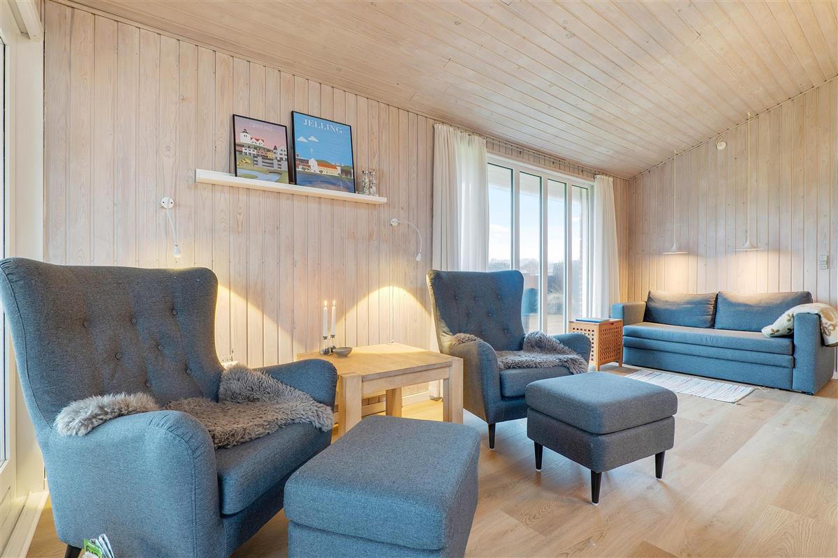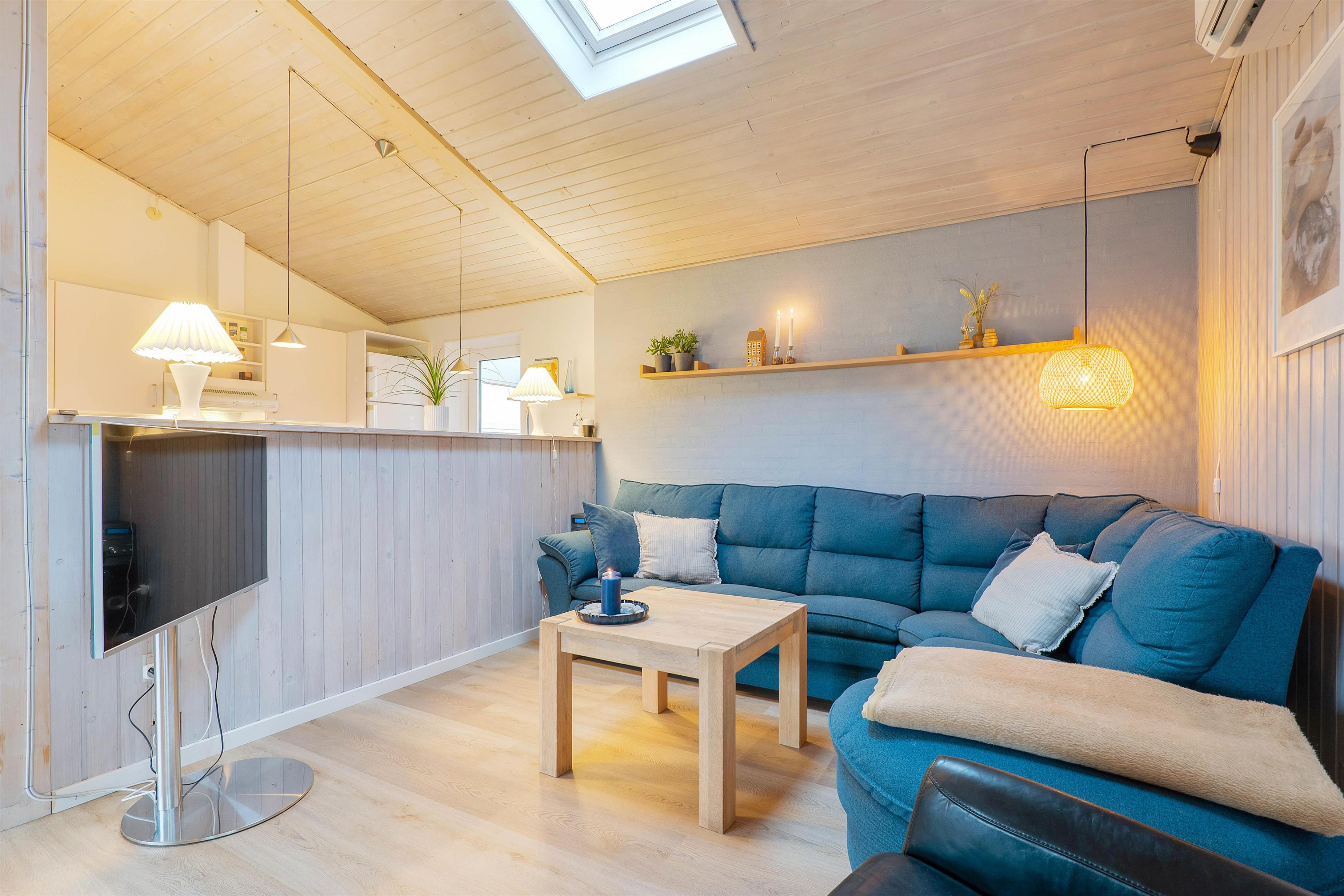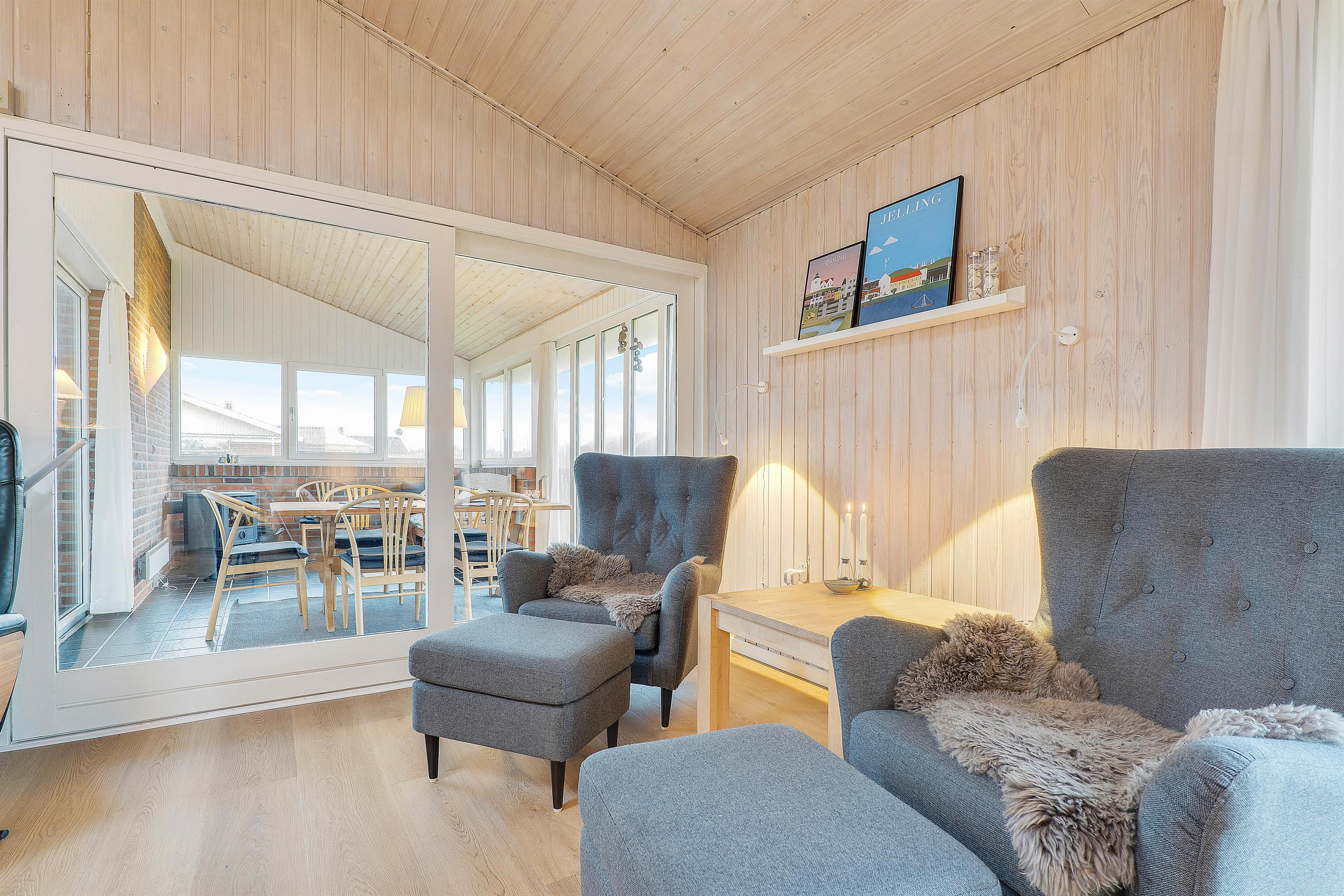 This Houvig holiday home exudes traditional country house charm, enhanced by its wood-panelled walls, warming wood-burning stove and tiled ceiling. The living room features soft, comfortable furniture, perfect for settling down with a good book or magazine.
