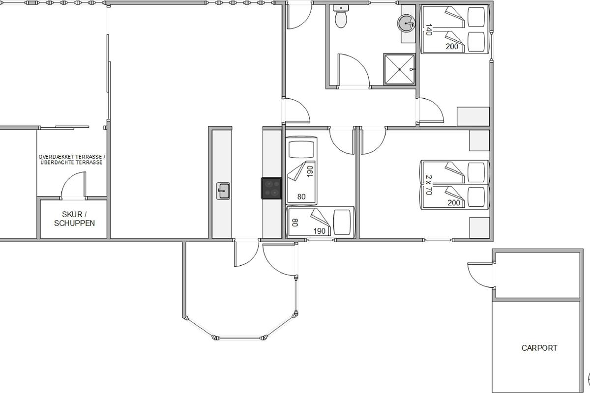 The holiday home has three bedrooms in total, one with a double bed. The remaining two bedrooms feature two single beds and one bunk bed sleeping two. The holiday home also includes a lovely, practical bathroom with shower and tiled floor.