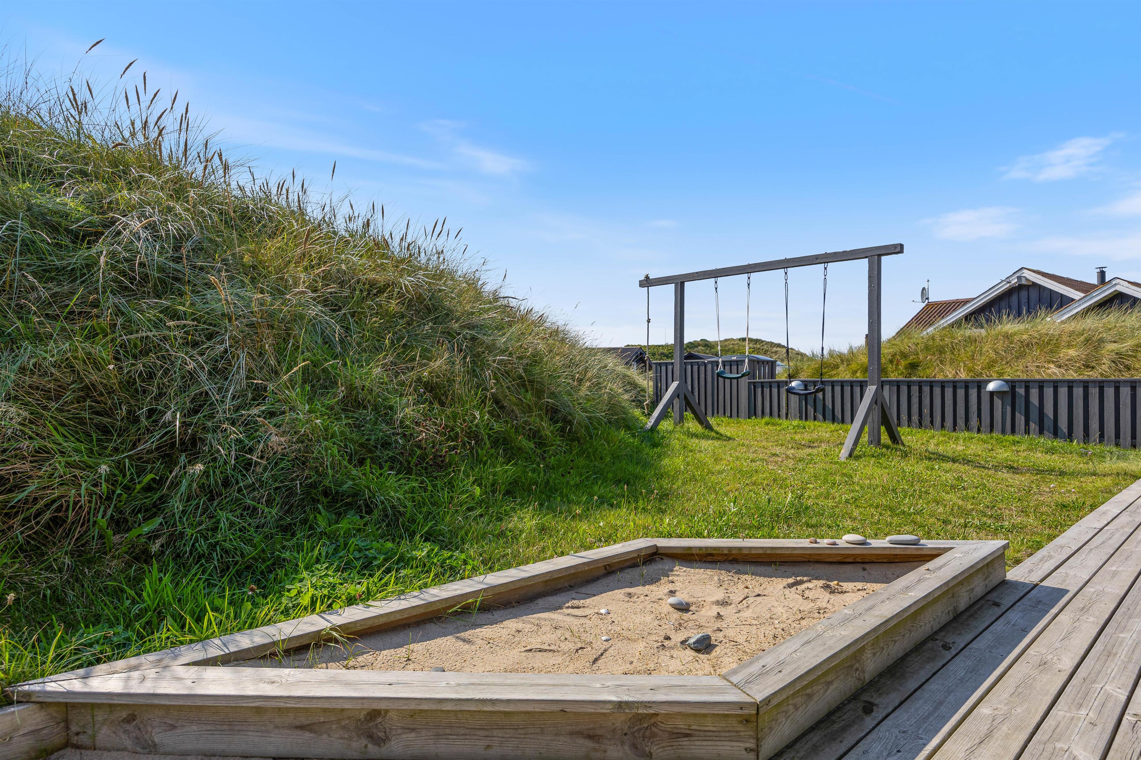In the evening, you can have a barbecue, relax in the sun loungers, and watch the children play in the sandpit and on the swings.