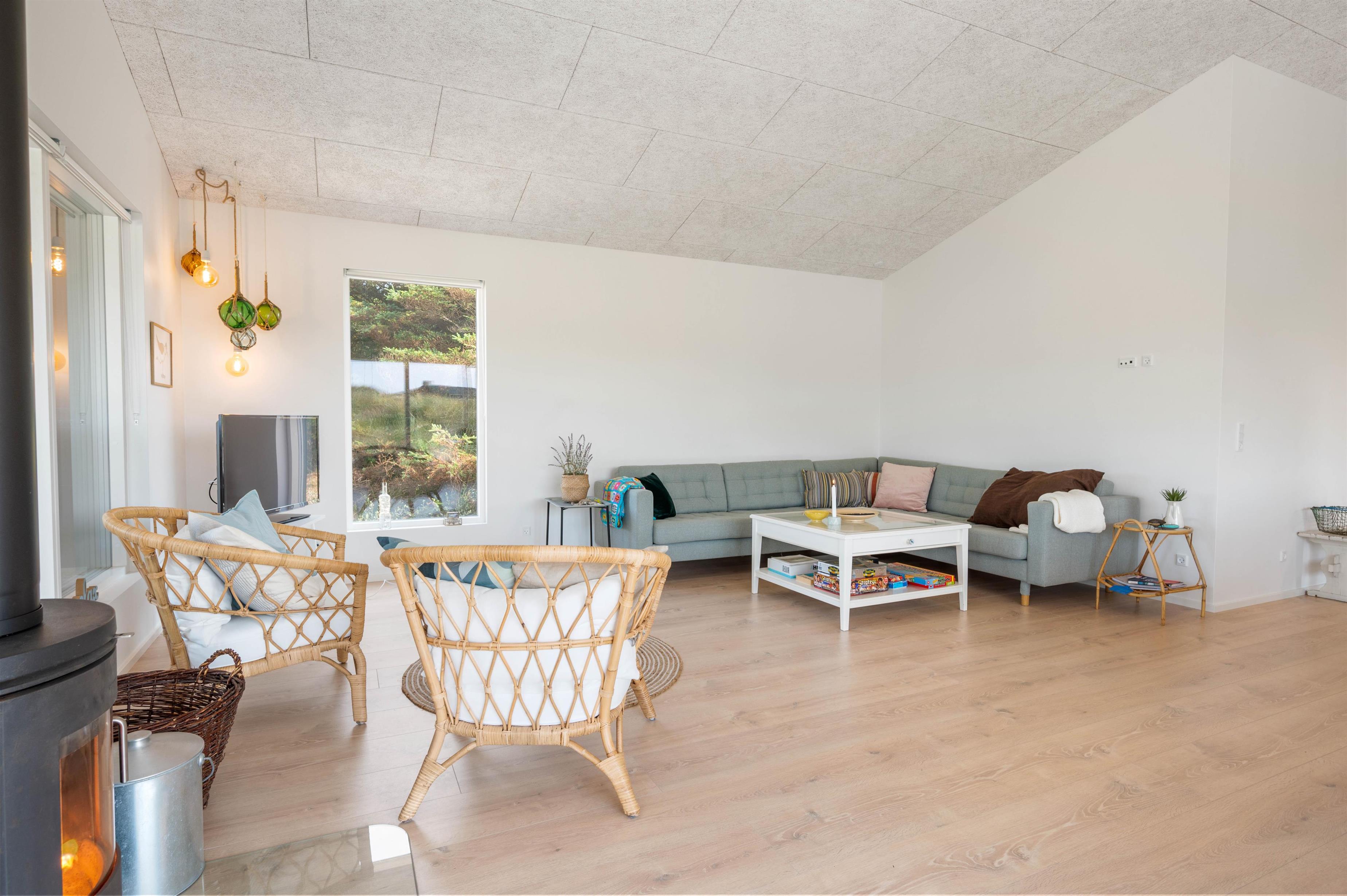 The holiday home at Ternedalen 15 welcomes you with its bright and modern interior. The heart of the holiday home is the spacious living area, which combines the kitchen, living room and dining area. Here you can cook together or enjoy games evenings, while the wood-burning stove creates that typical holiday home atmosphere. This is the perfect place to completely switch off from everyday life, as there's no television in the living area - though one bedroom features a TV with Chromecast. While listening to the crackling fire, you can relax with a good book or hot drink in front of the wood-burning stove.