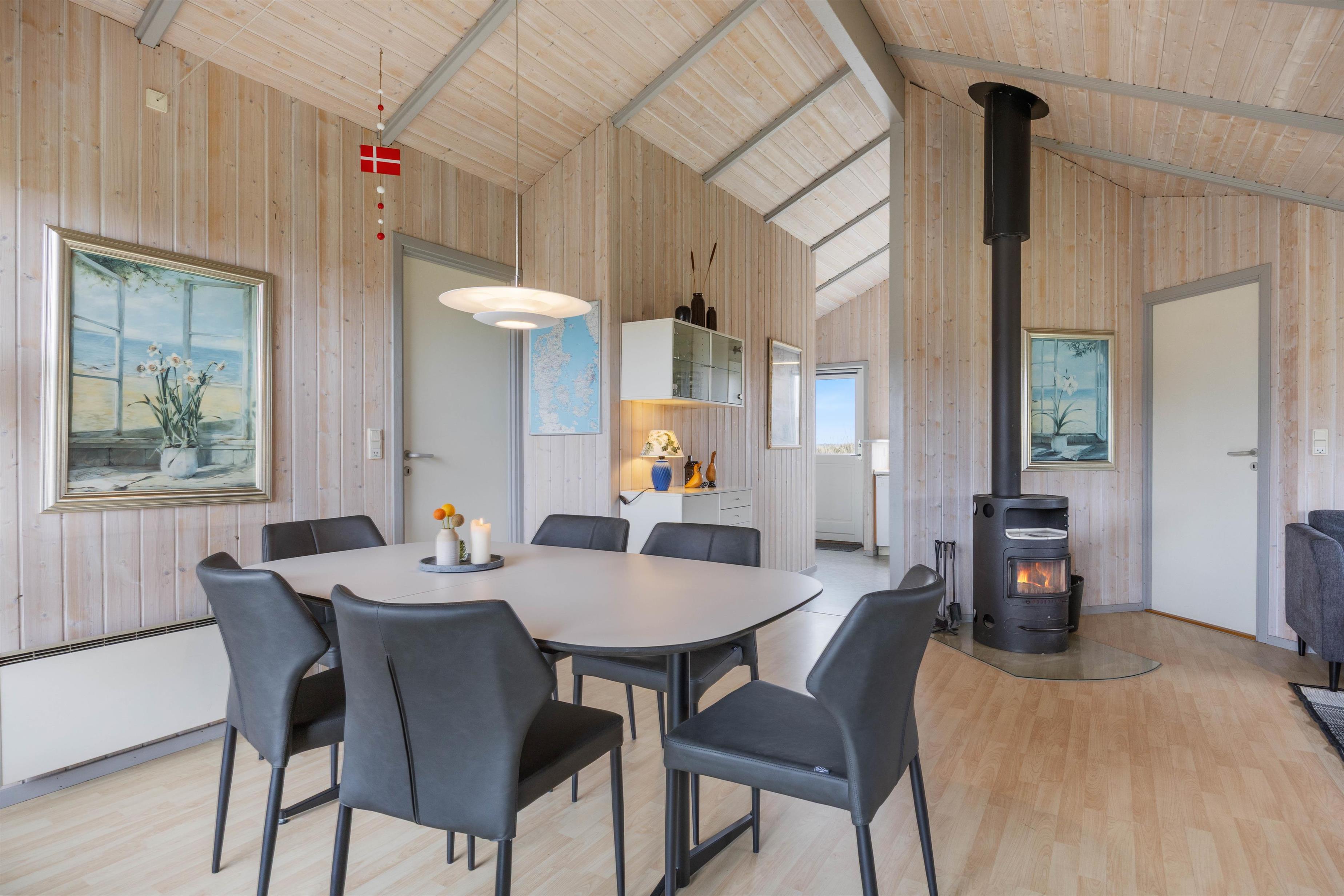 The holiday home's charm, cultivated by the owner, stems from features including the large corner sofa, a cosy sleeping nook, artwork on the walls, and notably, the well-positioned wood-burning stove. Everyone can unwind here, whether reading an engaging book, taking an afternoon nap, watching a good film, or sharing an evening meal at the large dining table. The kitchen is practically equipped with a dishwasher, fridge-freezer, and microwave.