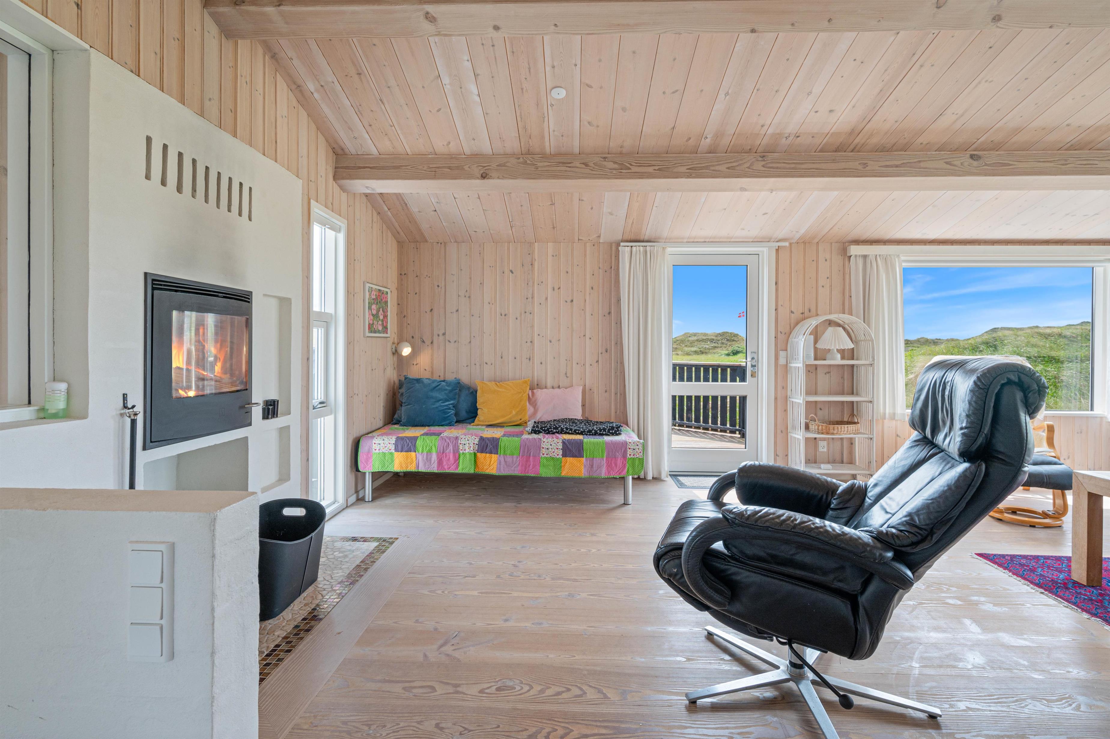 There's ample space for six people, with three bedrooms featuring one double bed and four single beds, allowing everyone to find their own private space. For spending time together, you'll find a large dining table in the kitchen and a living room with a comfortable corner sofa - perfect for board games or planning your holiday activities and excursions. The living room features a built-in wood-burning stove set into the wall.