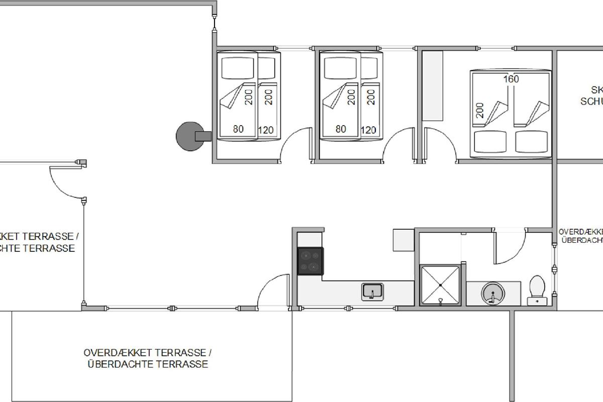 The living room leads directly to the dining area and kitchen. Here the whole family can gather for good food or spend cosy hours playing card and board games. The well-equipped kitchen includes a microwave, dishwasher and a 20-litre refrigerator.
