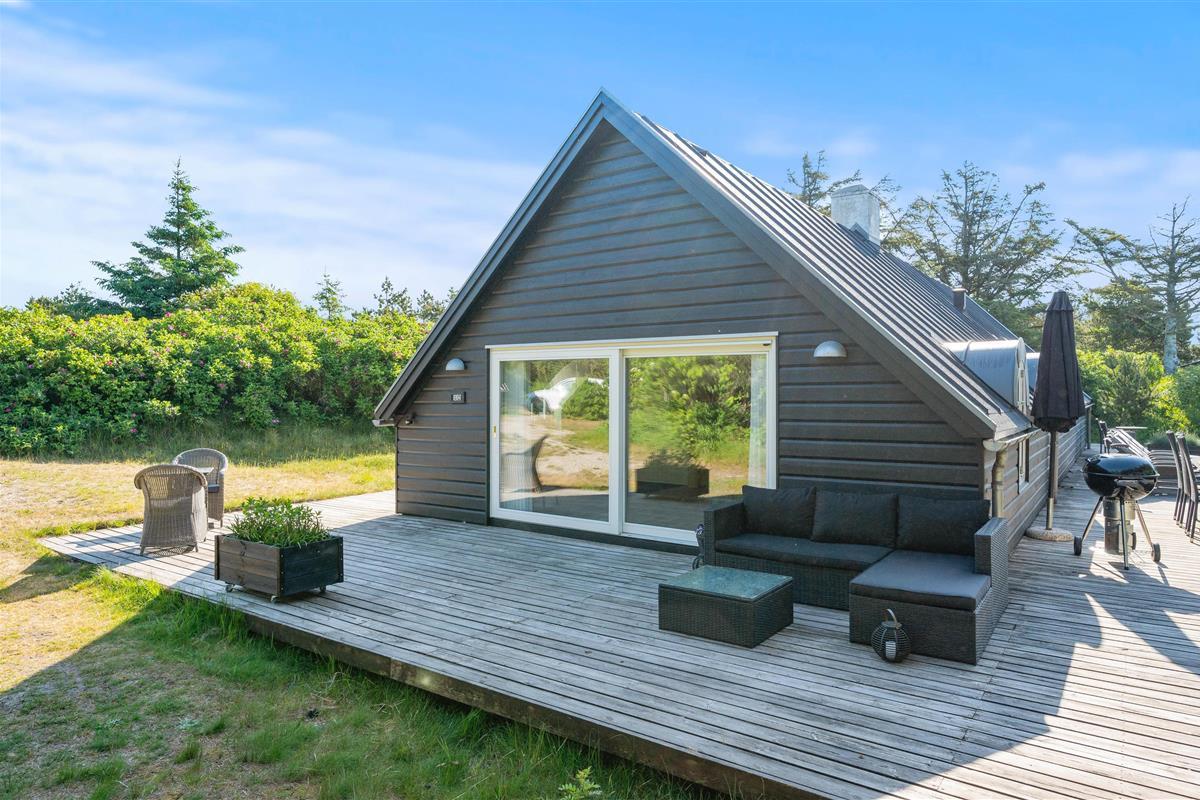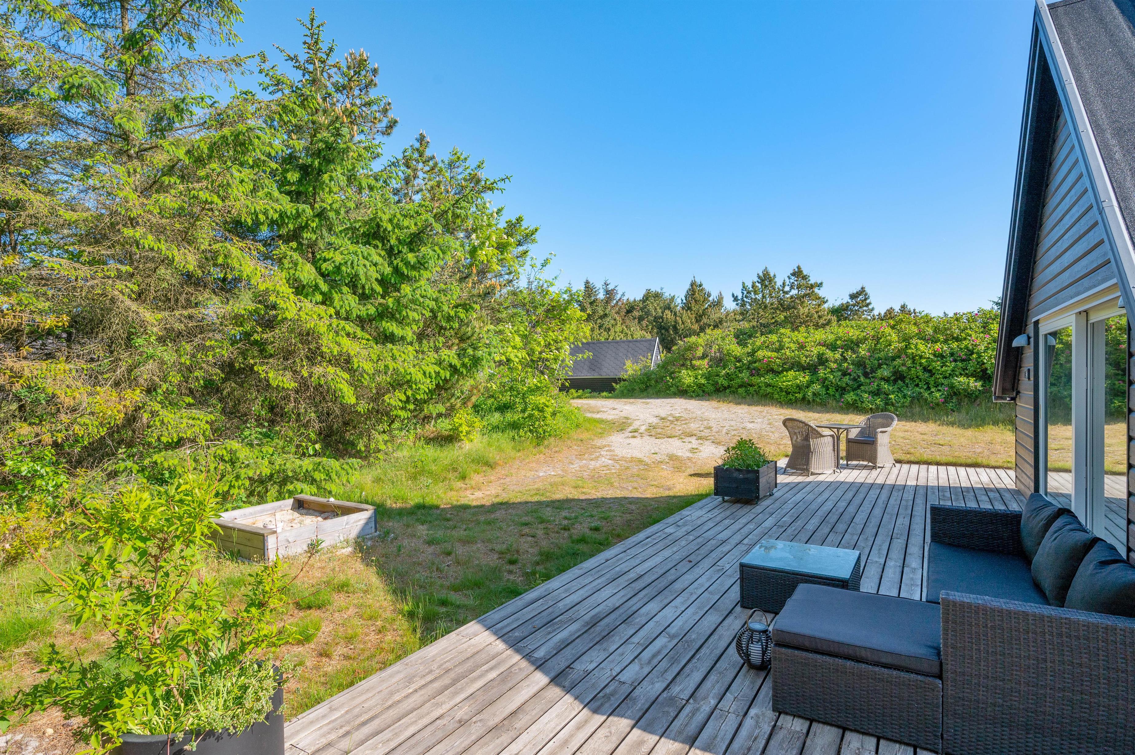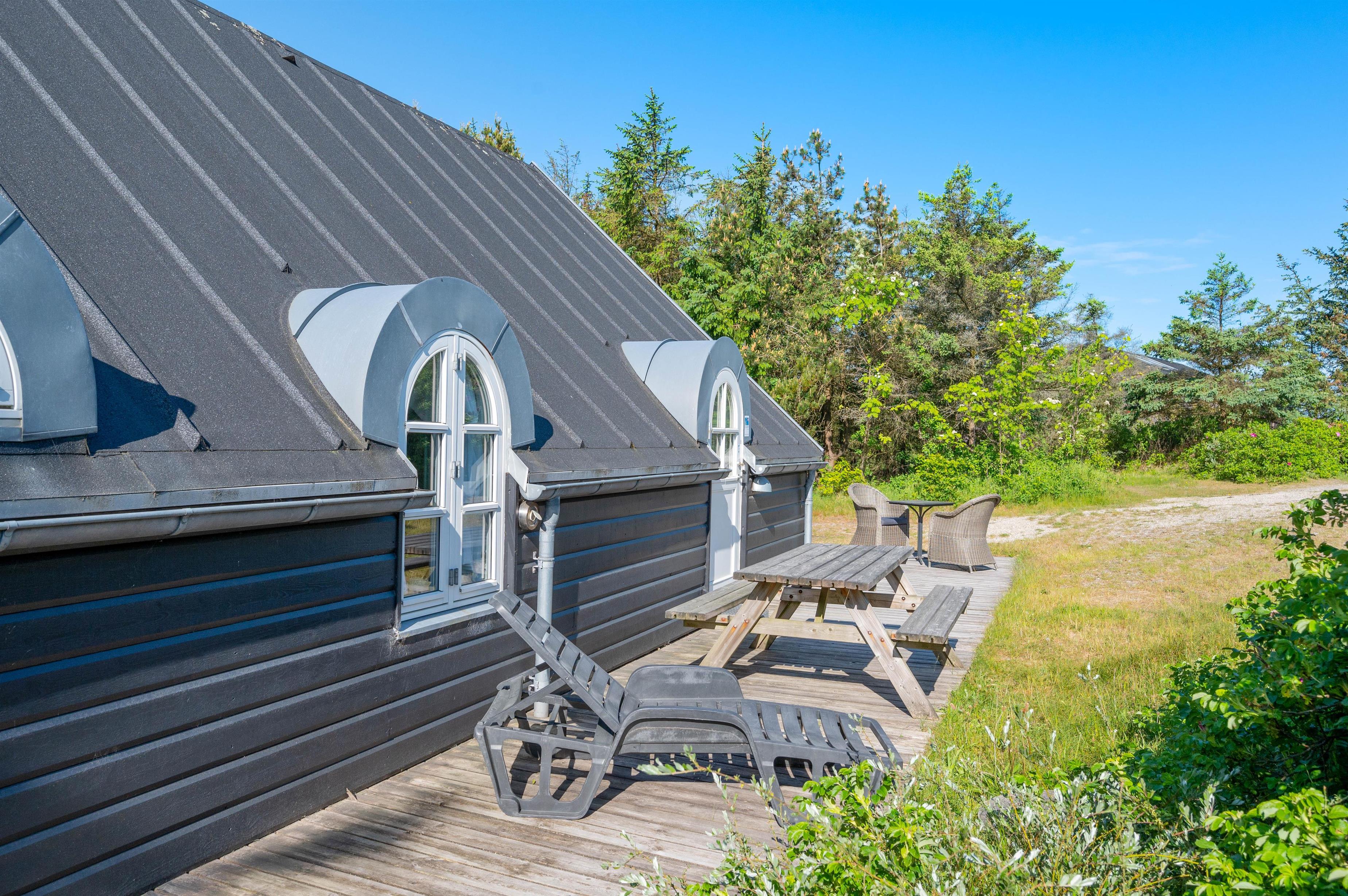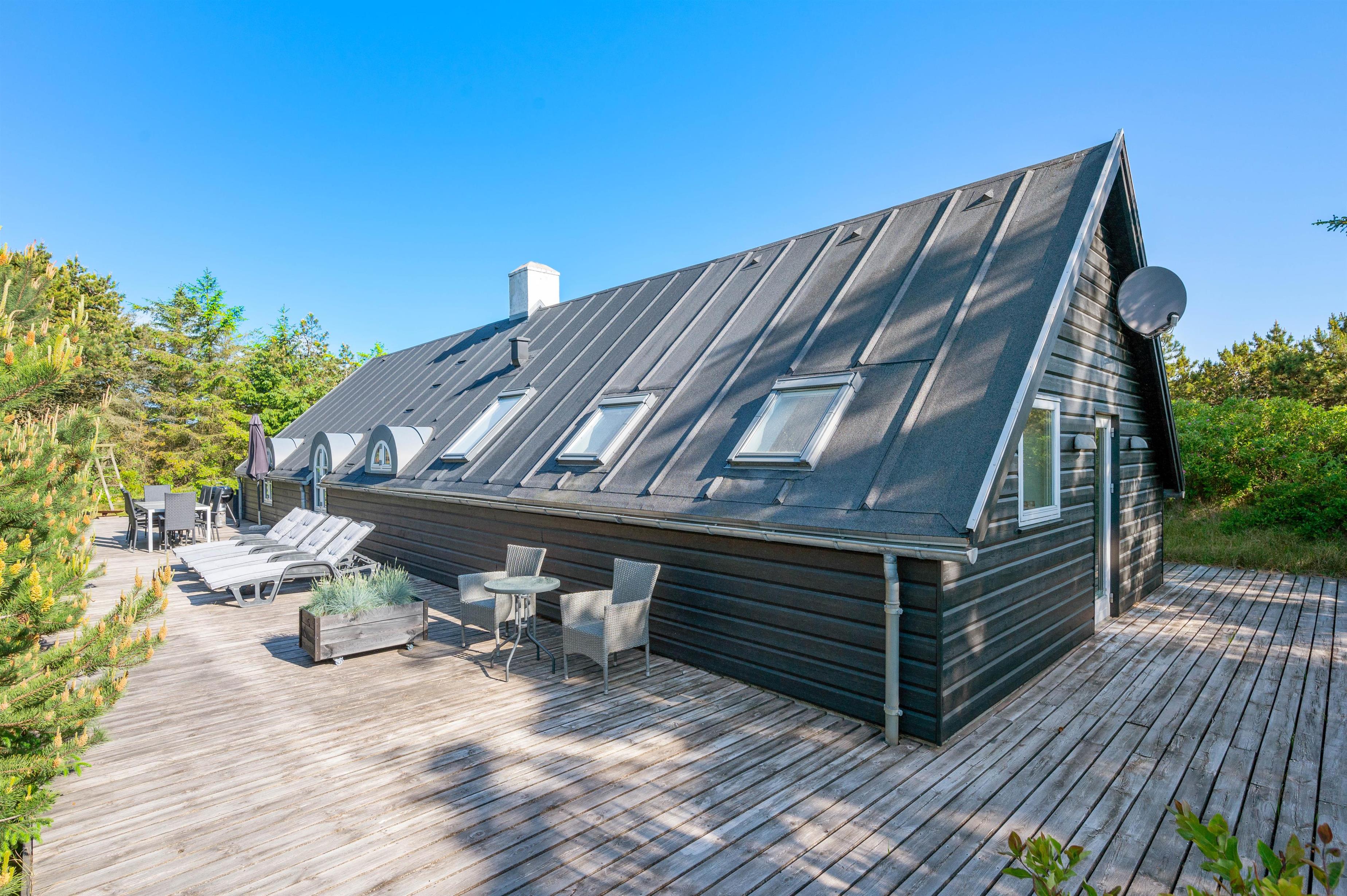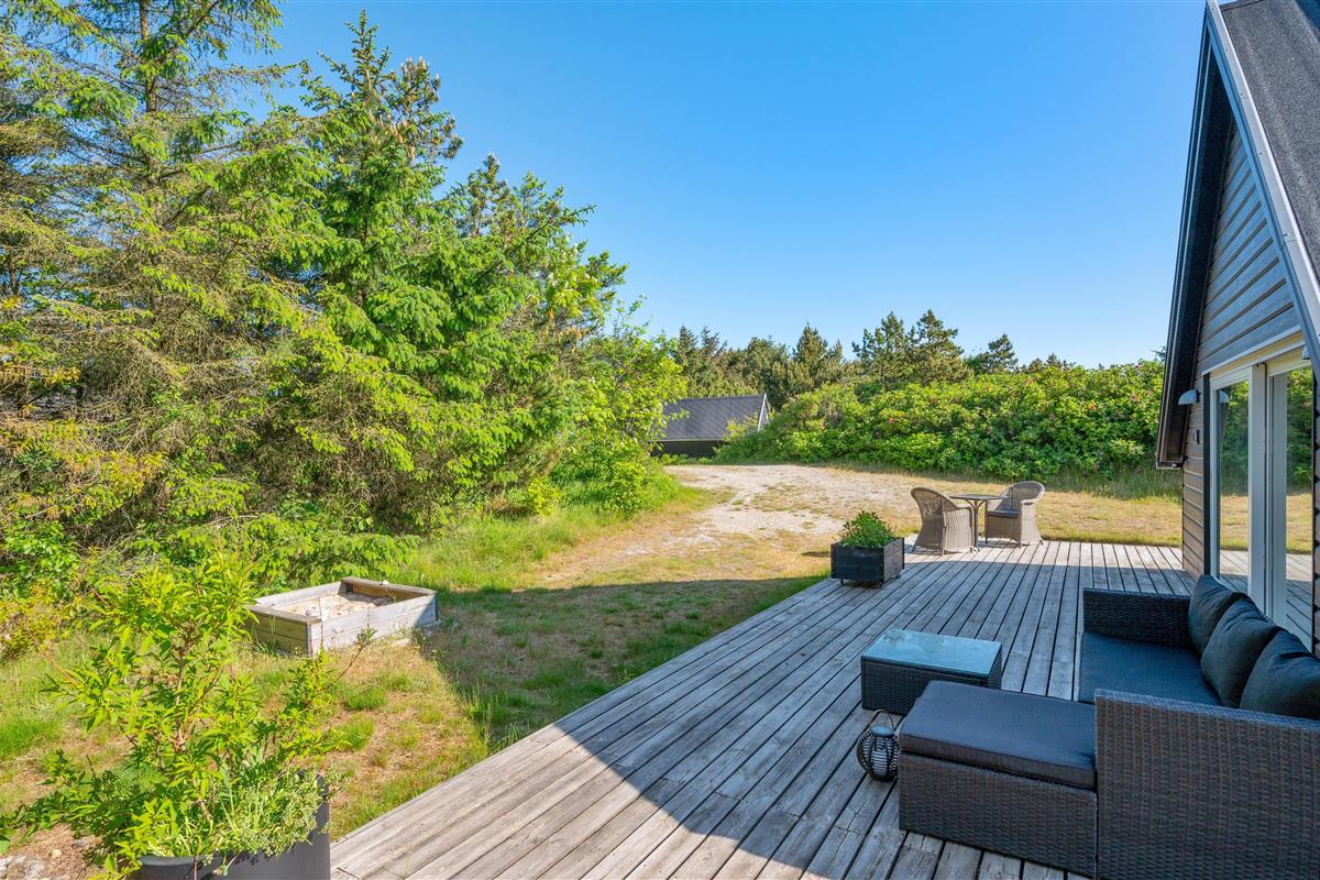 This excellent holiday home is located at Skovdalen 12, surrounded by a large terrace. The house enjoys a wonderfully peaceful position on a sheltered natural plot where you can enjoy your holiday in tranquility. The North Sea is just 500 metres from the holiday home.