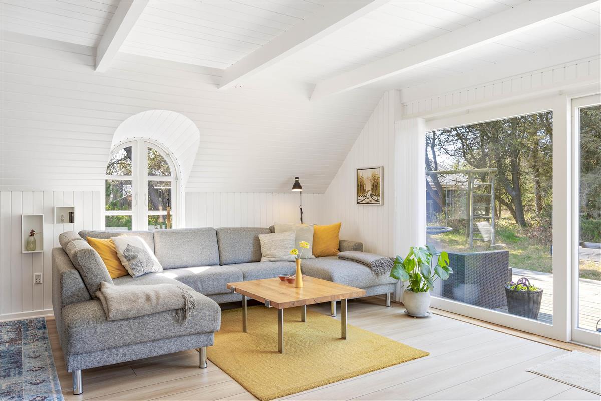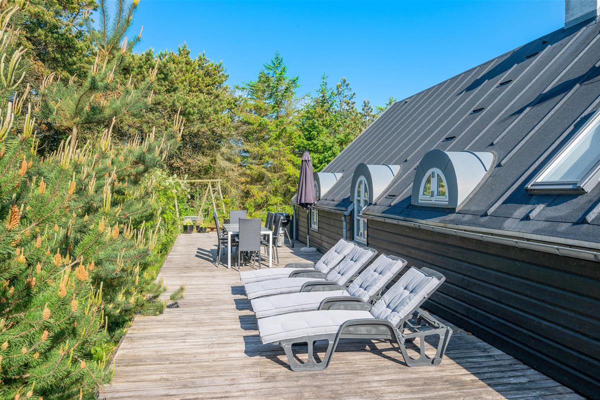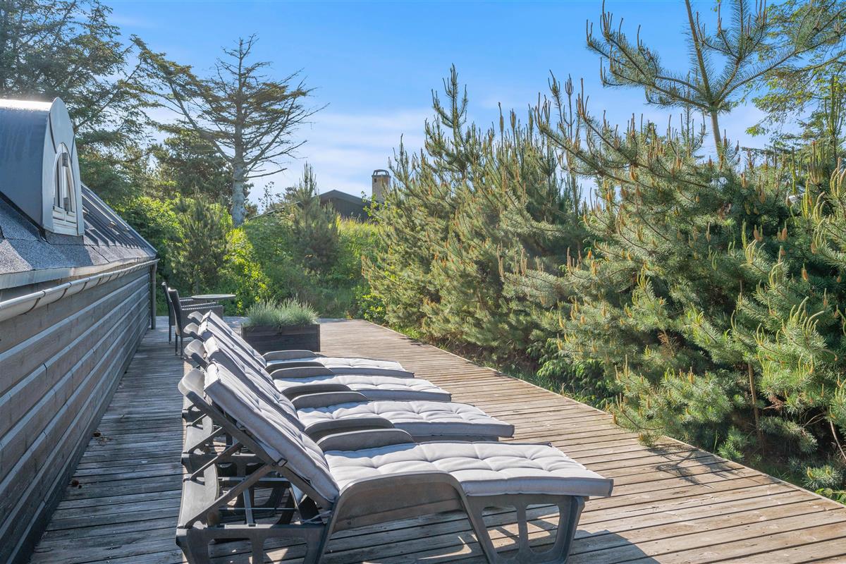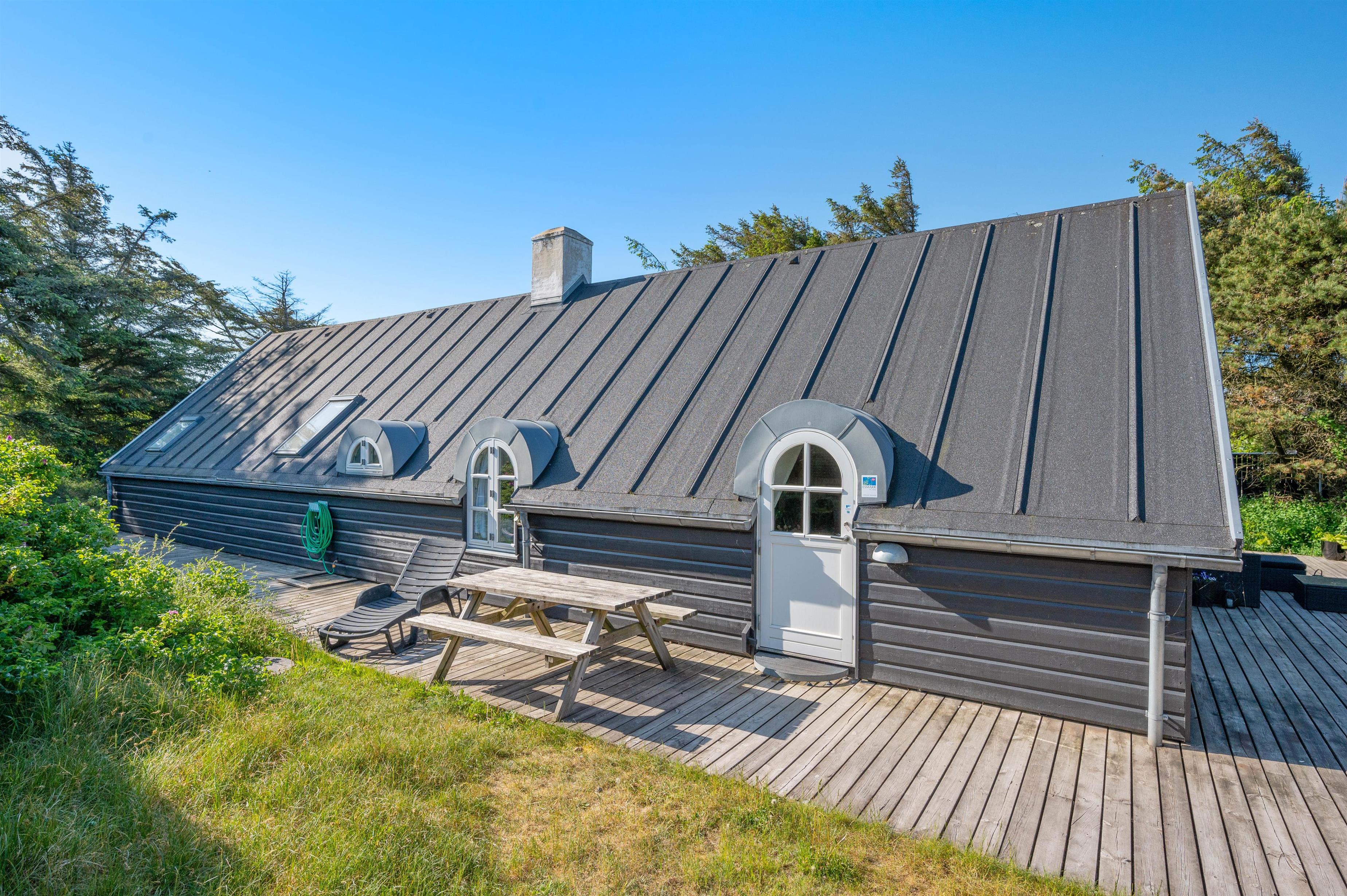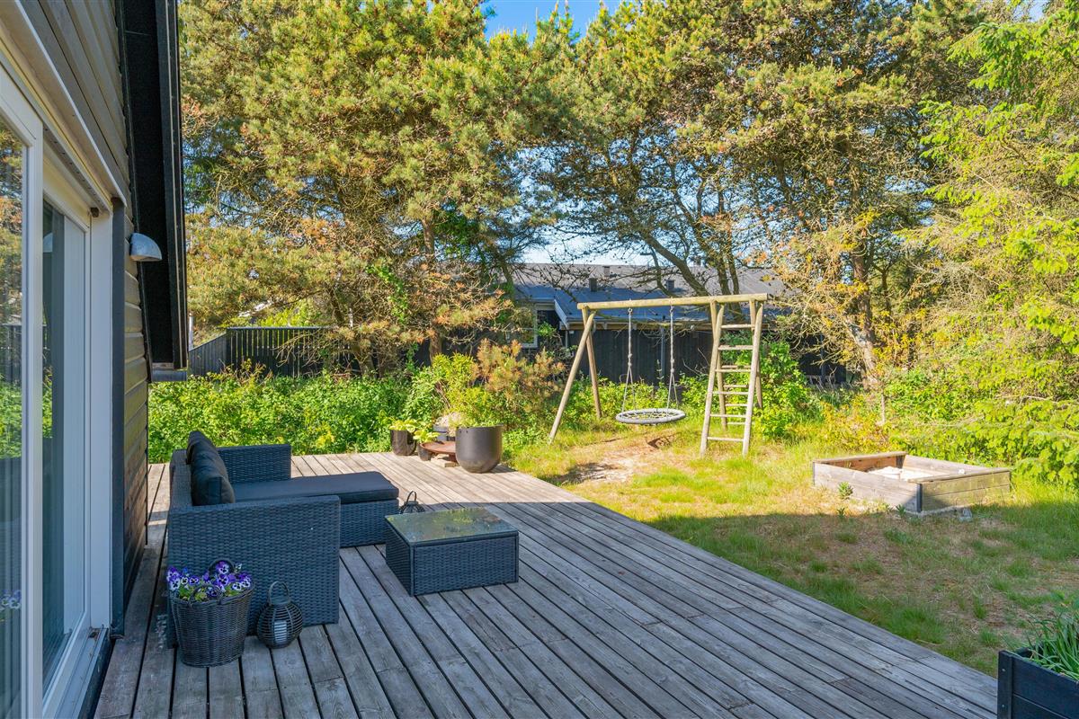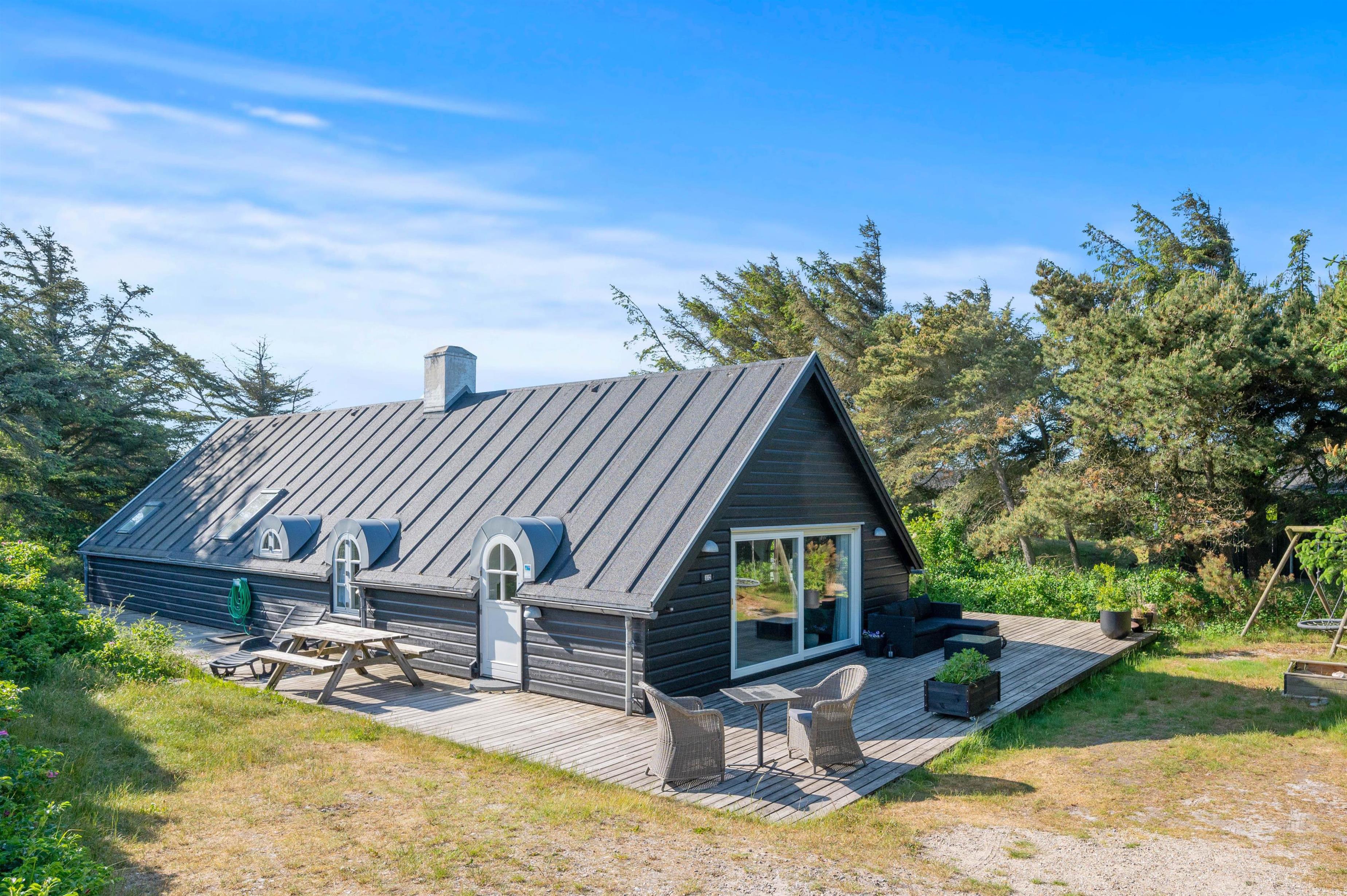 This excellent holiday home is located at Skovdalen 12, surrounded by a large terrace. The house enjoys a wonderfully peaceful position on a sheltered natural plot where you can enjoy your holiday in tranquility. The North Sea is just 500 metres from the holiday home.