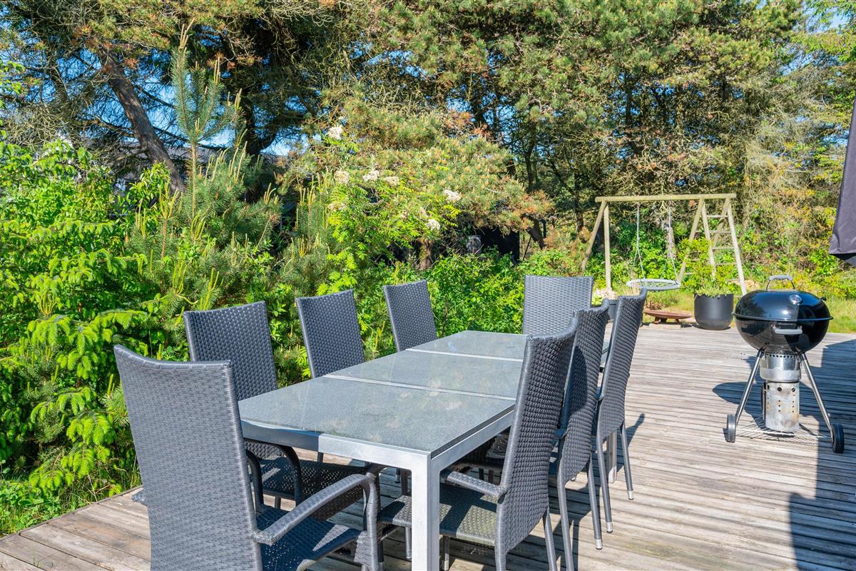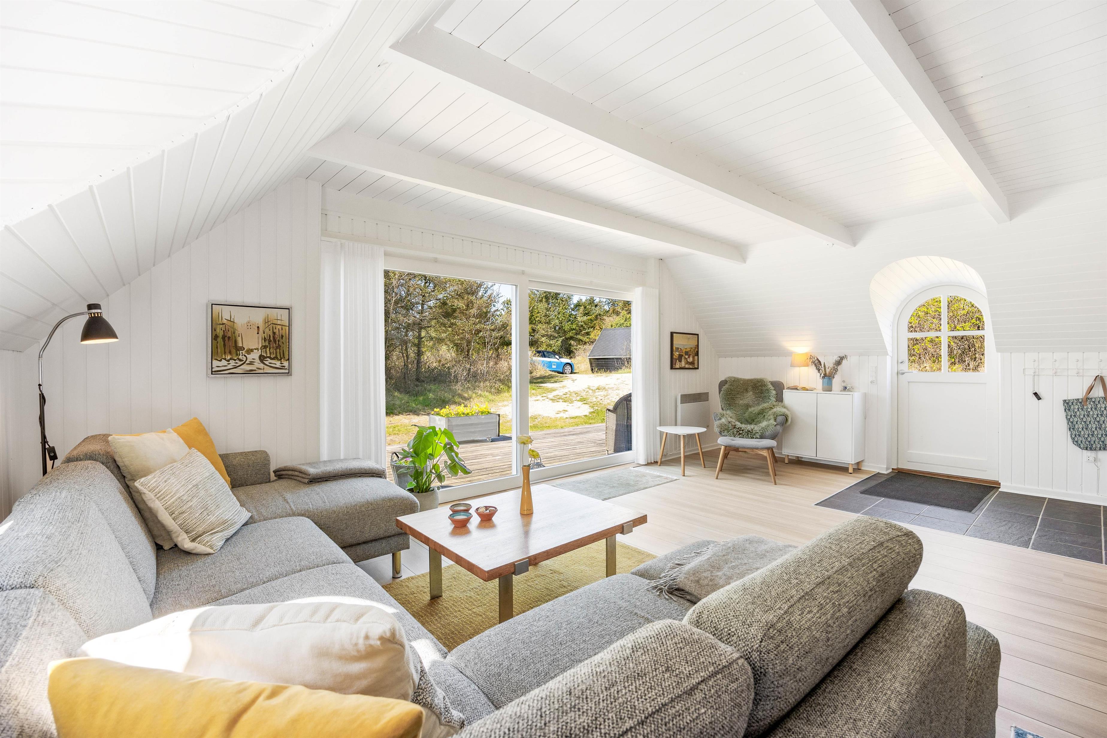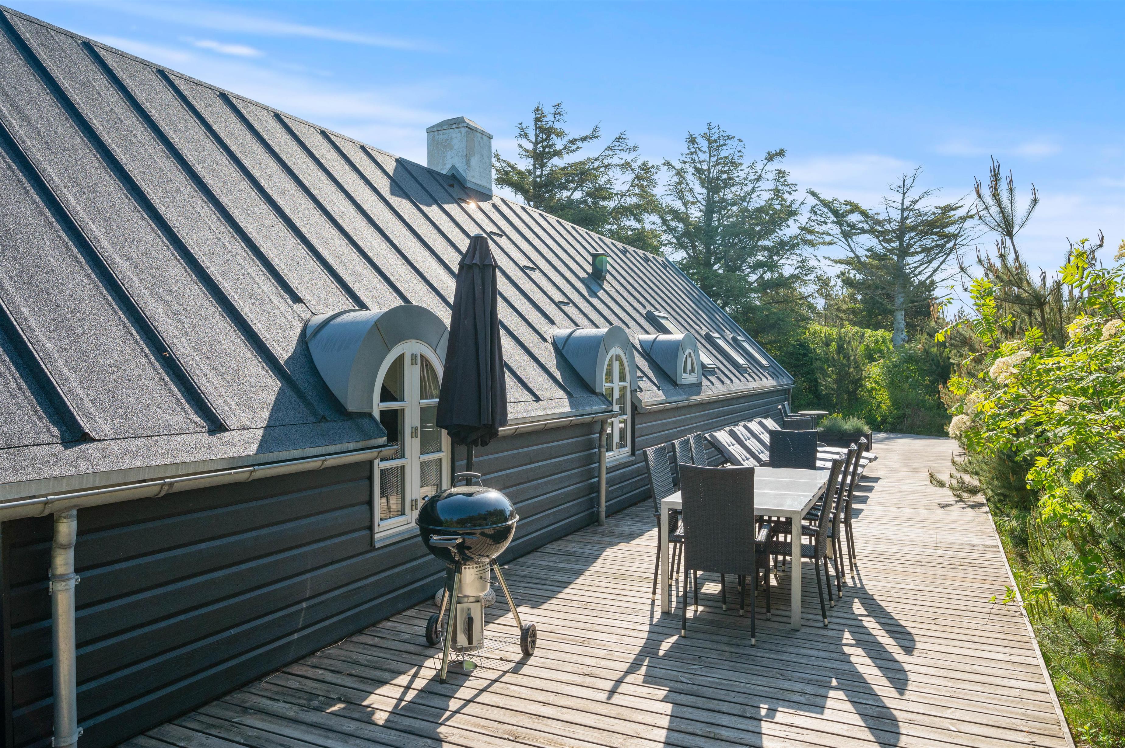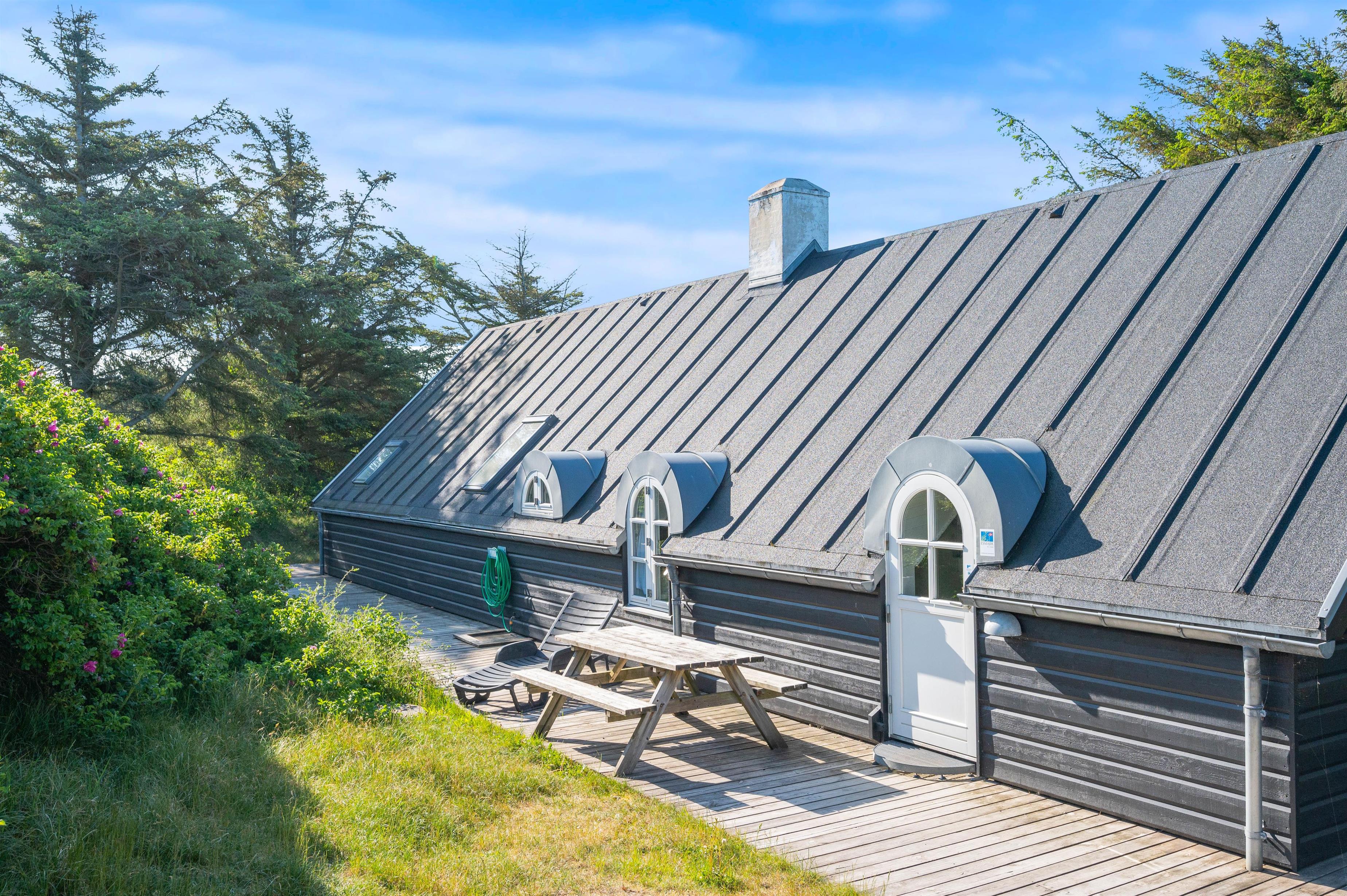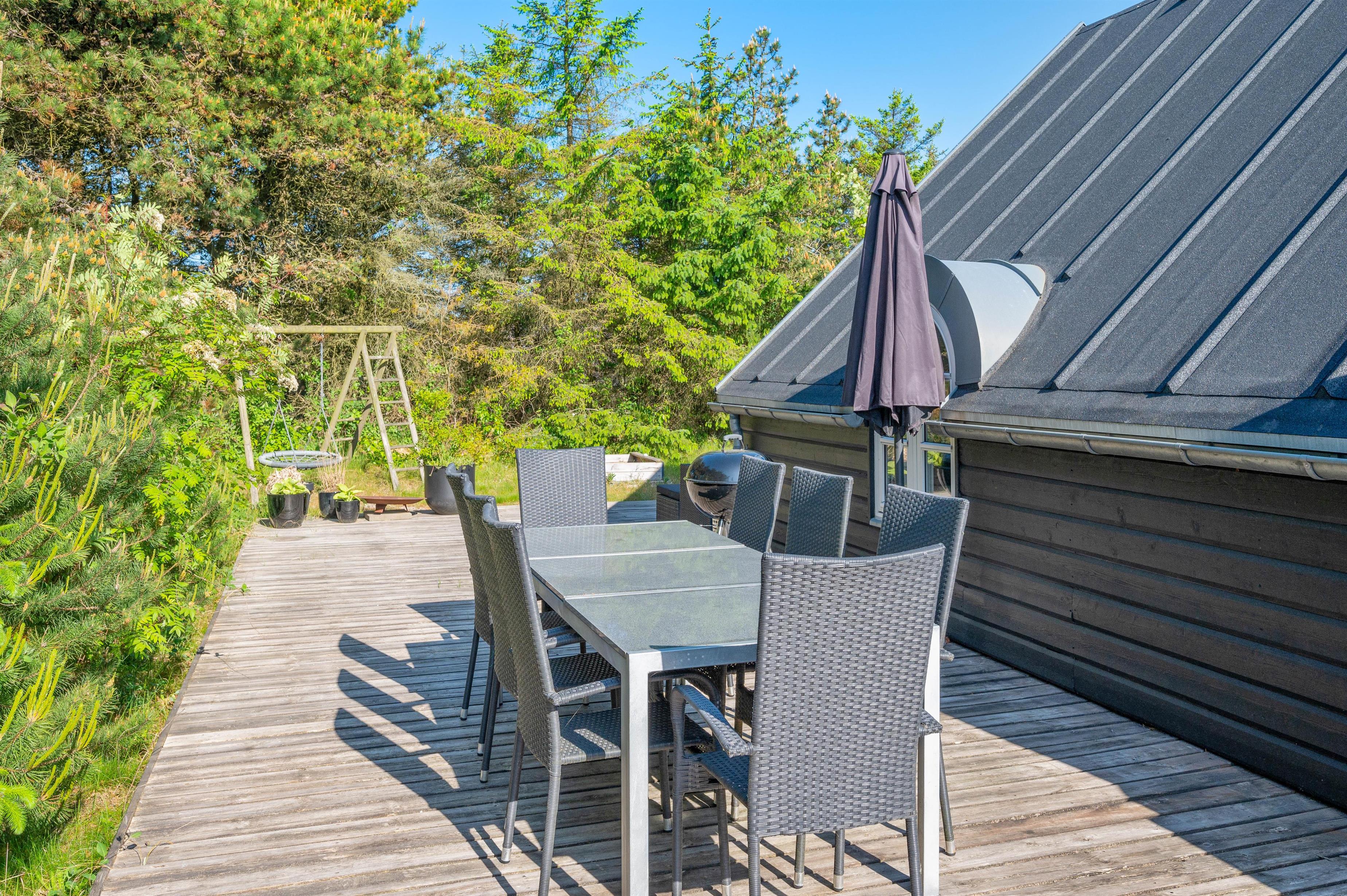 This excellent holiday home is located at Skovdalen 12, surrounded by a large terrace. The house enjoys a wonderfully peaceful position on a sheltered natural plot where you can enjoy your holiday in tranquility. The North Sea is just 500 metres from the holiday home.