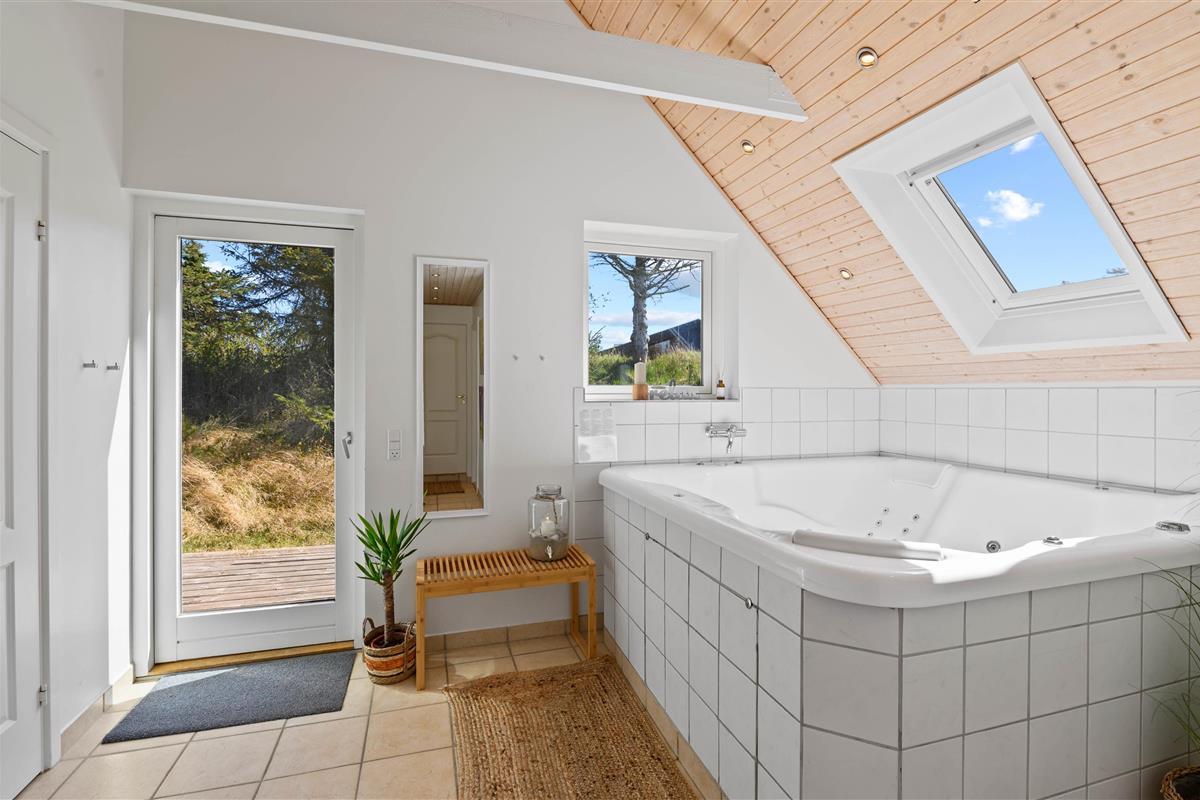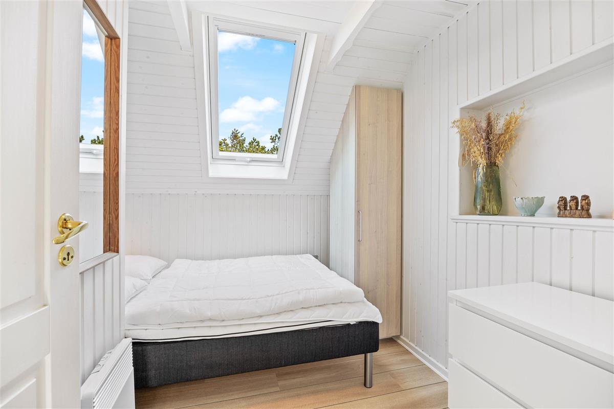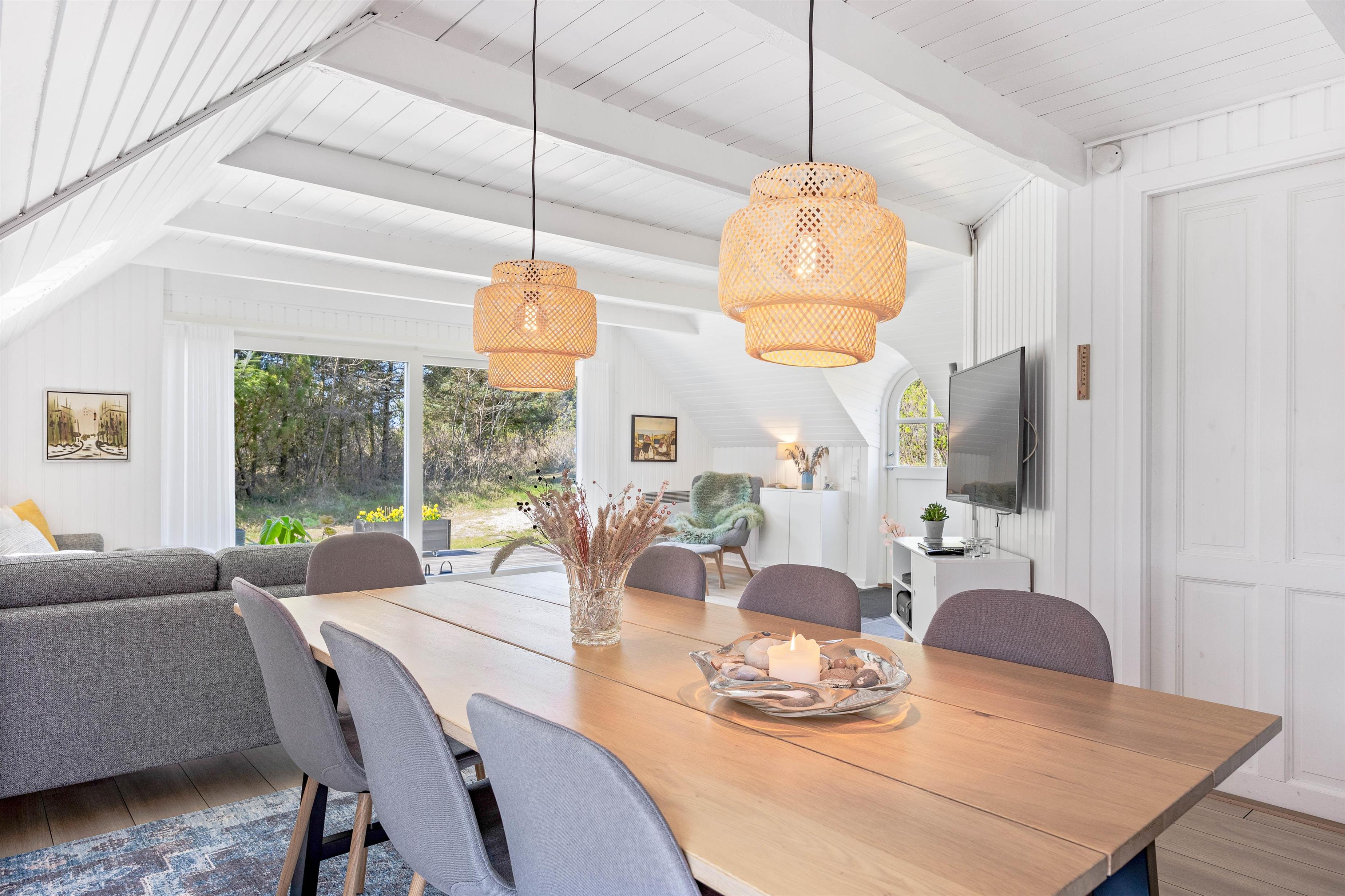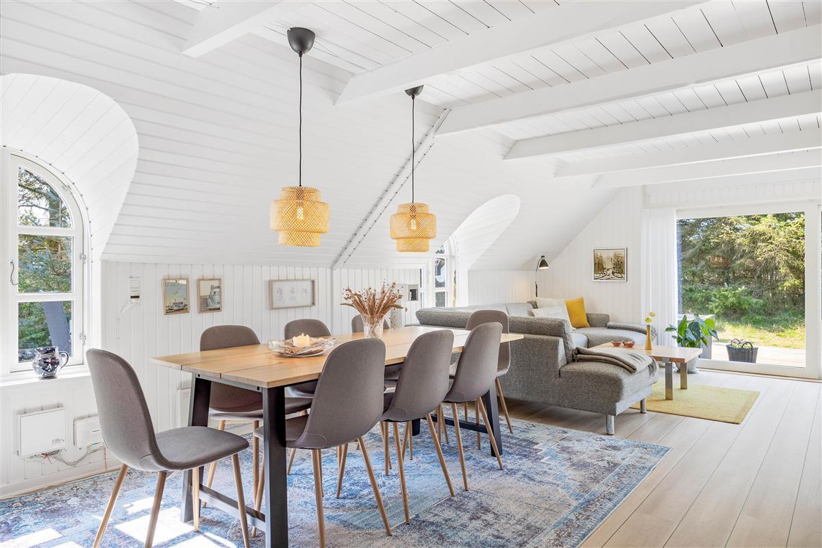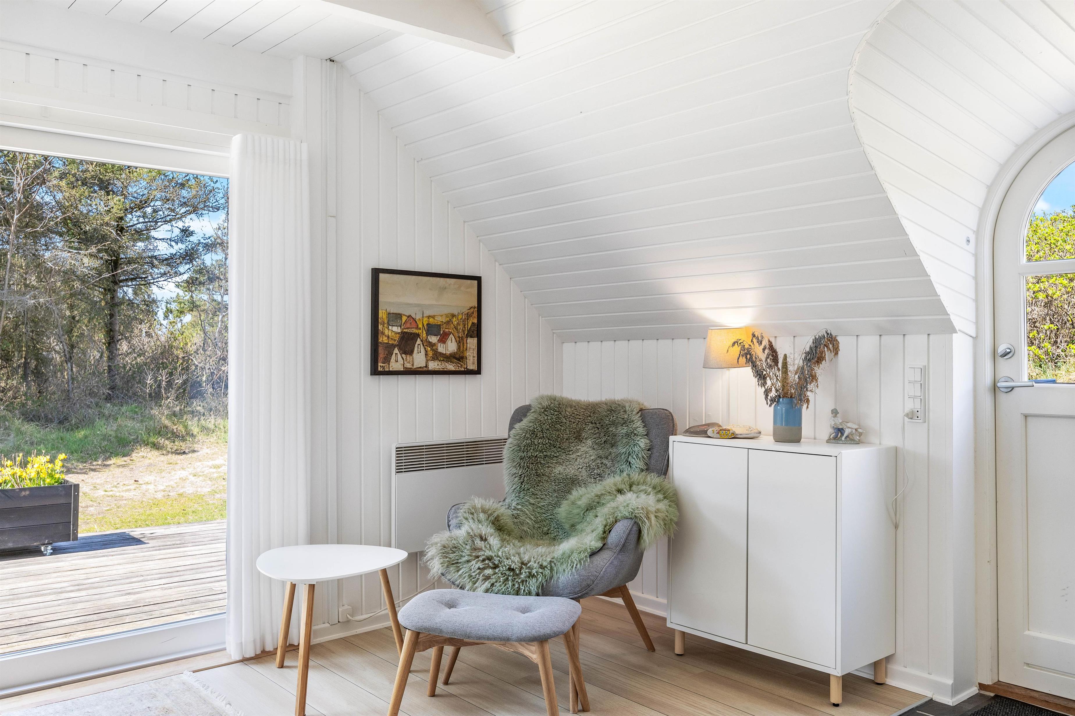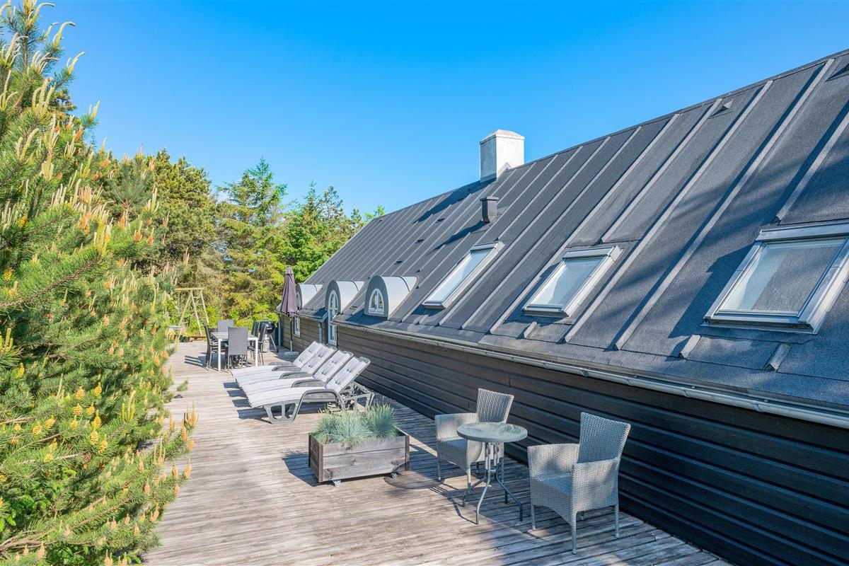 This excellent holiday home is located at Skovdalen 12, surrounded by a large terrace. The house enjoys a wonderfully peaceful position on a sheltered natural plot where you can enjoy your holiday in tranquility. The North Sea is just 500 metres from the holiday home.