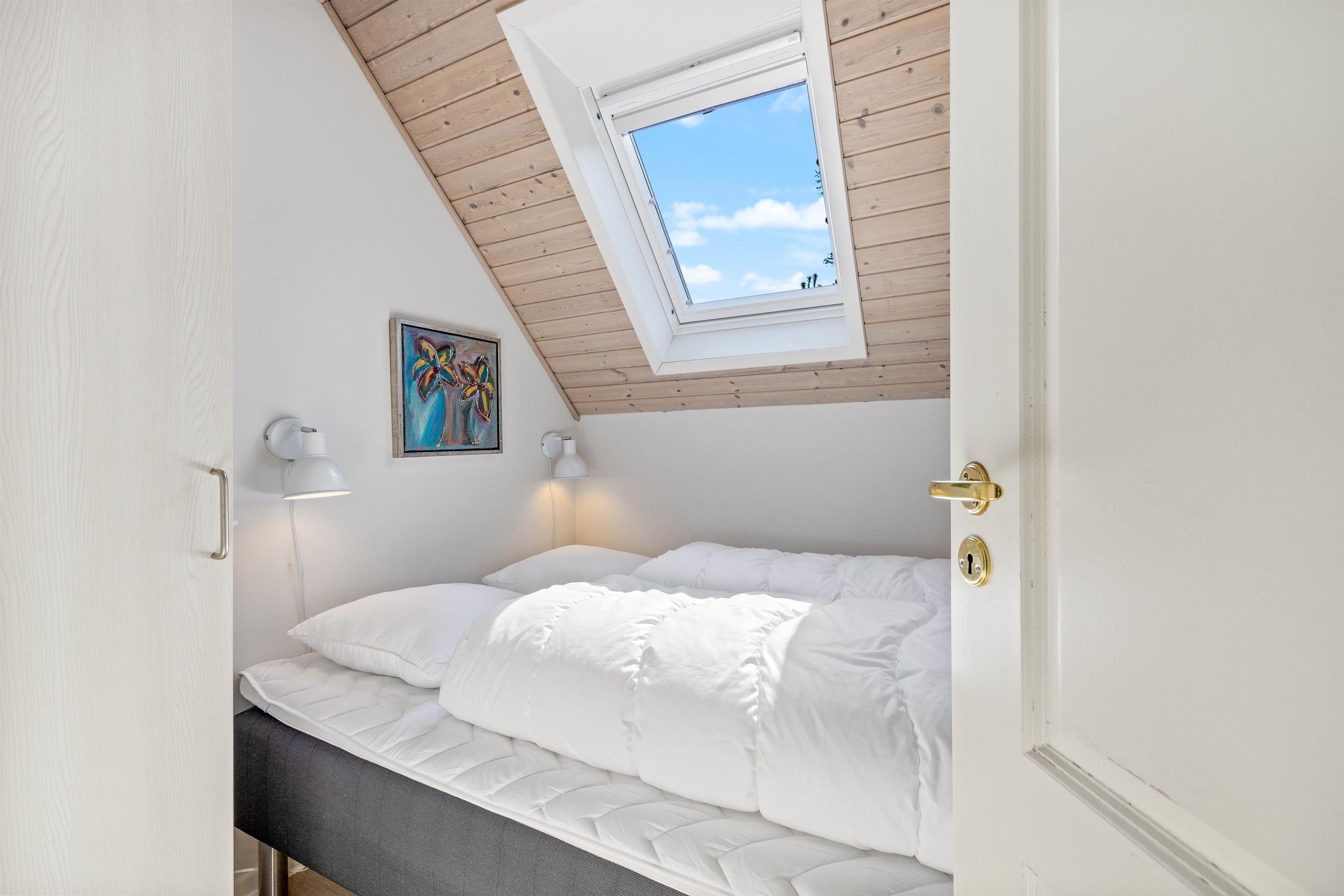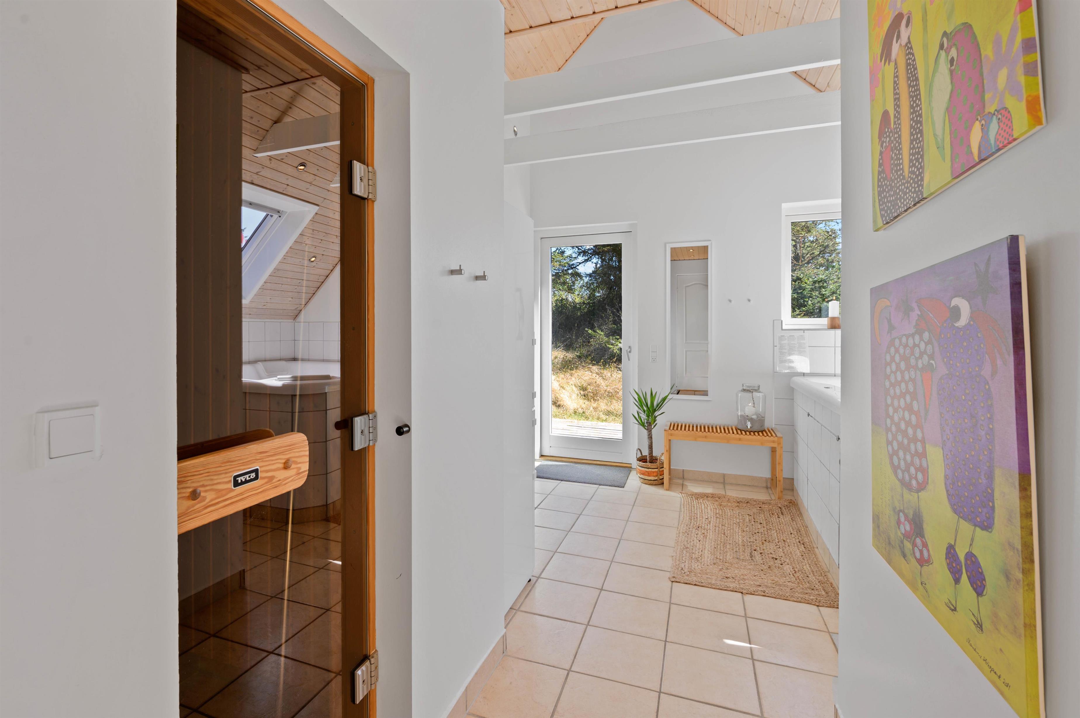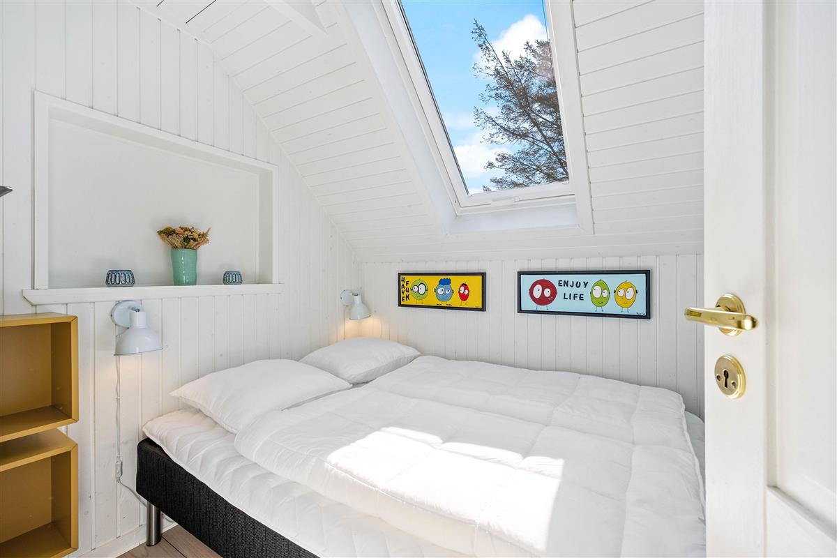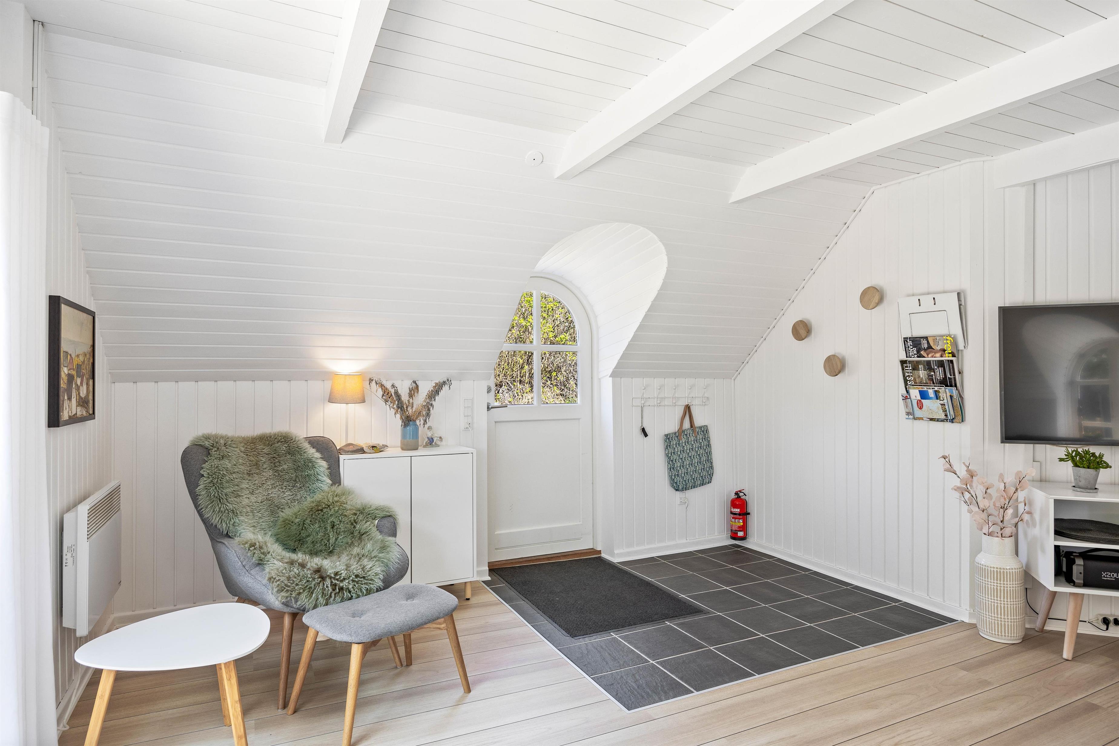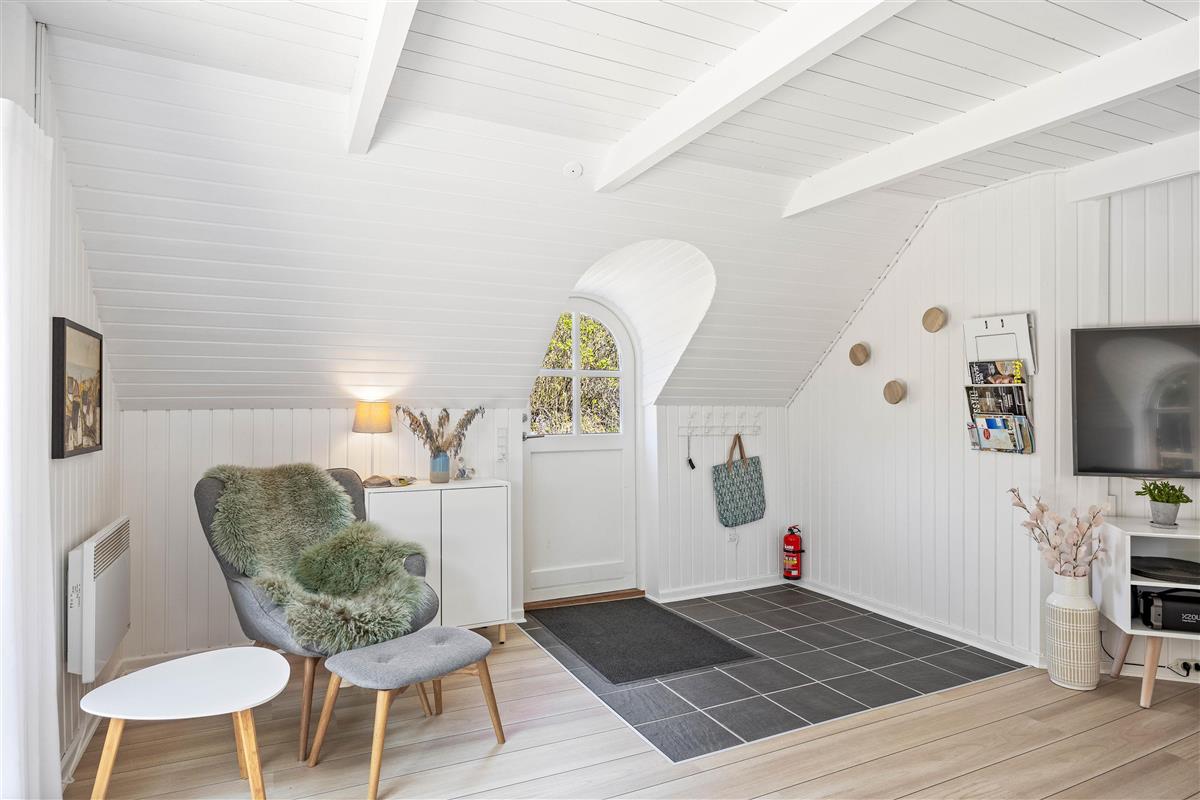 This excellent holiday home is located at Skovdalen 12, surrounded by a large terrace. The house enjoys a wonderfully peaceful position on a sheltered natural plot where you can enjoy your holiday in tranquility. The North Sea is just 500 metres from the holiday home.