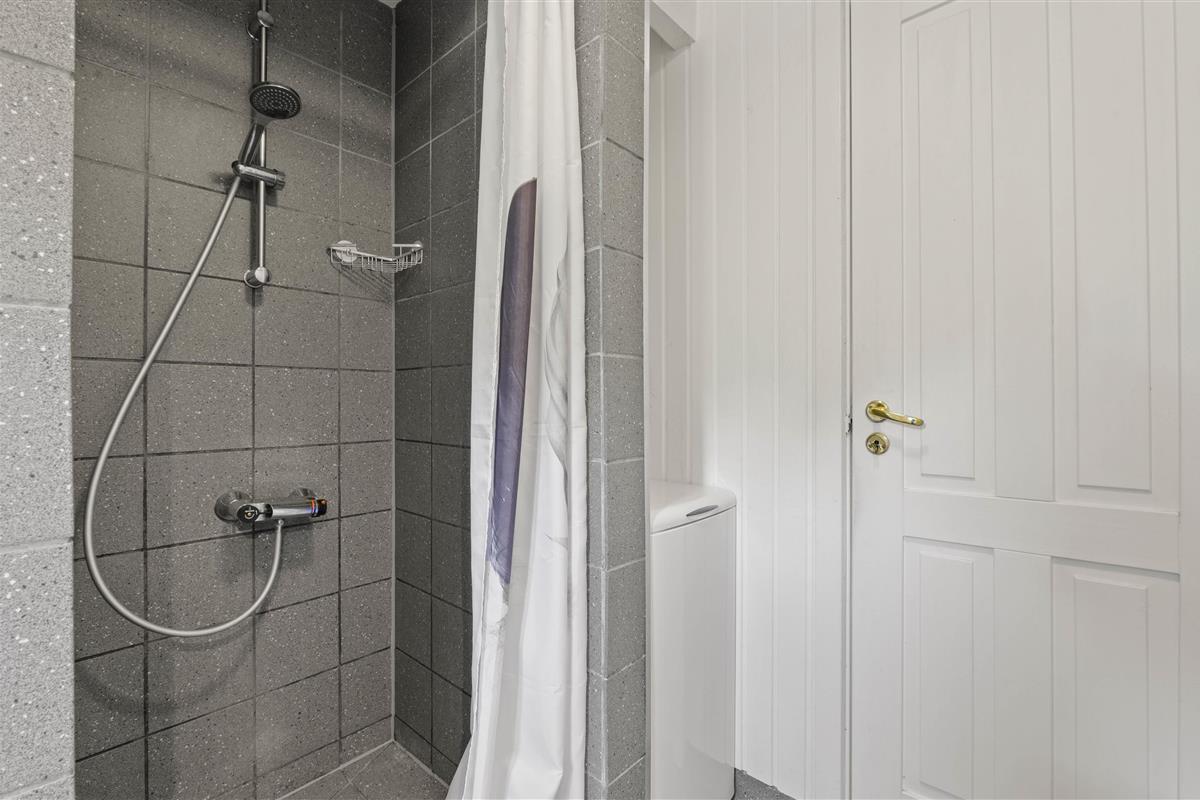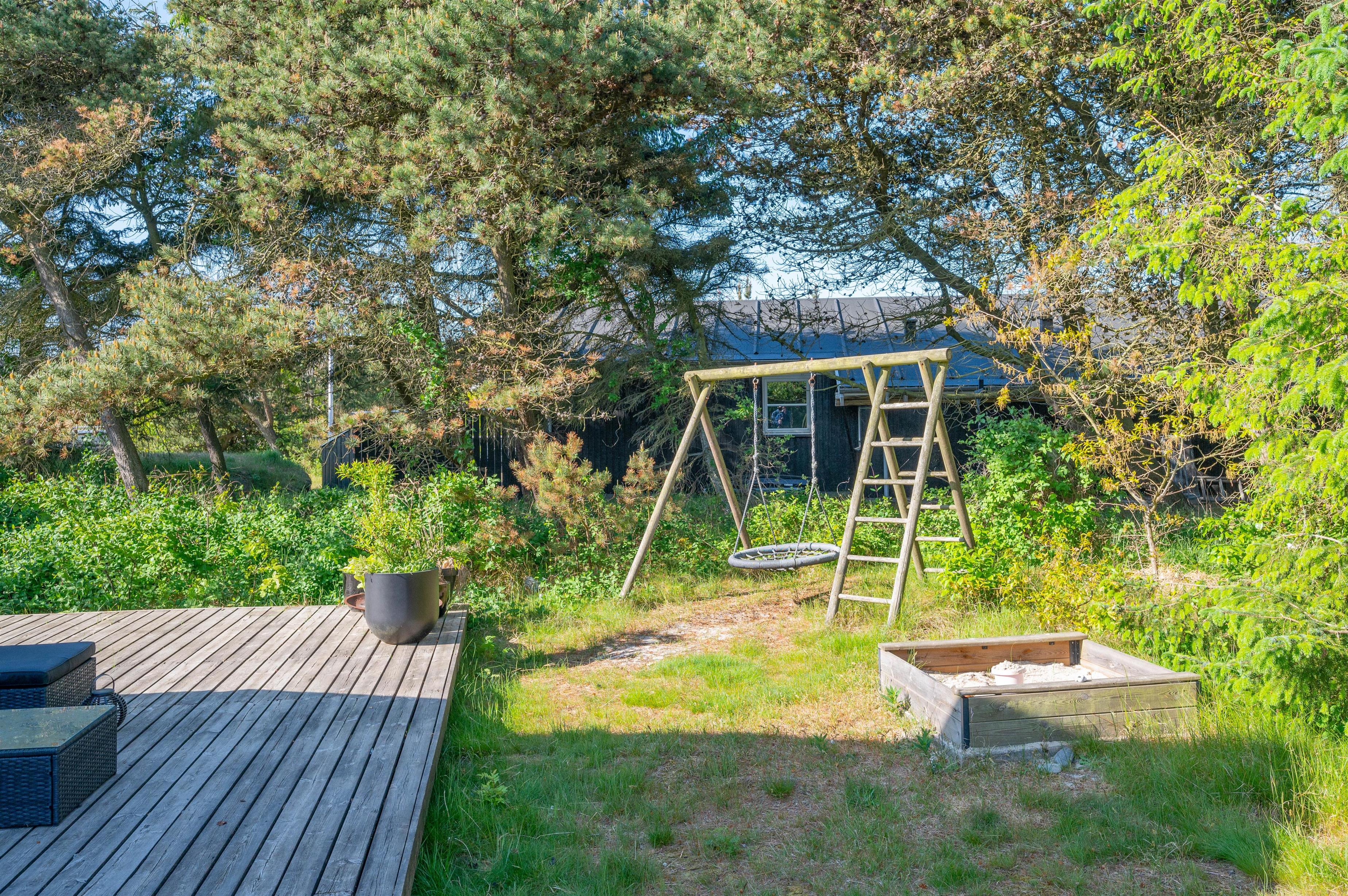 The house is surrounded by a large terrace, offering several sheltered spots to relax. Despite the tall trees, plenty of sunlight reaches the house. For younger guests, there's a swing and a sandbox.